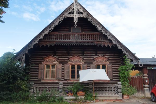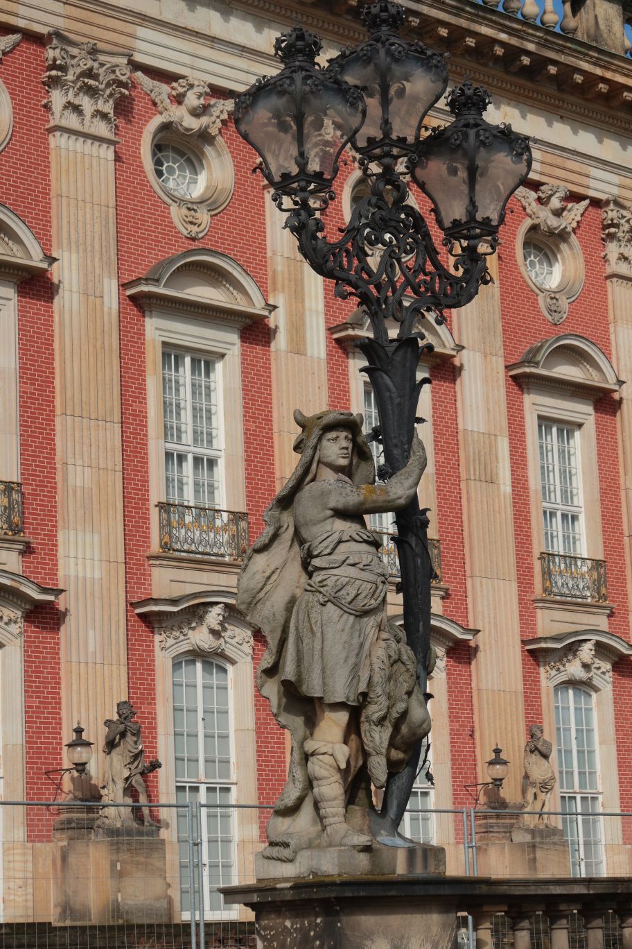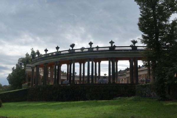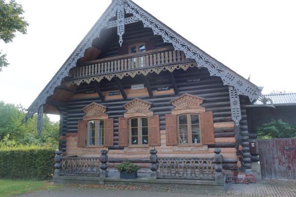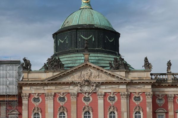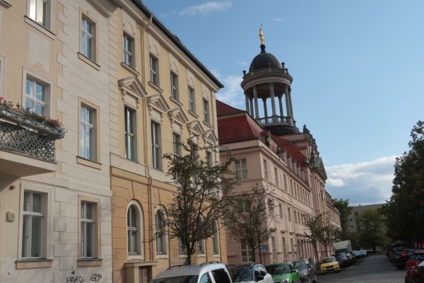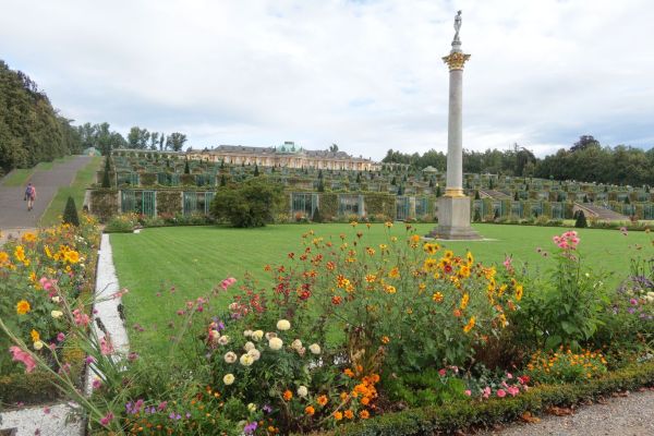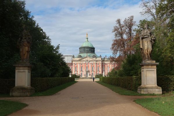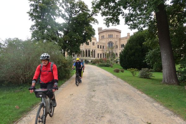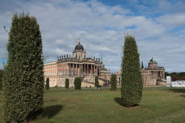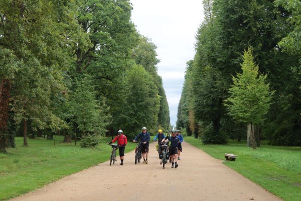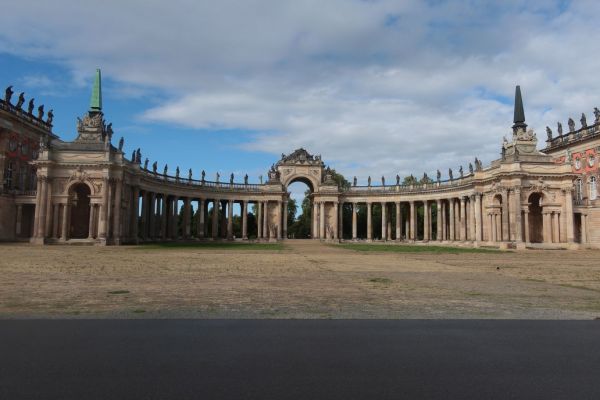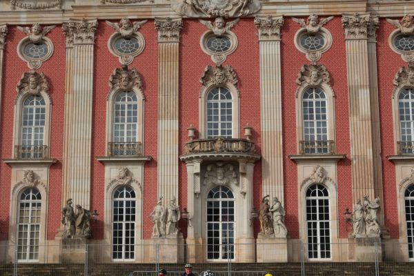 Die 2. Etappe begann mit einer kleinen Runde durch Potsdam: Stadtschloss, Alter Markt mit Nikolaikirche und dann durch das Potsdamer Brandenburger Tor. Das Kopfsteinpflaster der Altstadt forderte sein erstes Opfer: Edwin meldete einen platten Vorderreifen. Nach der Reparaturpause ging die Besichtigungstour weiter, direkt in den Schlosspark Sanssouci. Gruppenfoto vor der Freitreppe mit Schloss im Hintergrund. Die nächsten 1,5km im Park mussten wir schiebend zurücklegen. Erst beim Neuen Palais, der Sommerresidenz der preußischen Könige, konnten wir uns wieder auf den Sattel schwingen und die Tour fortsetzen. Vorbei am Orangerieschloß und der Rückseite von Schloß Sanssouci ging es zur nächsten Sehenswürdigkeit Potsdams, der russischen Kolonie Alexandrowka, die 1826 von König Friedrich Wilhelm III für die Mitglieder eines ehemaligen russisches Soldatenchors angelegt wurde.