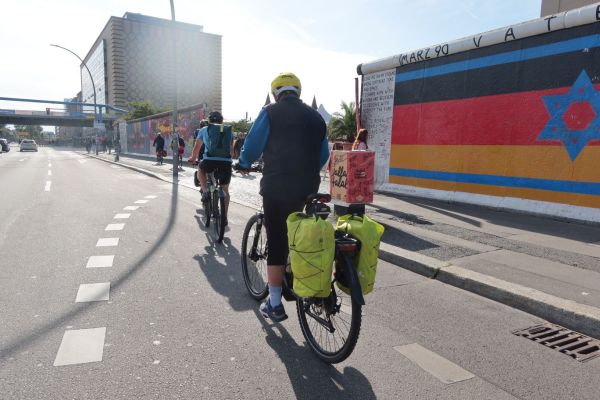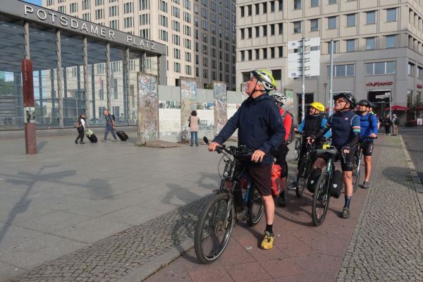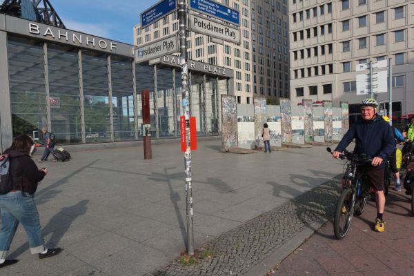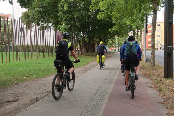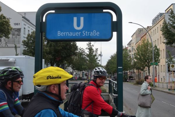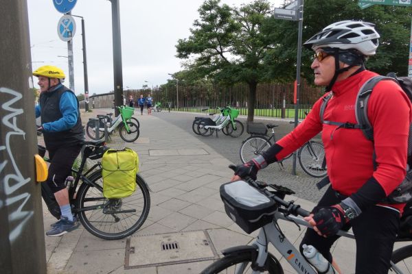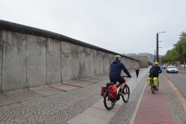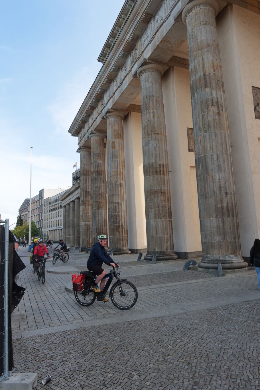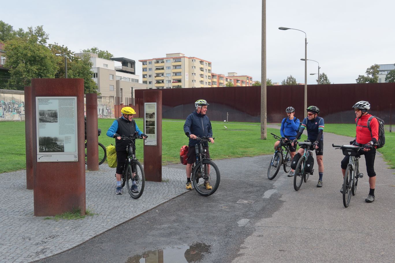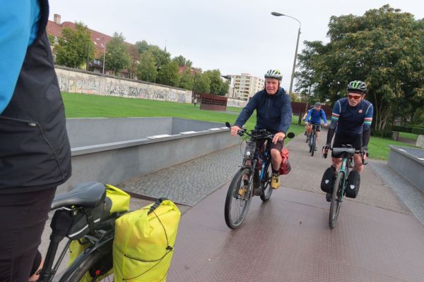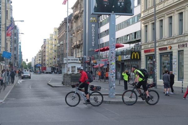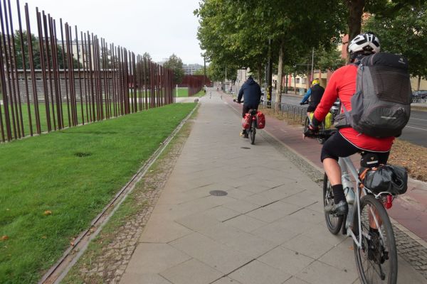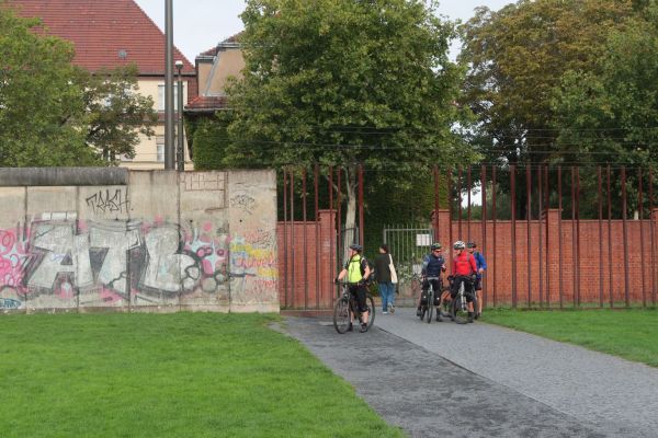 Die 3. Etappe führte erstmal dem Weg der innerstädtischen Mauer folgend quer durch Berlin. Dank der 2-reihigen Kopfsteinpflastermarkierung war der Mauerverlauf immer gut zu erkennen. Ein kurzer Stopp an der Gedenkstätte Bernauer Straße, an dem noch ein Stück Originalmauer erhalten ist, gewährte uns auch Einblicke in den Aufbau der Sperranlagen auf DDR-Seite. Über den Invalidenfriedhof ging es zum Humbolthafen und am Hauptbahnhof vorbei an die Spree. Nach Umrundung des Marie-Elisabeth-Lüder Hauses verließen wir das Regierungsviertel auch schon wieder und steuerten auf die Straße unter den Linden zu. Obligatorischer Fotostopp vor dem Brandenburger Tor und weiter zum Potsdamer Platz. Am Samstag Morgen herrschte wenig Autoverkehr, so dass die Fahrt durch die großen Verkehrsadern der Stadt weniger anstrengend als befürchtet war. Vorbei am Checkpoint Charlie in der Kochstraße ging es dann im Zickzack durch die Straßen Berlins bis in den Bezirk Treptow.