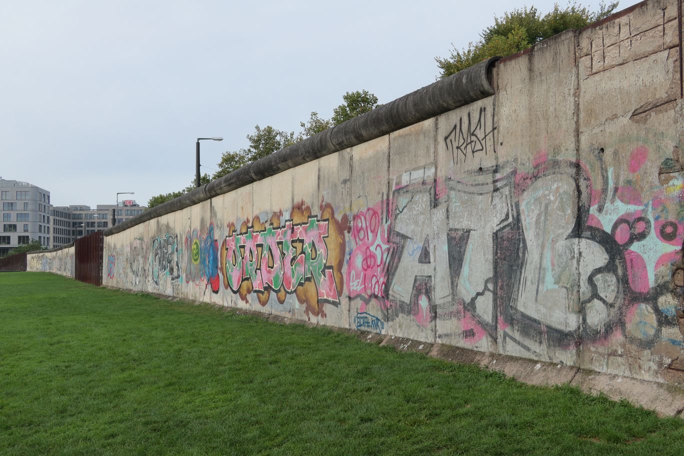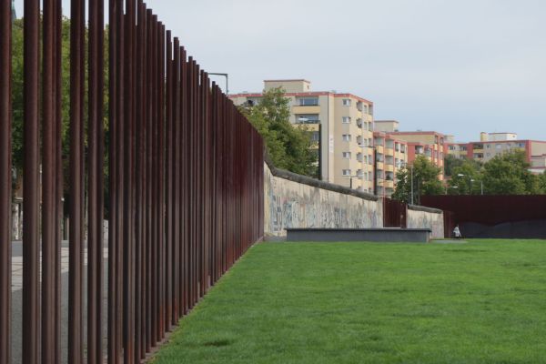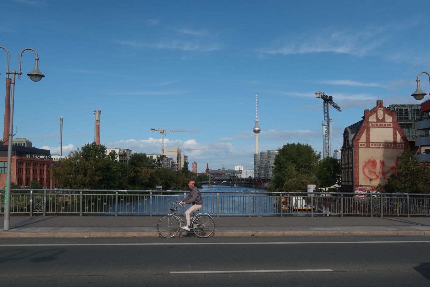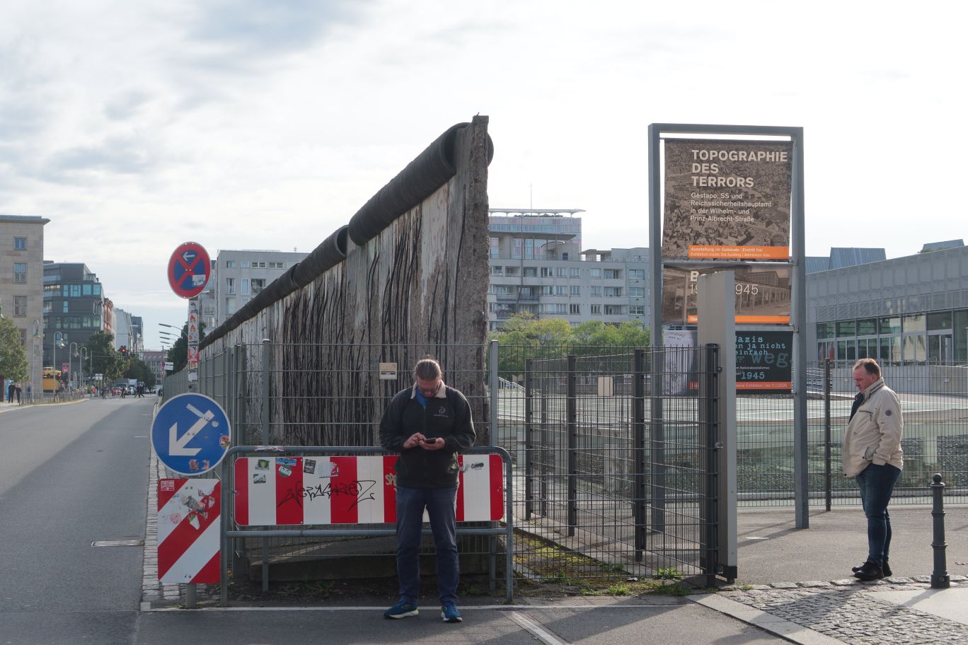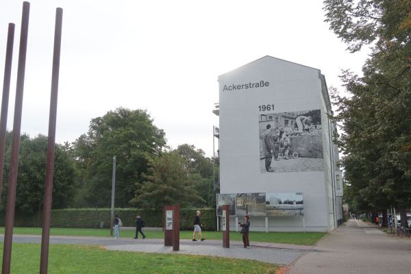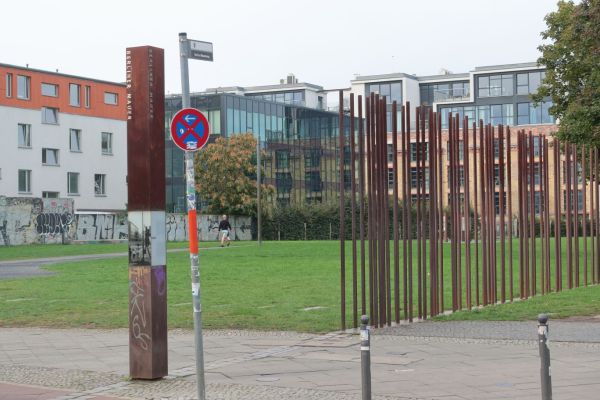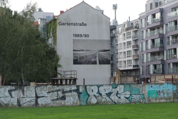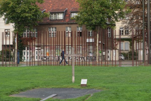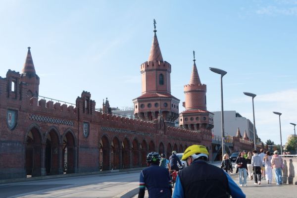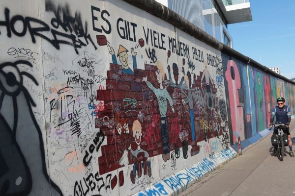 Die 3. Etappe führte erstmal dem Weg der innerstädtischen Mauer folgend quer durch Berlin. Dank der 2-reihigen Kopfsteinpflastermarkierung war der Mauerverlauf immer gut zu erkennen. Ein kurzer Stopp an der Gedenkstätte Bernauer Straße, an dem noch ein Stück Originalmauer erhalten ist, gewährte uns auch Einblicke in den Aufbau der Sperranlagen auf DDR-Seite. Über den Invalidenfriedhof ging es zum Humbolthafen und am Hauptbahnhof vorbei an die Spree. Nach Umrundung des Marie-Elisabeth-Lüder Hauses verließen wir das Regierungsviertel auch schon wieder und steuerten auf die Straße unter den Linden zu. Obligatorischer Fotostopp vor dem Brandenburger Tor und weiter zum Potsdamer Platz. Am Samstag Morgen herrschte wenig Autoverkehr, so dass die Fahrt durch die großen Verkehrsadern der Stadt weniger anstrengend als befürchtet war. Vorbei am Checkpoint Charlie in der Kochstraße ging es dann im Zickzack durch die Straßen Berlins bis in den Bezirk Treptow.