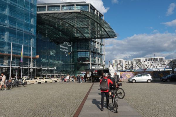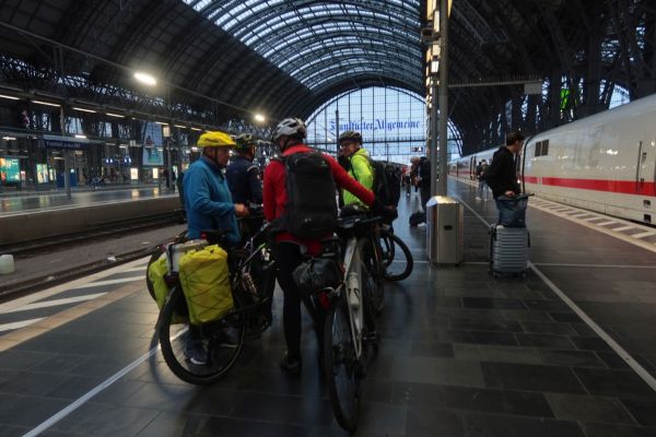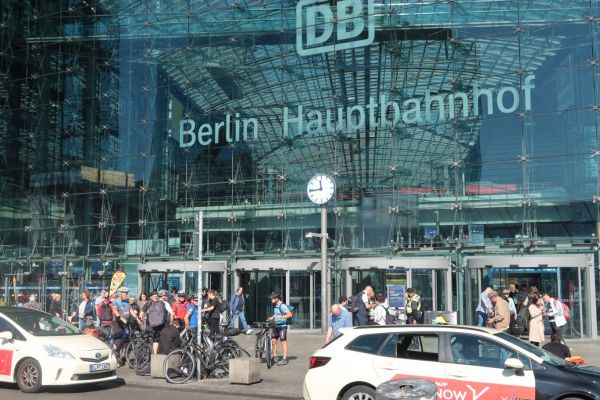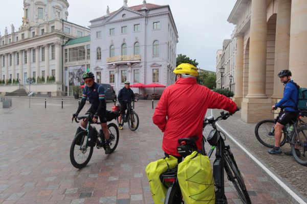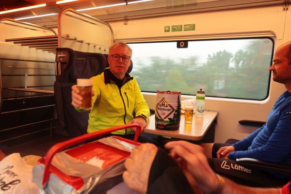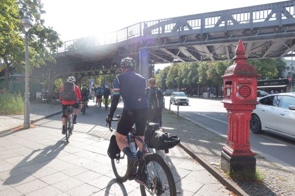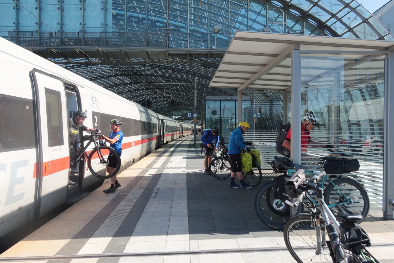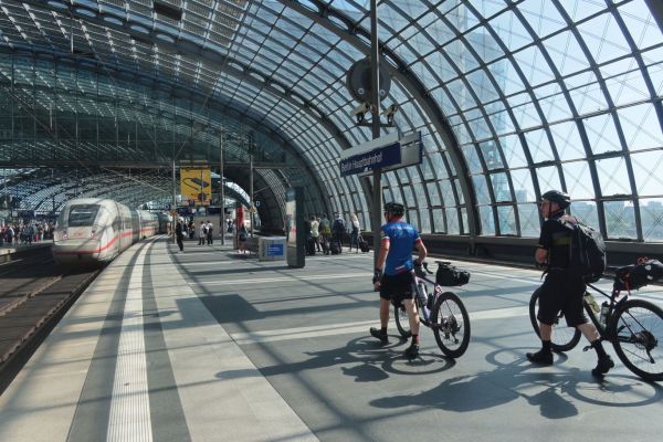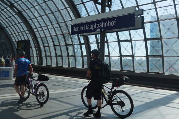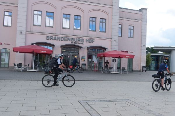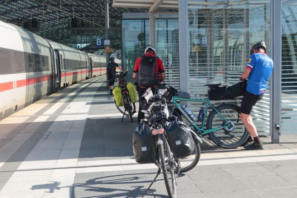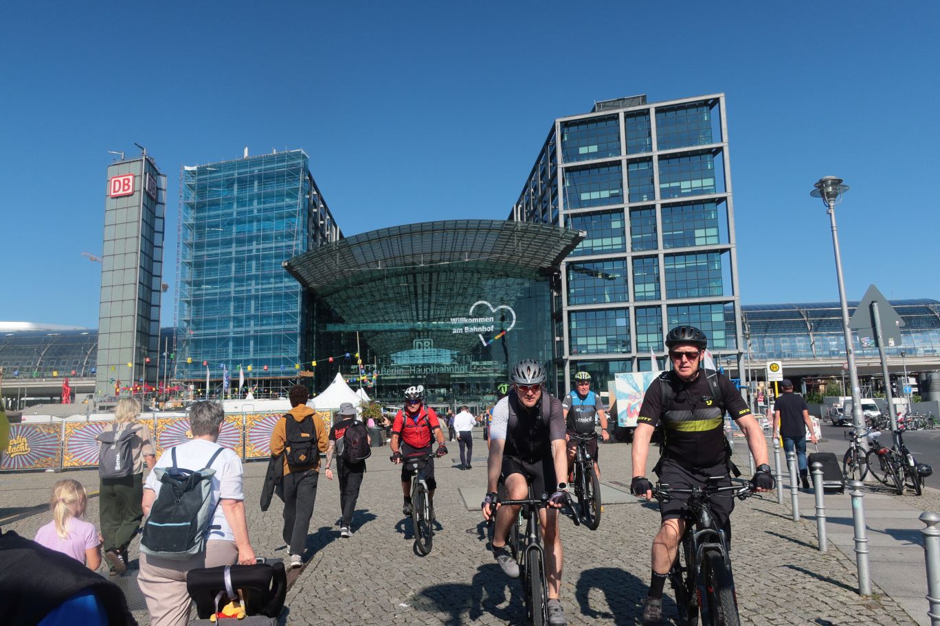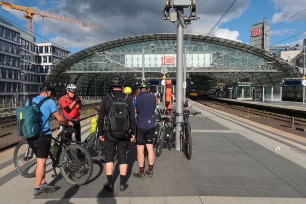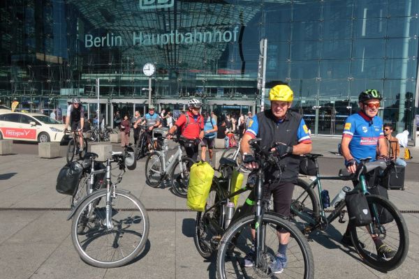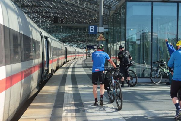 Früh aufstehen mussten die Teilnehmer, schon um 4:50 Uhr war Treffen auf dem Dorfplatz. Nach dem Einrollen an den Gießener Bahnhof ging es um 6:08 Uhr nach Frankfurt und von dort komfortabel im ICE und ohne weiteren Umstieg nach Berlin. Das obligatorische Frühstück mit heißer Fleischwurst und frisch Gezapften durfte natürlich auch nicht fehlen. So waren wir dann auch schon um 11:30 Uhr in Berlin. Zeit genug also für die ersten 37km nach Potsdam. Mathias erwartete uns vor dem Hauptbahnhof und mit Stefan, einem ehemaligen Kollegen von Klaus aus Berlin, wuchs das Fahrerfeld für die Auftaktetappe auf acht Mann an.
