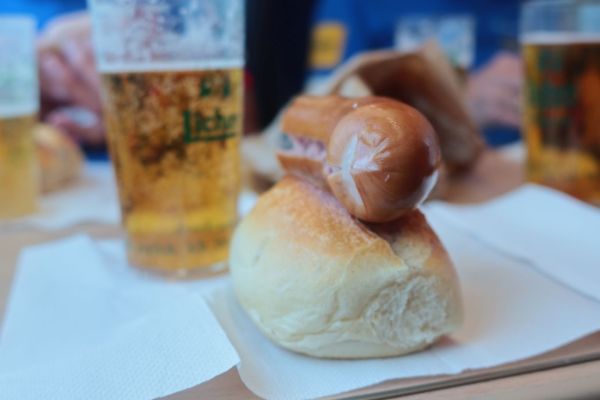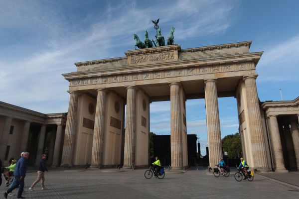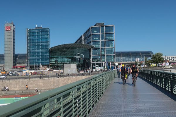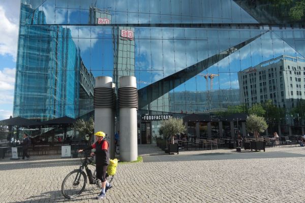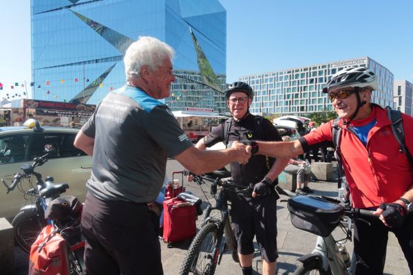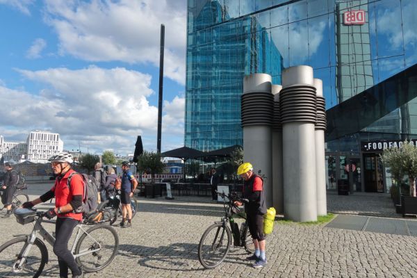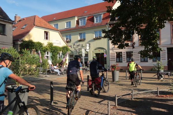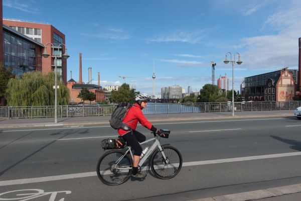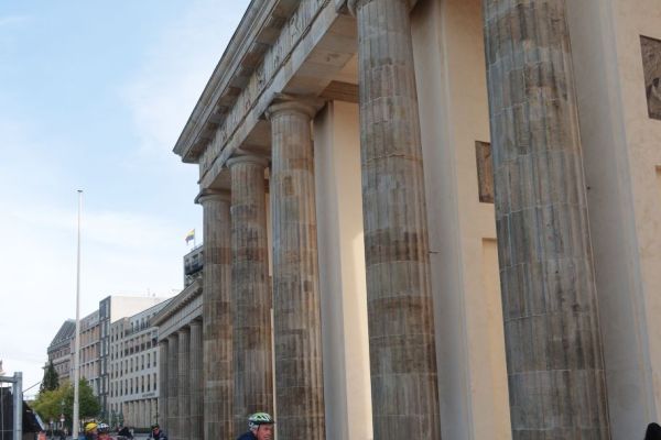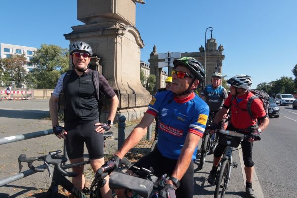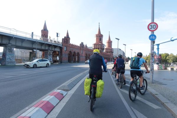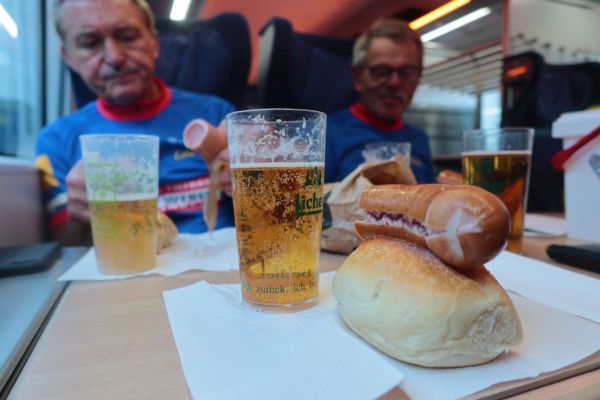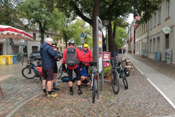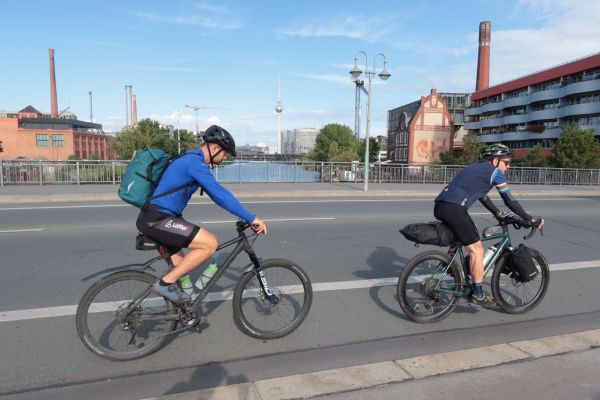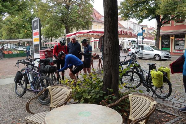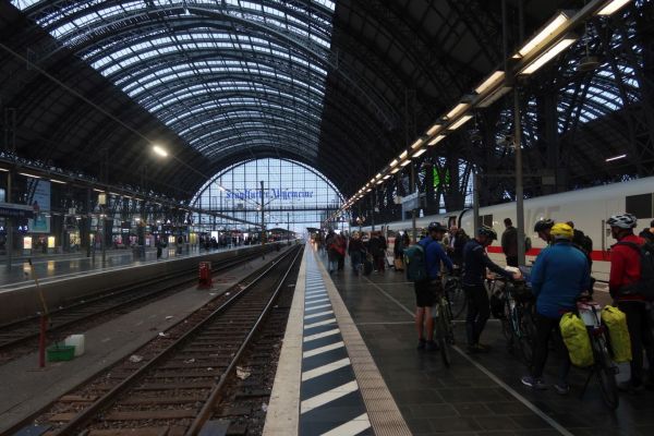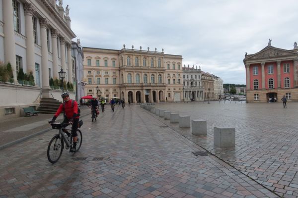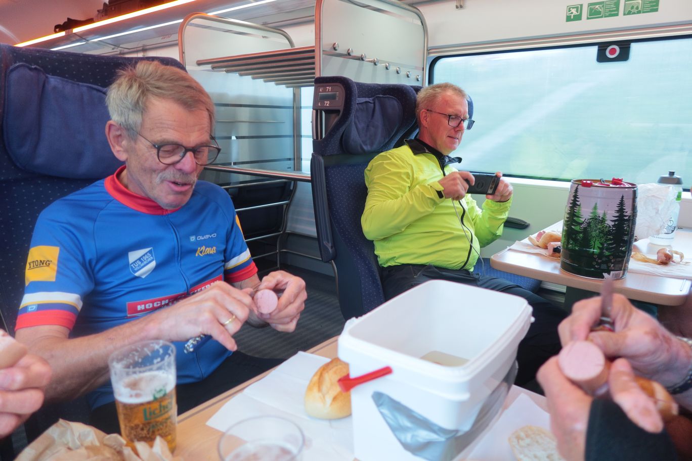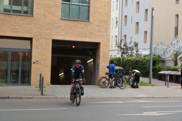 Früh aufstehen mussten die Teilnehmer, schon um 4:50 Uhr war Treffen auf dem Dorfplatz. Nach dem Einrollen an den Gießener Bahnhof ging es um 6:08 Uhr nach Frankfurt und von dort komfortabel im ICE und ohne weiteren Umstieg nach Berlin. Das obligatorische Frühstück mit heißer Fleischwurst und frisch Gezapften durfte natürlich auch nicht fehlen. So waren wir dann auch schon um 11:30 Uhr in Berlin. Zeit genug also für die ersten 37km nach Potsdam. Mathias erwartete uns vor dem Hauptbahnhof und mit Stefan, einem ehemaligen Kollegen von Klaus aus Berlin, wuchs das Fahrerfeld für die Auftaktetappe auf acht Mann an.
