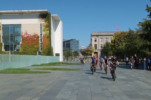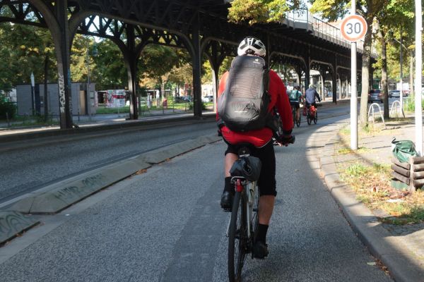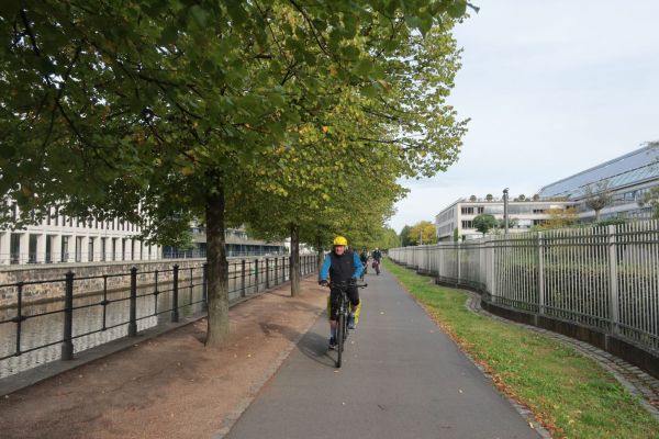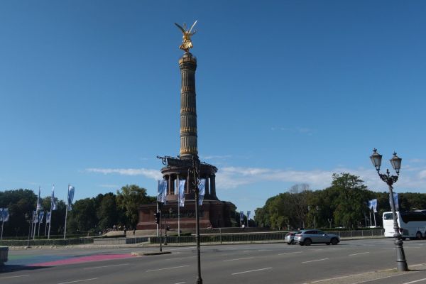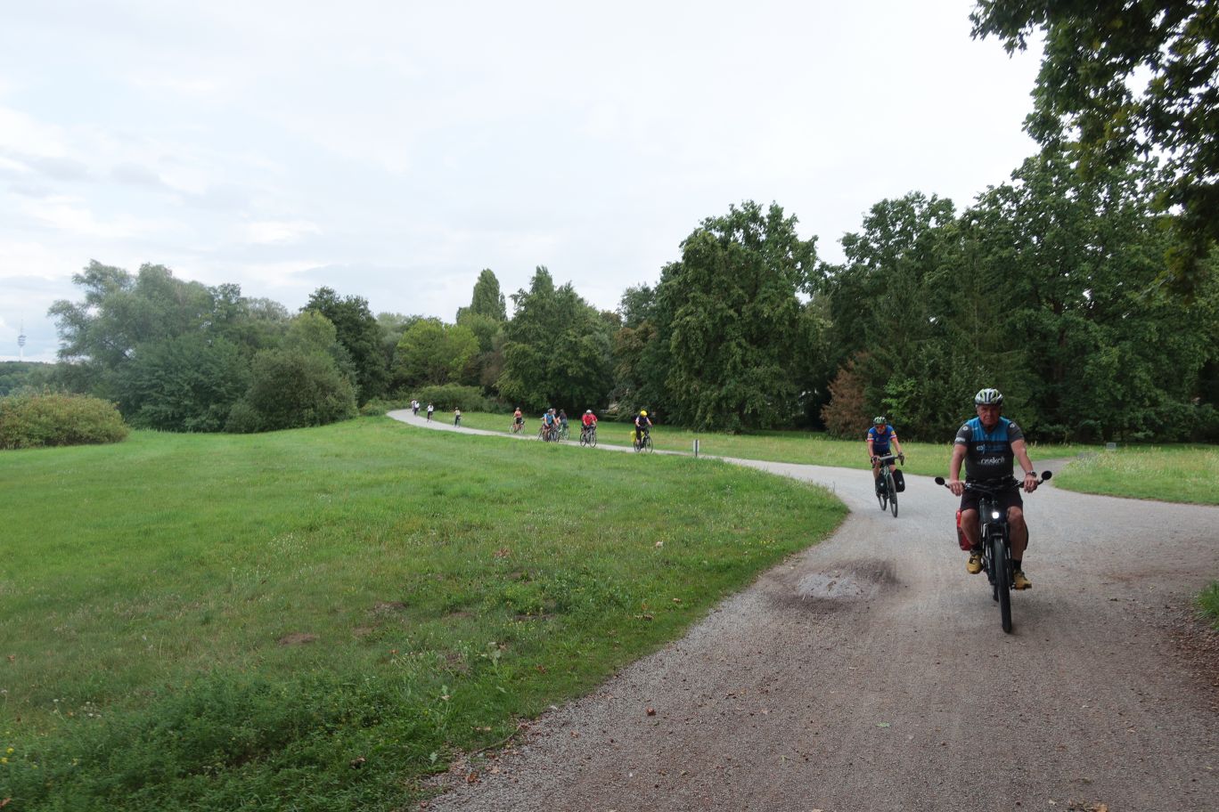 Vom Hauptbahnhof ging es über die Spree hinein ins Regierungsviertel, vorbei an Bundeskanzleramt und Reichstag auf die Straße des 17. Juni. Nun führte uns der Weg schnurkerzengerade nach Westen, nur unterbrochen durch die Kreisverkehre an der Siegessäule und dem Ernst-Reuter-Platz, sowie einer kurzen Kaffeepause. Im Bereich des Messegeländes war dann der Grunewald erreicht.
