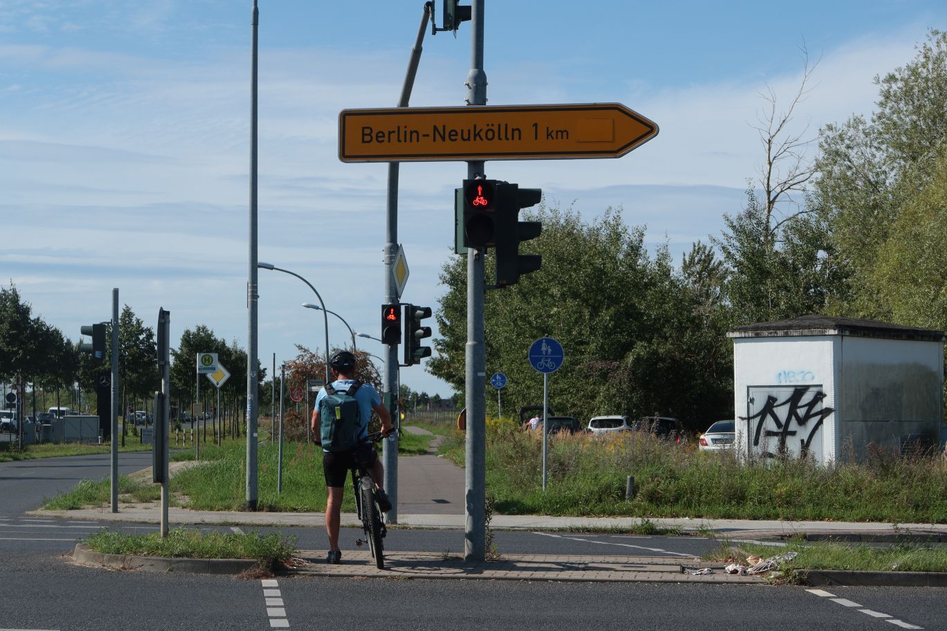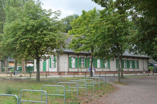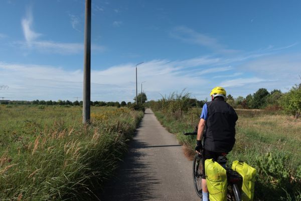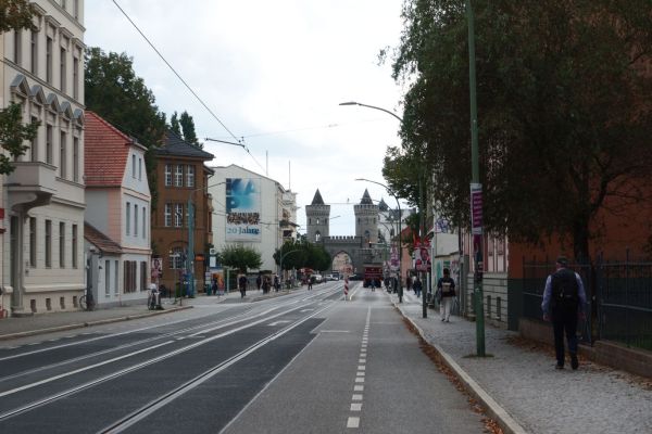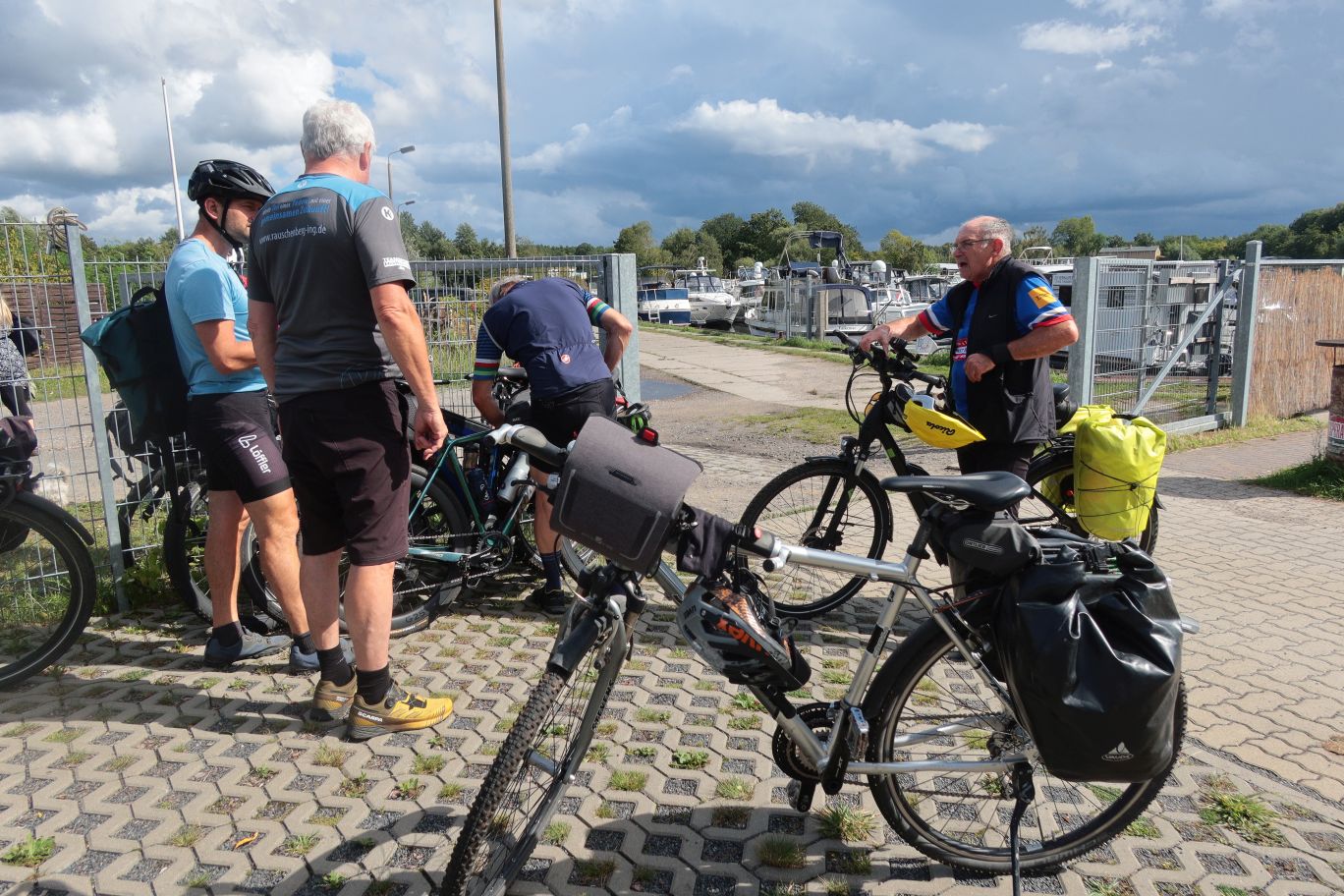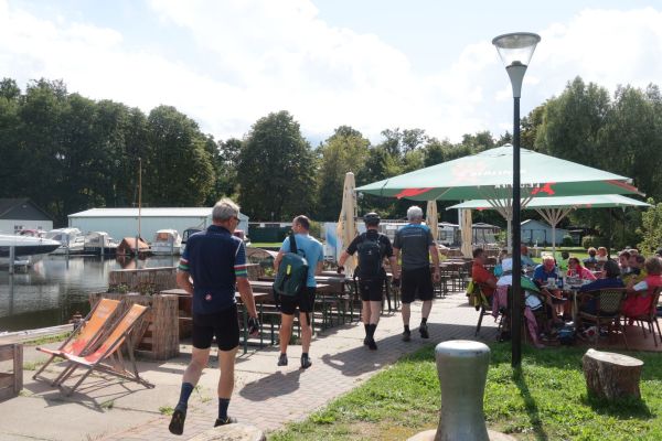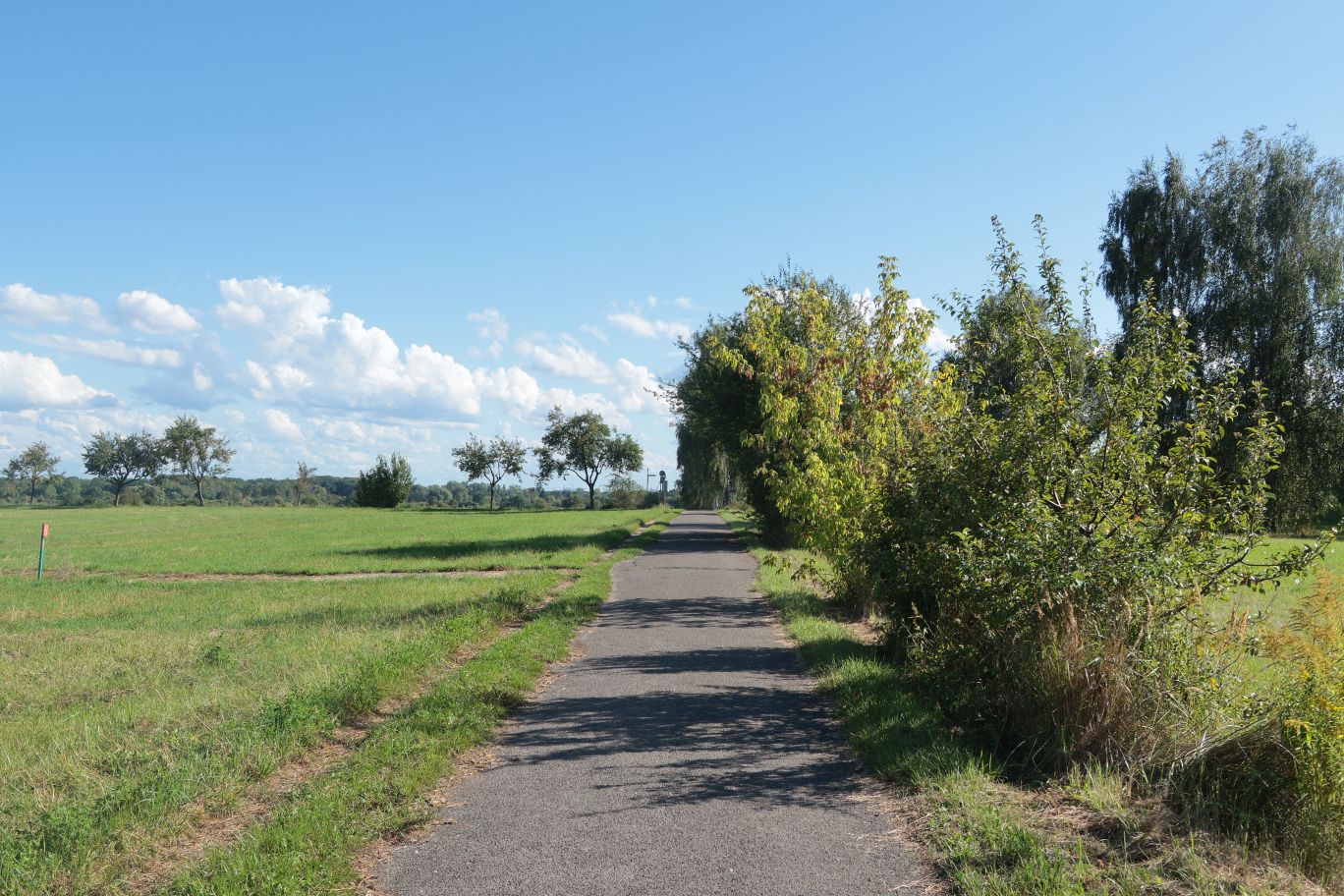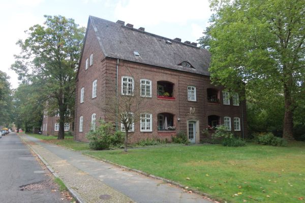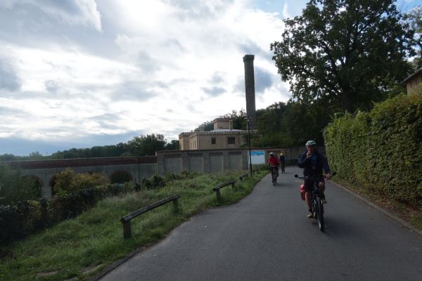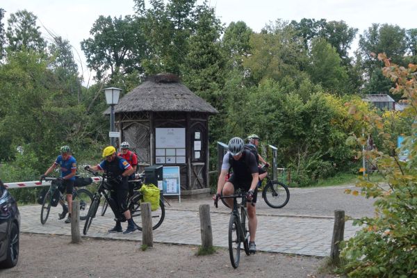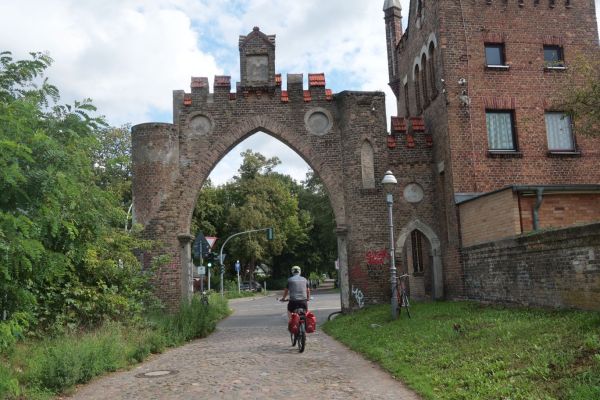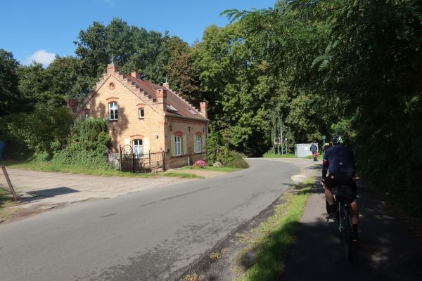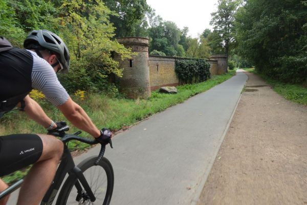 Nach so viel Kultur mussten wir erstmal Kilometer machen und verlorene Zeit aufholen, schließlich war unsere heutige Etappe ja über 90km lang . Dem Mauerweg folgend führte ein langes Waldstück in einem großen Bogen um Jungfernsee, Krampnitzsee und Lenitzsee bei Sacrow an die Havel. Über Groß-Glienicke setzen wir den Weg bis Spandau fort. Die Berliner Vorstand umrundeten wir und fuhren durch weitläufige Felder und malerische Wiesen nach Henningsdorf. Es kam Hunger auf und wir fanden eine passende Lokalität für die Mittagspause direkt am Radweg. Leider war das Essensangebot wegen des bevorstehenden Saisonendes deutlich eingeschränkt. Ein paar Pommes mussten reichen. Mit der Invalidensiedlung in Hohen-Neuendorf erreichten wir den nördlichsten Punkt der Tour. In den 1930er Jahren wurden hier 50 behindertengerechte zweigeschossige Klinkerbauten sowie Wirtschafts- und Gemeinschaftsgebäude für Versehrte des Ersten Weltkriegs gebaut.