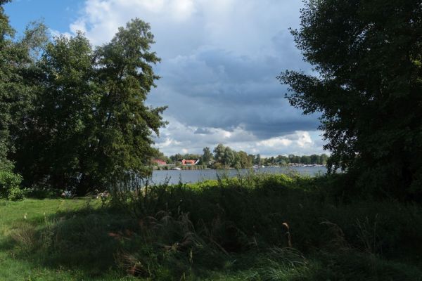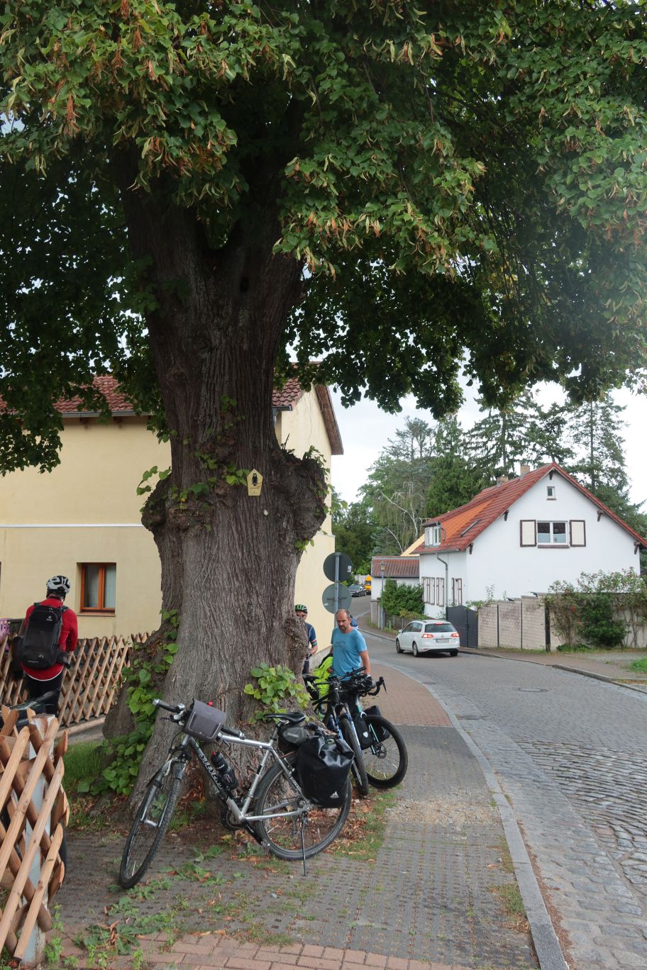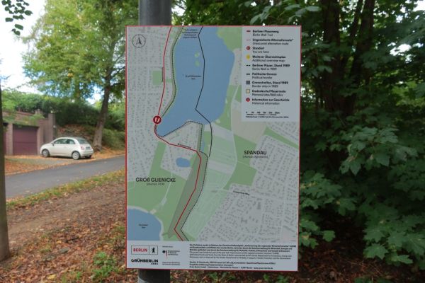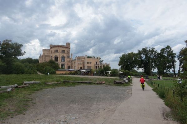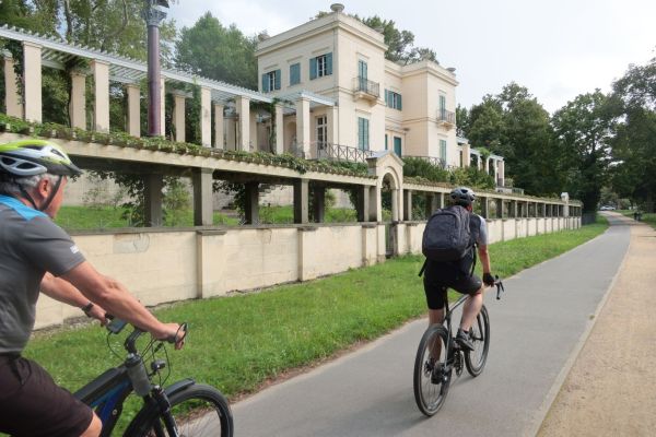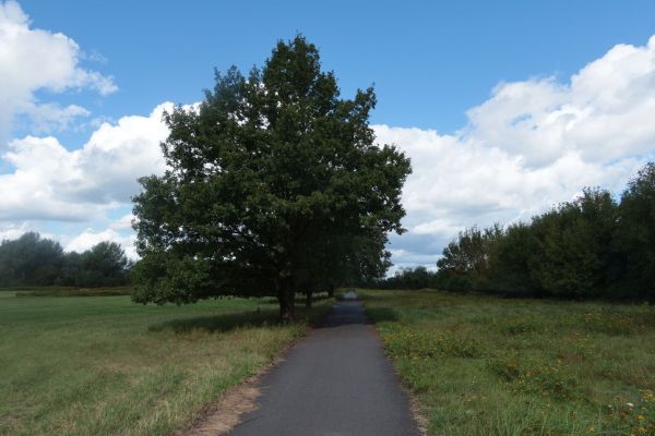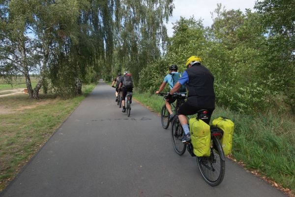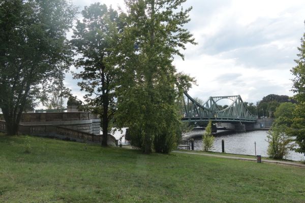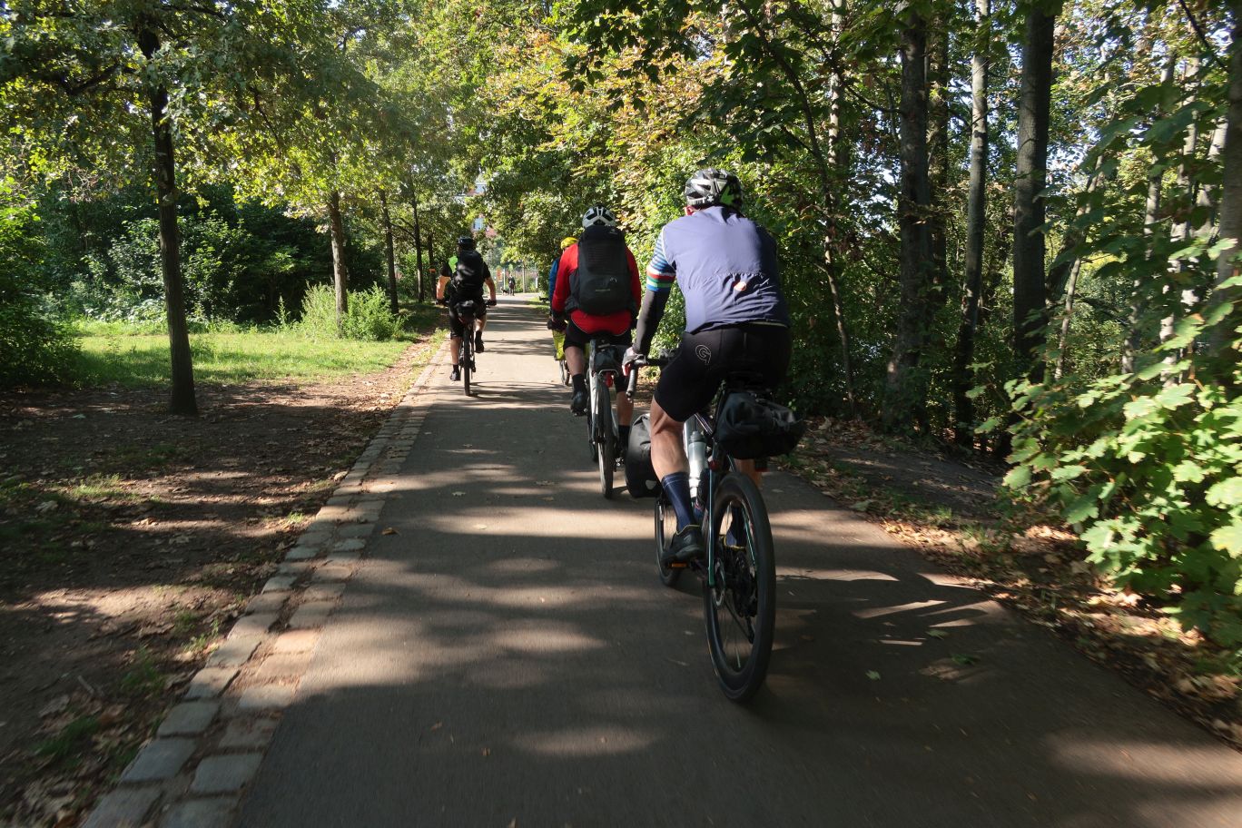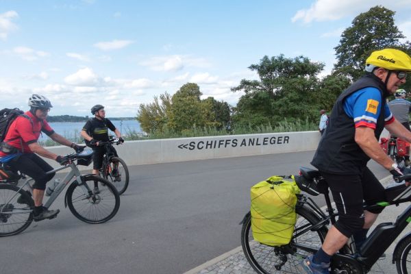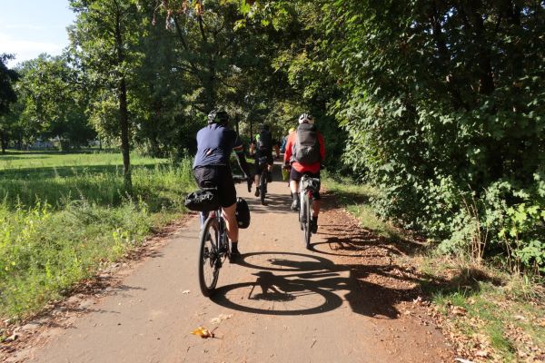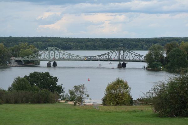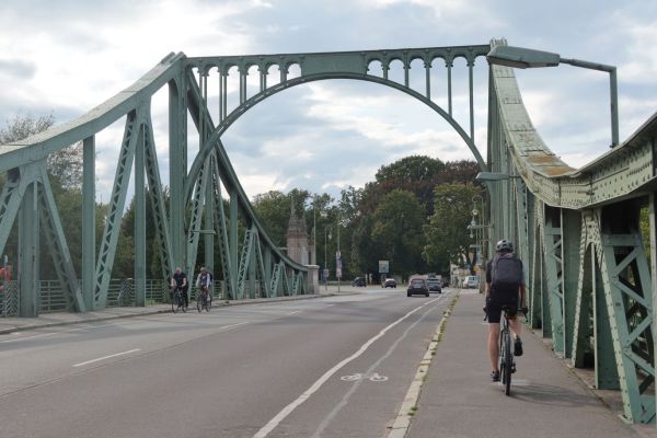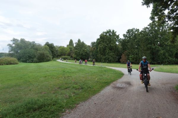 Auf ein langes Stück durch eine schöne Parkanlage folgte ein Teilstück entlang des Britzer Verbindungskanals. Hier erinnert eine Stele an Chris Gueffroy, das letzte Todesopfer an der Mauer. Wir bogen nach Südosten ab und folgten dem Radweg zwischen Autobahn A113 links und Teltowkanal rechts bis Schönefeld. Nach dem Flughafen wurde es wieder ländlich, ursprüngliche Natur direkt vor den Toren der Stadt. Am Rande Südberlins entlang schlängelte sich der Radweg dann weiter Richtung Westen, auf der rechten Seite meistens bebautes Gebiet und auf der linken Seite weite Felder und Wiesen. Teilweise führte der Weg auf dem ehemaligen Kolonnenweges mit charakteristischen Betonplatten entlang, den die DDR-Grenztruppen für ihre Kontrollfahrten nutzten. Im Bezirk Zehlendorf erreichten wir wieder den Teltowkanal, dem wir ein Stück folgten aber für die Umfahrung von Kleinmachnow wieder verließen. Auf sandigem Untergrund gings weiter durch ein Waldstück am ehemaligen Grenzübergang Dreilinden vorbei. Wir folgen einer Trasse der ehemaligen Reichsautobahn 51, auch bekannt als "AVUS-Zubringer", die bis 1969 in Betrieb war. Auf der Brücke über den Teltowkanal ist noch der Fahrbahnbelag nebst Markierungen des Kontrollpunktes Checkpoint Bravo vorhanden. Hier warteten wir einen kleinen Regenschauer ab und setzten die Fahrt Richtung Potsdam weiter fort. Entlang des Griebnitzsees säumten wieder zahlreiche Villen unseren Weg. Vom Schloss Babelsberg bot sich ein toller Blick auf die Glienicker Brücke. Durch den Park ging es weiter in die Innenstadt von Potsdam und dort auf den Havelradweg. Da im Regenradar ein neues Regenband auf uns zukam, hielten wir das Tempo hoch und fuhren über Caputh nach Ferch am südlichen Ende des Schwielowsees. Dort holte uns der Regen ein. Eine alte Linde spendet etwas Schutz, wir entschieden uns aber in einem nahegelegenen Gasthaus einzukehren und zu warten bis der Regen vorbei ist. Auf Regen folgte Sonne und so konnten wir die letzten 12km bis zum Hotel auf der Fischerinsel von Werder trocken zurücklegen. 102km, 330 Höhenmeter war die Bilanz des Tages.