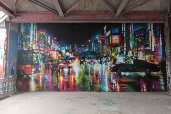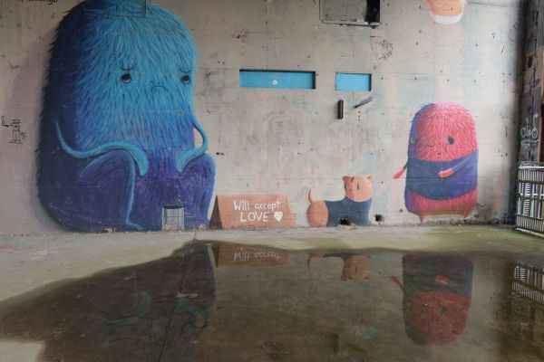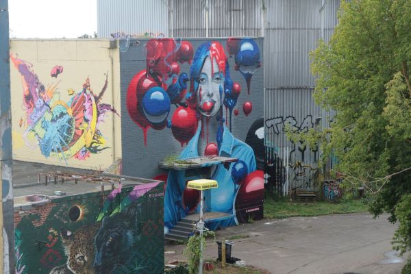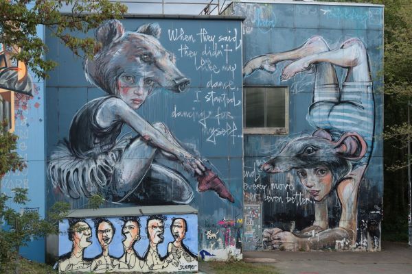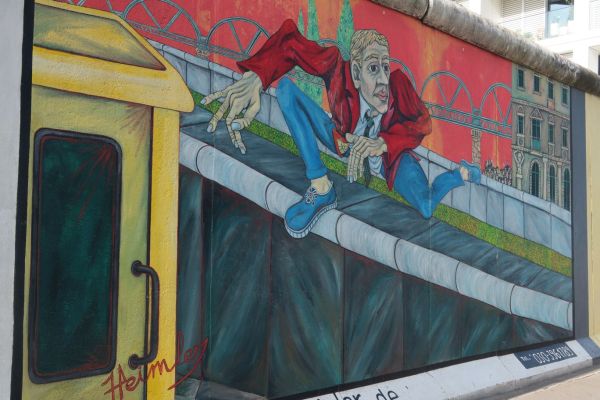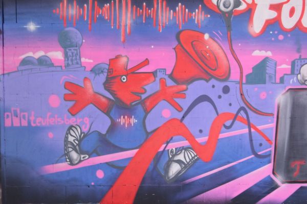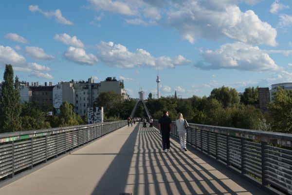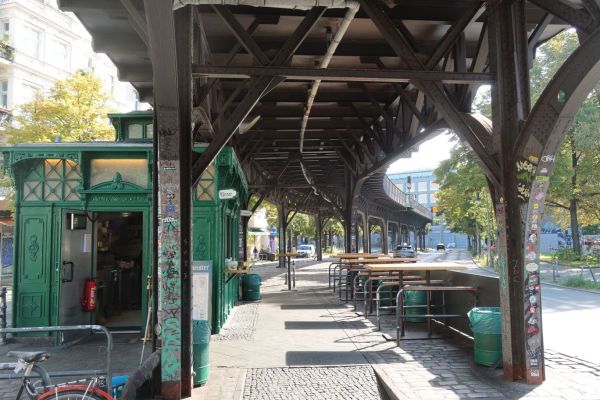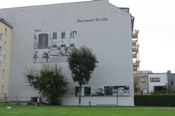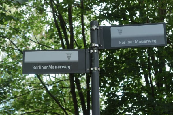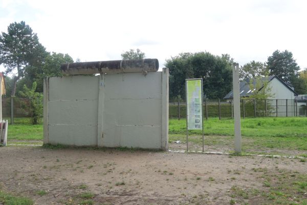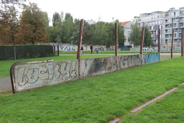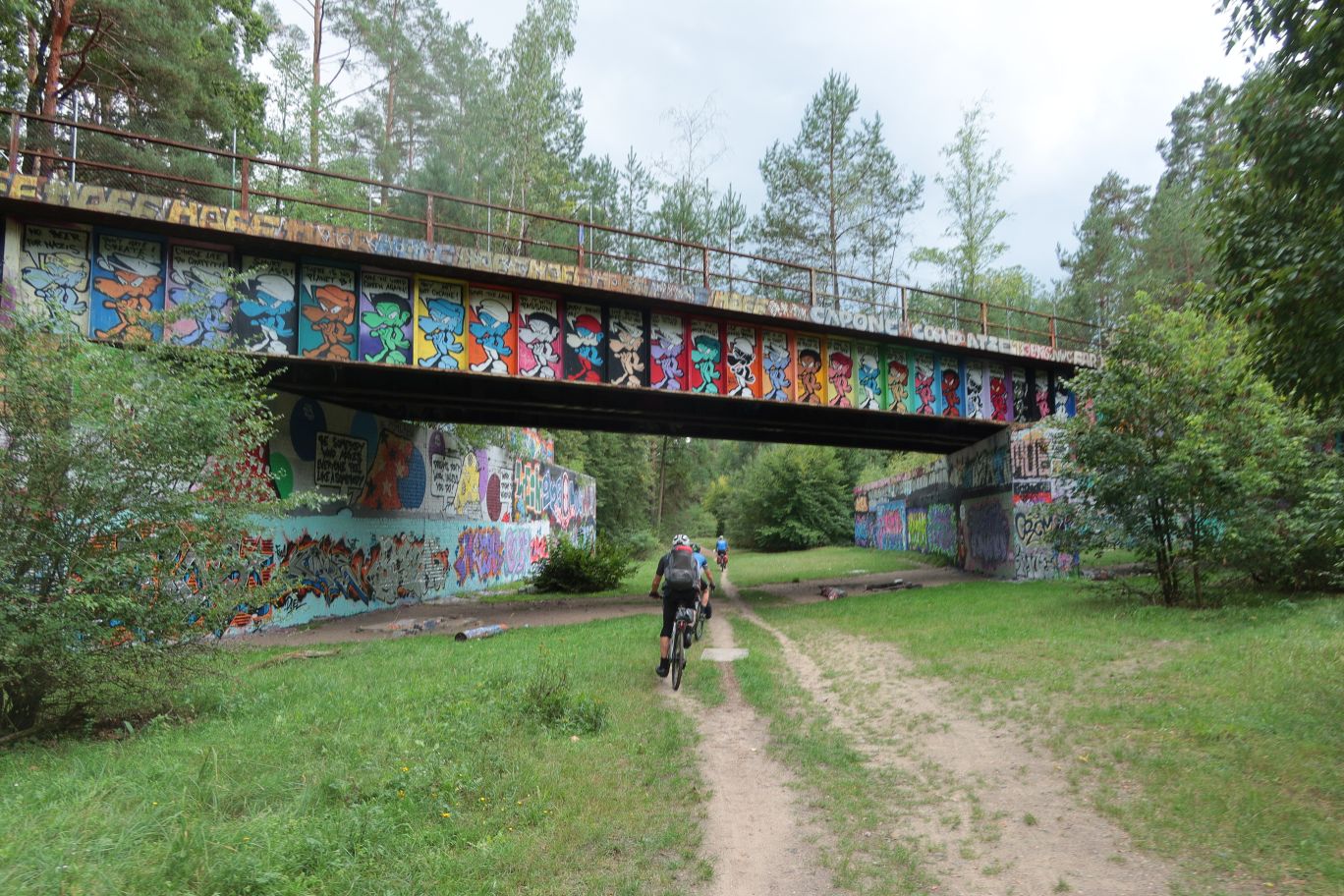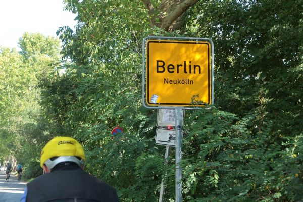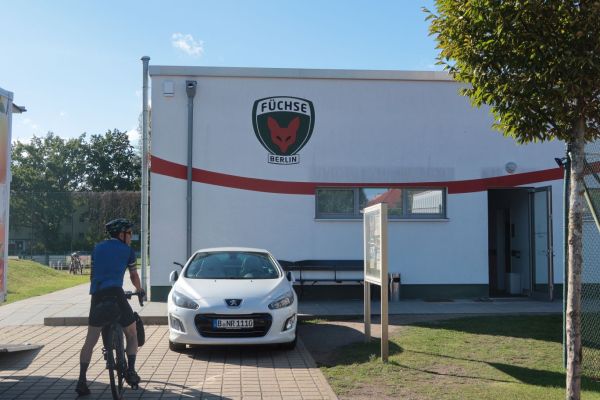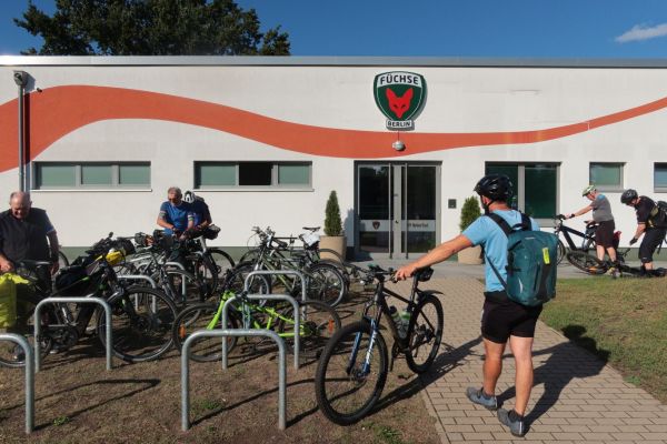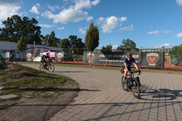 Das kurze Stück durch bewohntes Gebiet kam wie gerufen, eine Tankstelle bot Schutz vor einer heranziehenden Regenwolke. Nach dem kurzen Schutt gings weiter, wieder durch ein Waldstück, aber diesmal mit Kopfsteinpflaster. Keine Ahnung wer auf diese blöde Idee kam hier auch die Waldwege zu pflastern…. Nach einer Stadtpassage durch Glienicke/Nordbahn kam nochmal ein schöner naturnaher Abschnitt entlang von Wiesen und Feldern. Im Bezirk Reinickendorf waren wir dann endgültig im städtischen Bereich angekommen. Dem Sportlerheim der Reinickendorfer Füchse statteten wir einen Besuch ab, wir mussten ja nachschauen, ob der TUS Wimpel aus den 1970er Jahren noch da hängt, der anlässlich eines Spiel TUS gegen den Berliner Sportclub ausgetauscht wurde. Den Wimpel fanden wir nicht, die Geschäftsstelle war auch geschlossen, aber Kaffee und leckeren Kuchen gab es. Unter der Böse Brücke hindurch, wo am 9. November 1989 der Grenzübergang Bornholmer Strasse für DDR Bürger geöffnet wurde, führte der Weg in den Mauerpark, an dessen anderem Ende auch schon unser Hotel lag. Für die Statistik: 93km 390 Höhenmeter.
