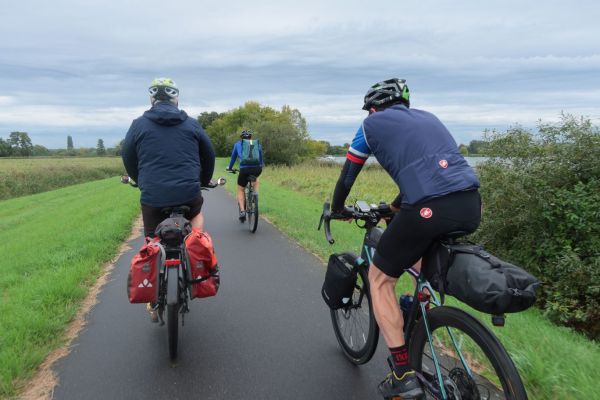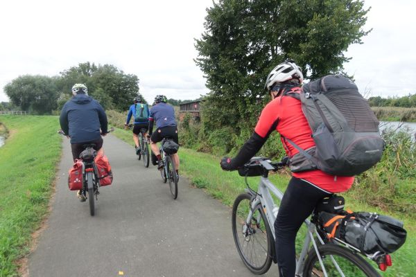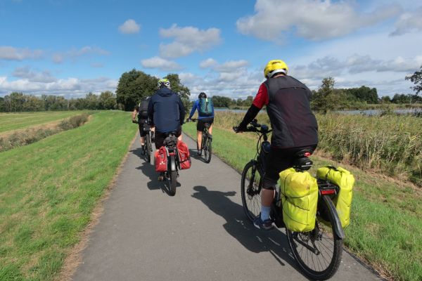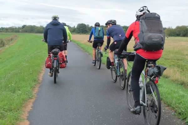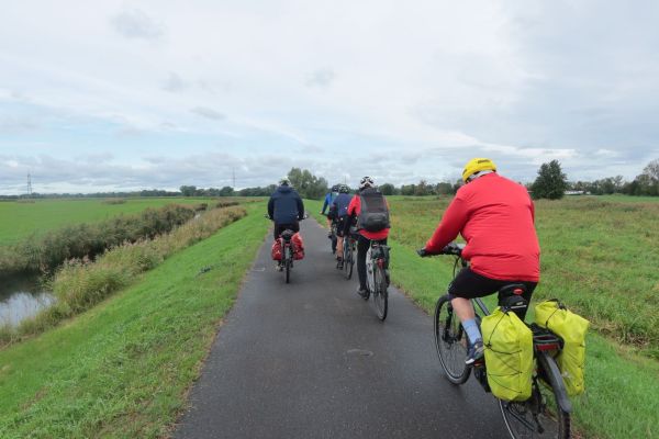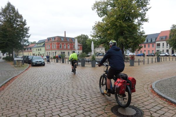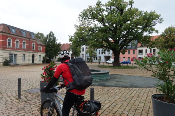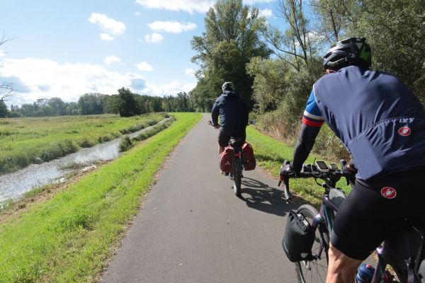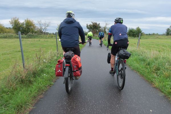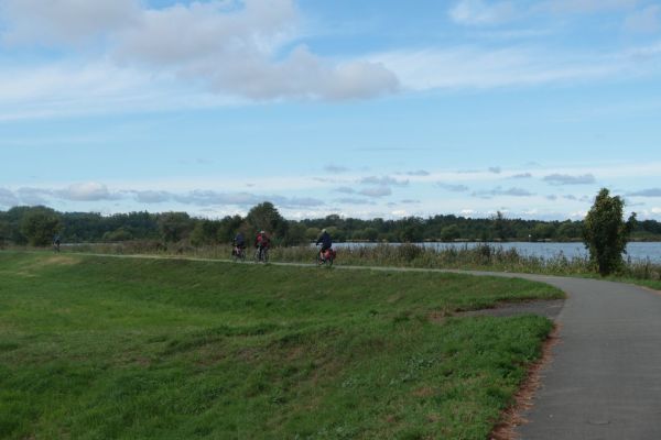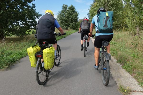 Die Wetterprognose für die letzte Etappe war etwas durchwachsen. Zum Frühstück regnete es noch. Wir entschieden uns dafür eine halbe Stunde später als gewohnt zu starten. Wir folgten dem Havelradweg und fuhren durch viel Natur. Meist oben auf dem Deich boten sich schöne Ausblicke auf grüne Wiesen und den Fluss. Auch das Wetter wurde besser und nach der Hälfte der Strecke hatten wir wieder blauen Himmel. Nach 42km erreichten wir den Bahnhof von Brandenburg/Havel, wo wir uns von Mathias verabschiedeten. Wir stiegen in den nächsten Zug nach Berlin und nutzten den Aufenthalt vor Abfahrt unseres ICEs um etwas zu essen.