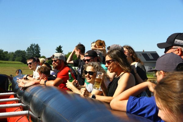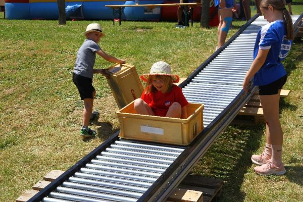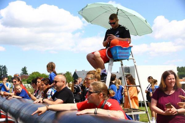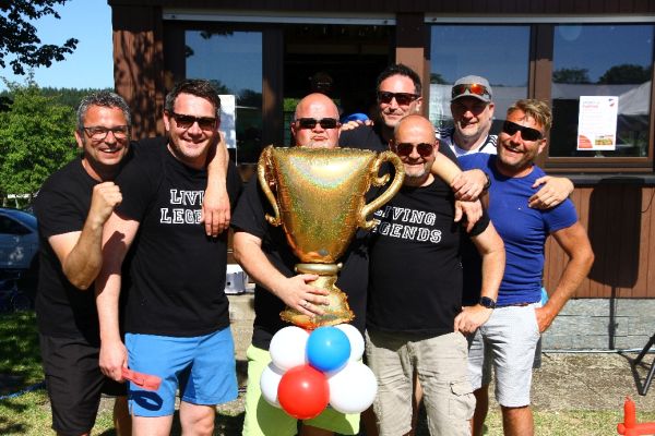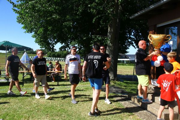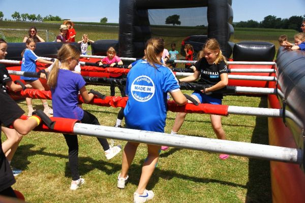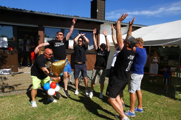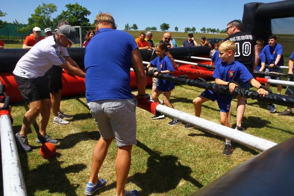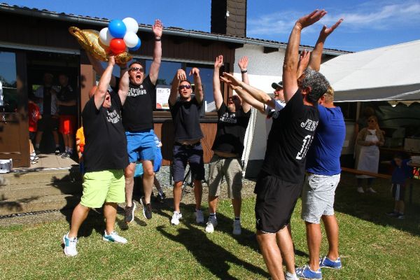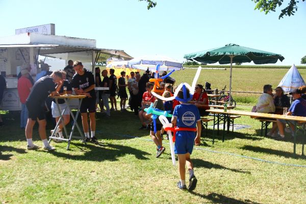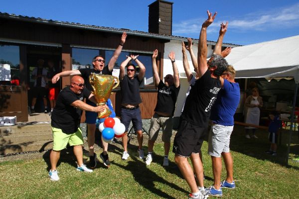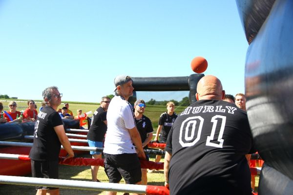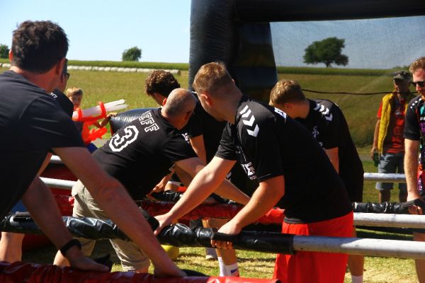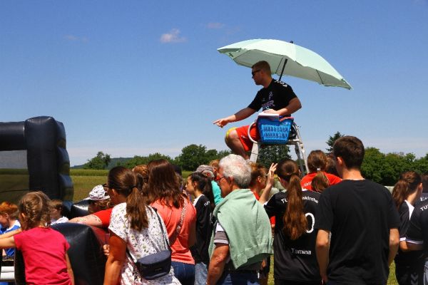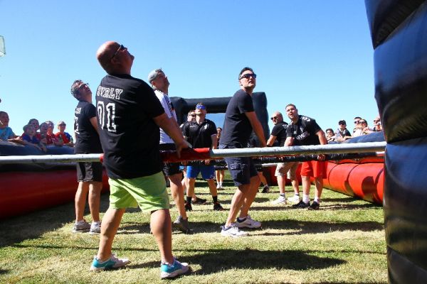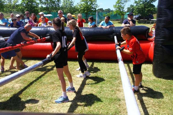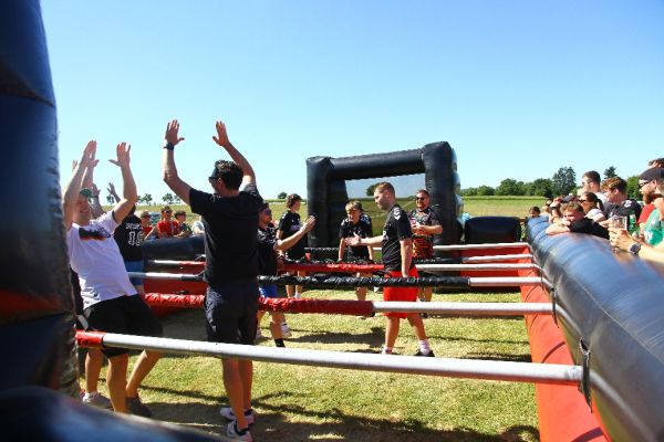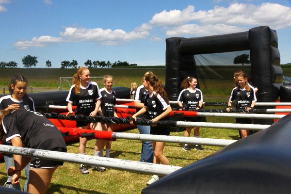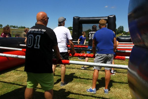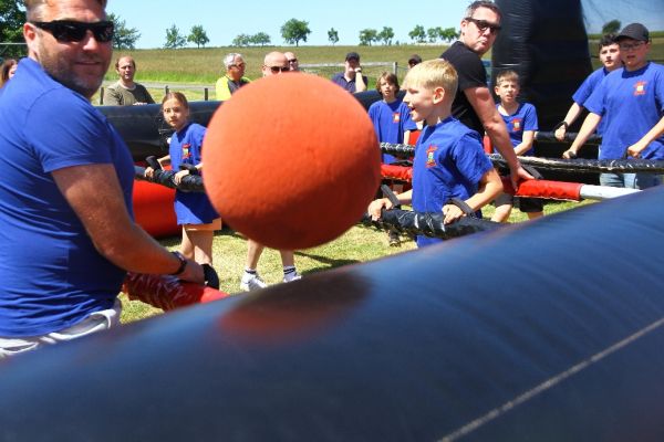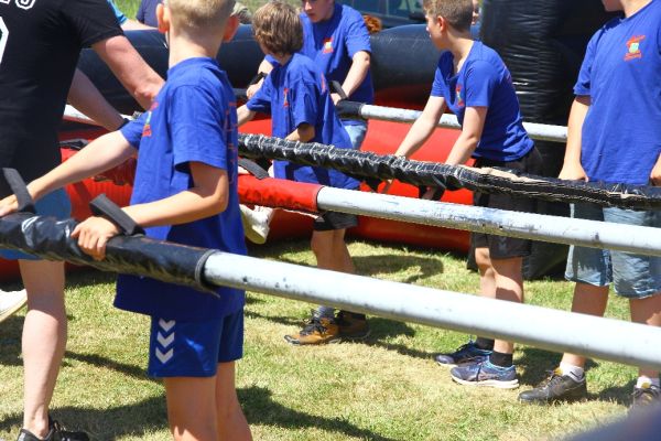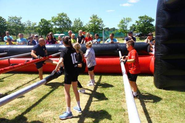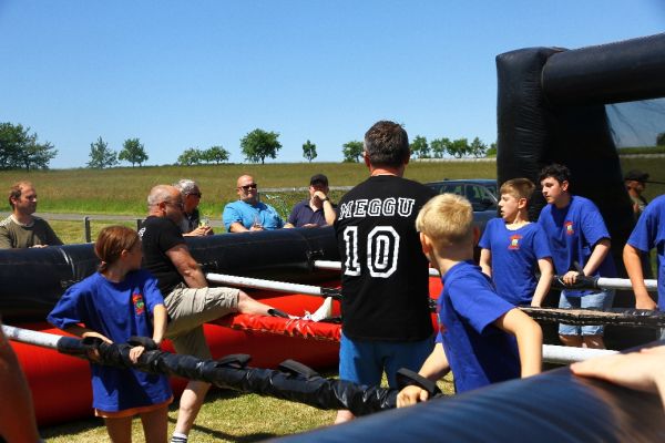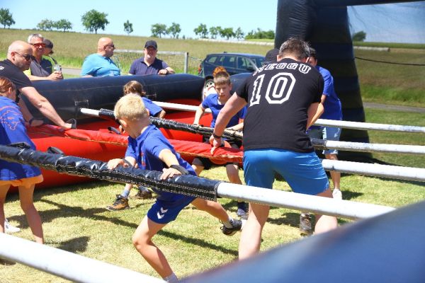 Fast ohne Pause gingen die sportlichen Aktivitäten weiter. Neben Rollerbahn und Riesenhüpfburg gab es wieder ein Menschenkickerturnier, bei dem in diesem Jahr auch die Jugendlichen ein Turnier ausspielten. Bei den Erwachsenen gewannen die „Living Legends“ in einem spannenden Finale gegen die 1. Männermannschaft des TUS. Erst in der Verlängerung konnten sich die selbsternannten Favoriten durchsetzen.
