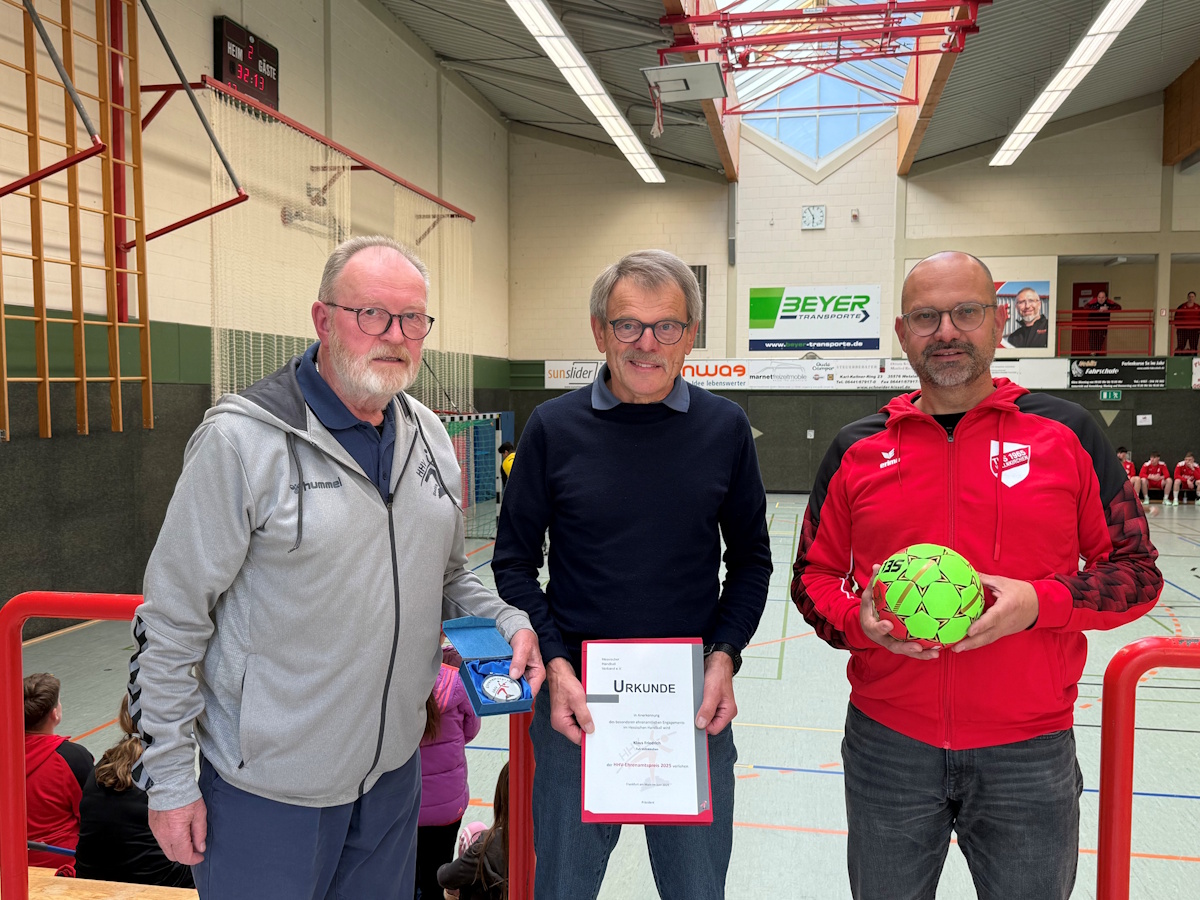 In Anerkennung für sein besonderes ehrenamtliches Engagenement im hessischen Handball wurde Klaus Friedrich mit dem Ehrenamtspreis des Hessischen Handball Verbandes 2025 ausgezeichnet. Die Ehrung nahm Norbert Münch, Beauftragter für Ehrungen des Handballbezikrs Giessen, am Rande des Männerspiels am Samstag Abend in der Sporthalle Volpertshausen vor.