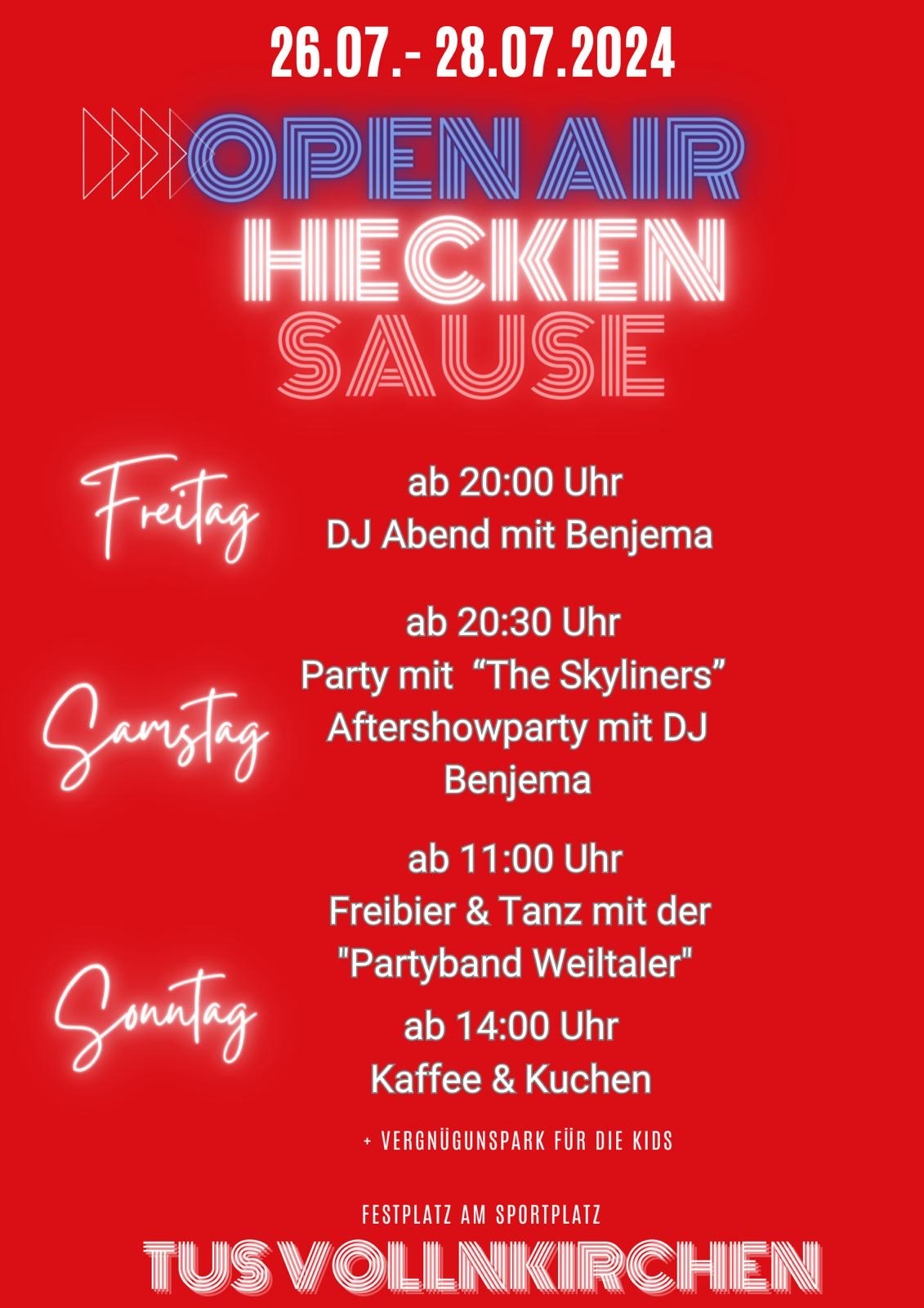 Am letzten Wochenende im Juli geht es wieder zur Sache in Hüttenbergs kleinstem Ortsteil. Der TUS Vollnkirchen lädt zur „Open Air Hecken Sause“ am Sportplatz ein. Dann heißt es endlich wieder feiern, was das Zeug hält.
