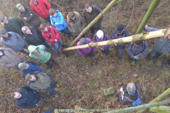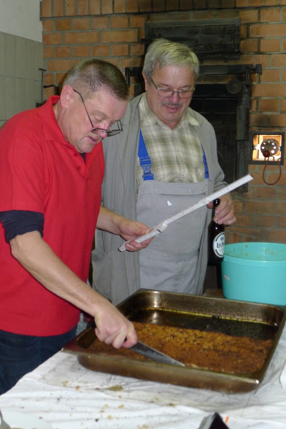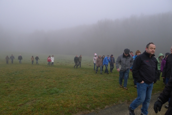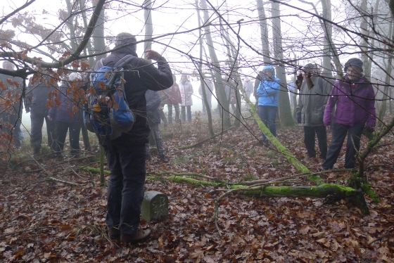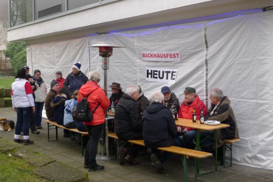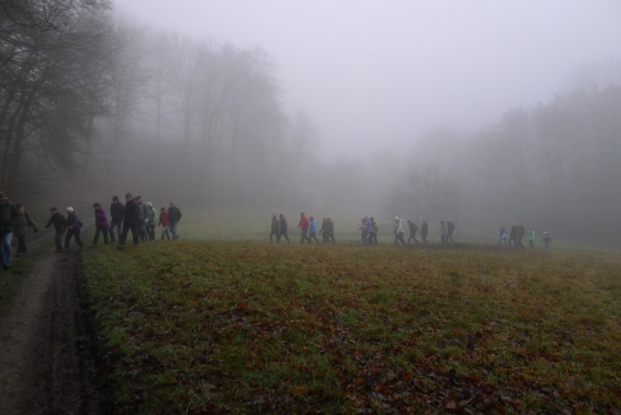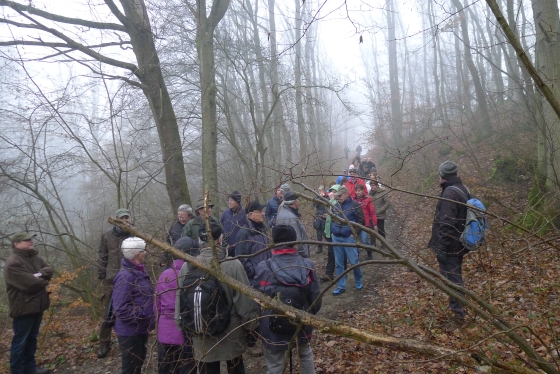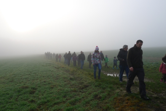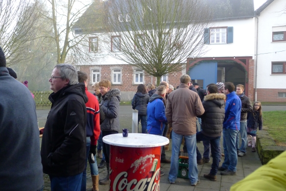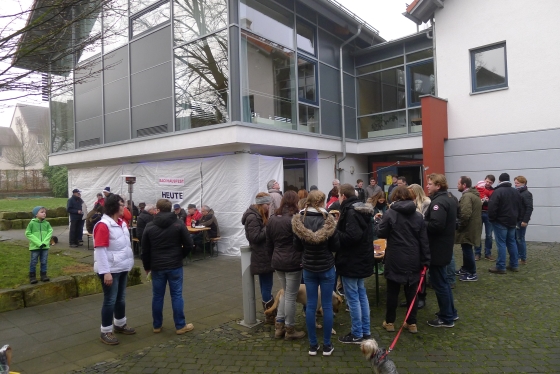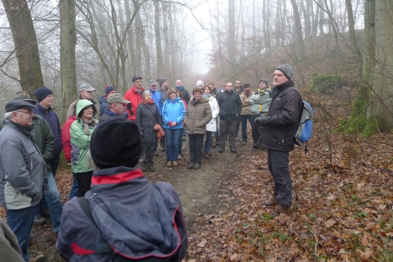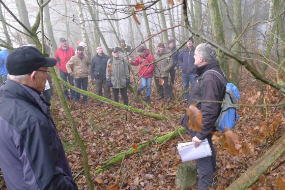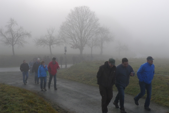 Wie haben sich Gemarkungsgrenzen entwickelt ? Warum gibt es Grenzgänge ? Seit wann gibt es Grenzsteine ? welche Arten von Grenzsteinen gibt es ? Welche Geheimnisse stecken hinter den steinernen Grenzmarkierungen ? Diese und weitere spannende Fragen zu Grenzen und Grenzsteinen beantwortete Grenzsteinobmann Daniel Singer anlässlich einer Führung zu der der TUS Vollnkirchen im Rahmen der Veranstaltungen zu seinem 50-jährigen Jubiläum eingeladen hatte. Über 40 geschichtsinteressierte Teilnehmer aus nah und fern konnte der erste Vorsitzende des TUS, Dr. Clemens Ruppert, zu der historischen Grenzwanderung begrüßen. Die Wanderung führte in den südlichen Teil der Vollnkirchener Gemarkung entlang der Grenze zum Nachbardorf Volpertshausen. Im Tal des Schwingbaches erläuterte Singer wie natürliche Landschaftselemente, wie zum Beispiel Bäche und Flüsse, oder künstlich geschaffene Gräben oder Wälle zur Grenzmarkierung genutzt wurden. Im Bereich der Gemarkung Wertshausen konnten dann Grenzsteine aus vornapoleonischer Zeit bestaunt werden. Im Jahre 1780 wurde hier die Herrschaftsgrenze zwischen dem Fürstentum Nassau-Weilburg und der Grafschaft Solms-Braunfels „abgesteint“. Auf dem gut erhaltenen Grenzstein sind die Aufschrift „NW“ für Nassau-Weilburg und „SB“ für Solms-Braunfels, sowie die Jahreszahl der Steinsetzung noch gut zu erkennen. Entlang dieser alten Grenzlinie verläuft heutzutage die Grenze zwischen Vollnkirchen und Oberwetz. An einer anderen Stelle konnte Singer mit einem sogenannten Güterstein einen weiteren Grenzsteintyp vorstellen. Er trägt die Aufschrift „NW“ und weist ein Eigenterritorium innerhalb der ehemaligen nassauischen Gemarkung aus. Zum Abschluss des Rundgangs wusste Clemens Ruppert Wissenswertes über die mittelalterliche Wüstung Wertshausen, die im Jahre 810 erstmals urkundlich erwähnt wurde und ca. 600 Jahre bestand, zu berichten. Im Jahr 2006 wurde im Rahmen der Dorferneuerung Vollnkirchen das Schicksal des mittelalterlichen Dorfes erforscht. Durch die Auswertung schriftlicher Quellen, einer geomagnetischen Untersuchung des Untergrundes und Feldbegehungen zur Suche von keramischen Scherben konnte so ein recht genaues Bild von der Lage des ehemaligen Dorfes gezeichnet werden. Nach gut drei Stunden Wanderung im teils dichten Nebel waren die Teilnehmer wieder zurück am Ausgangspunkt, genau rechtzeitig, um sich mit regionalen Köstlichkeiten aus dem Vollnkirchener Backhaus zu stärken. Die Mitglieder des Fördervereins Handball haben zum 9. Backhausfest zwischen den Jahren wieder das beliebte „arme Leute Essen“ Dulges, Braten und frischen Backhauskuchen zubereitet. Zahlreiche Besucher weit über die Grenzen Vollnkirchens hinaus waren in den kleinsten Hüttenberger Ortsteil gekommen