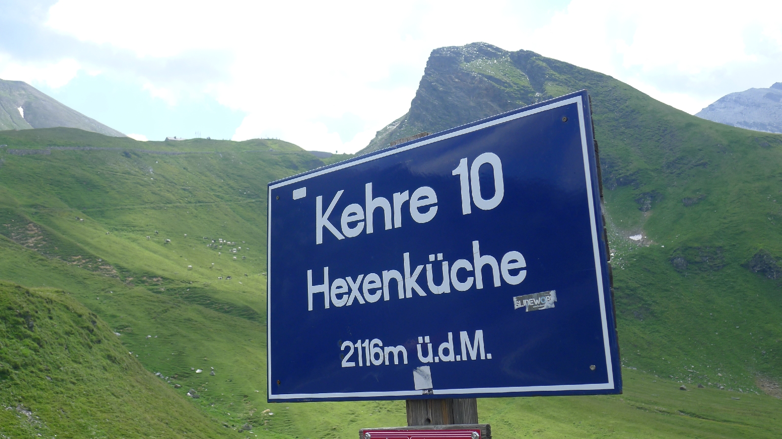 11:31 Uhr: Kehre 10, 2116m, wir sind mitten in der „Hexenküche“, überall liegen riesige Felsbrocken auf den grünen Bergmatten verstreut. Eingerahmt wird das ganze durch hochaufragende Felswände der zahlreichen Dreitausender.
