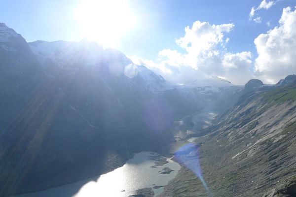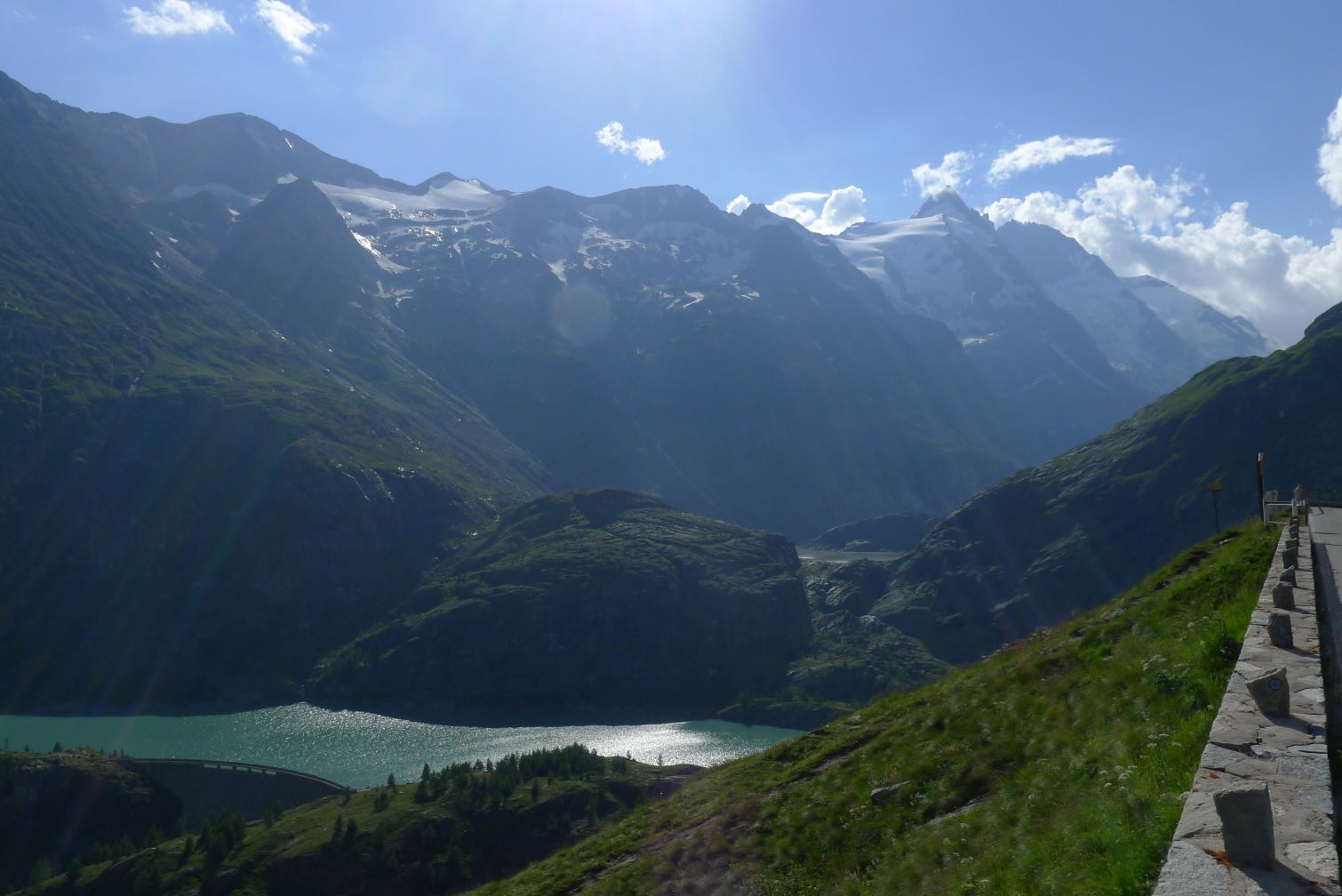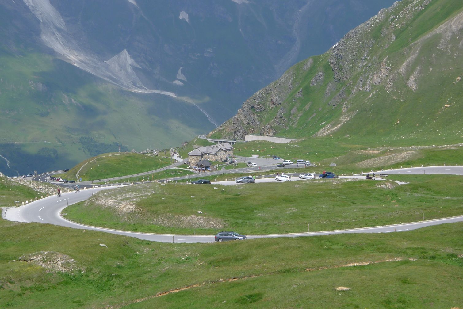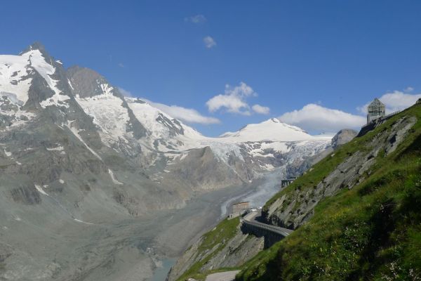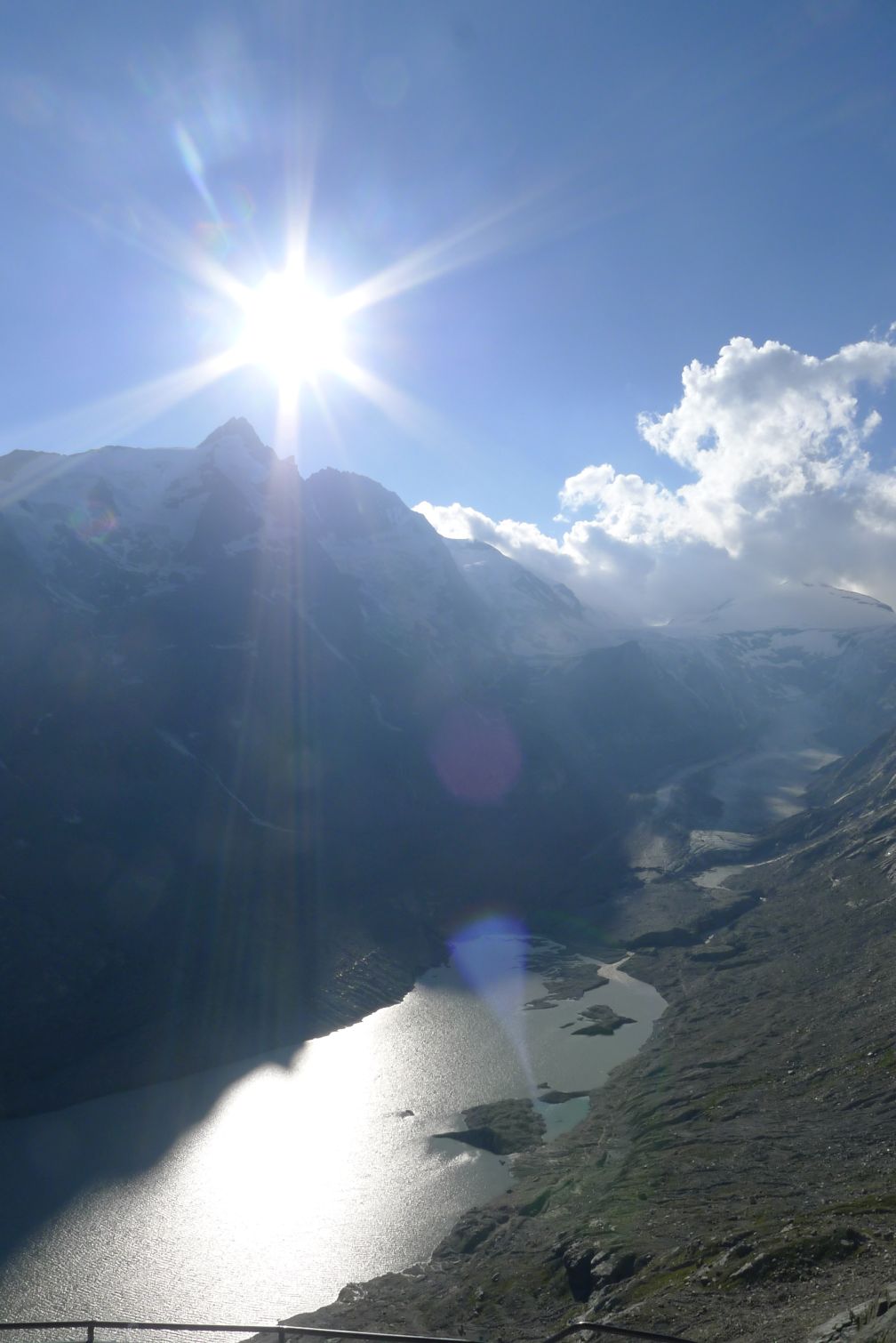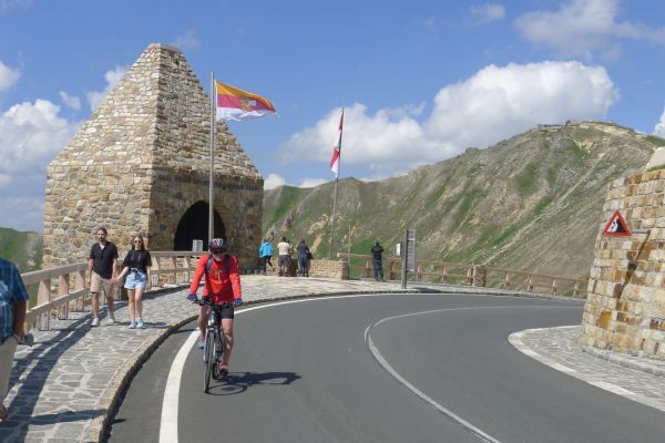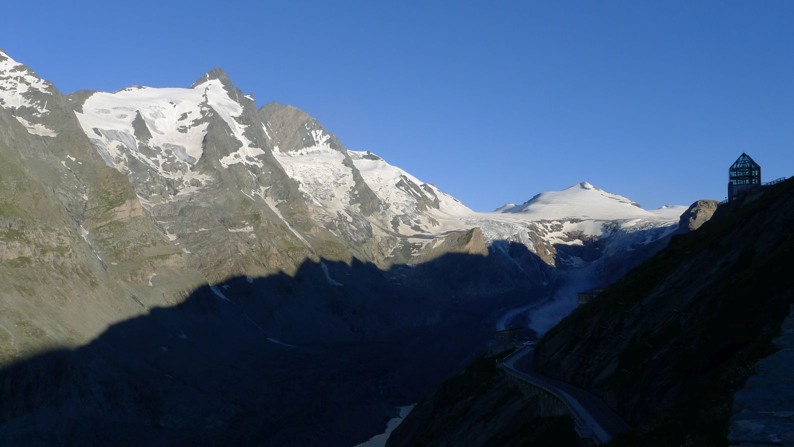 16:40 Uhr: der Kreisverkehr vor Heiligenblut ist erreicht, 650 der mühsam erstrampelten Höhenmeter sind wir bergab gefahren. Wieder unterhalb der Baumgrenze auf 1859m beginnt nun der letzte Anstieg des Tages zur Kaiser Franz Josef Höhe. 8,5km und 510 Höhenmeter sind noch einmal zu stemmen. Nach einer Kurve öffnet sich der Blick auf den 3798m hohen Großglockner und den Pasterzengletscher zu seinen Füßen. Was für ein Anblick ! das setzt noch einmal letzte Reserven frei und die brauchen wir auch. Nach einem vergleichsweise flachen Stück vor dem Glocknerhaus wird es nochmal steil. Nach 3 Kehren ist der Naßfeldspeicher Stausee erreicht und dann geht es in die lange Galerie. 11% Steigung zum Abschluss. Am Ende des Tunnels taucht nach einer Kurve das Kaiser Franz Josef Haus, unsere Herberge für die Nacht, auf. Nun haben wir das Plateau erreicht und radeln gemütlich bis zur Gletscherbahn am Ende der Straße.