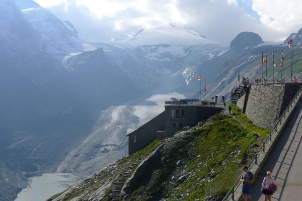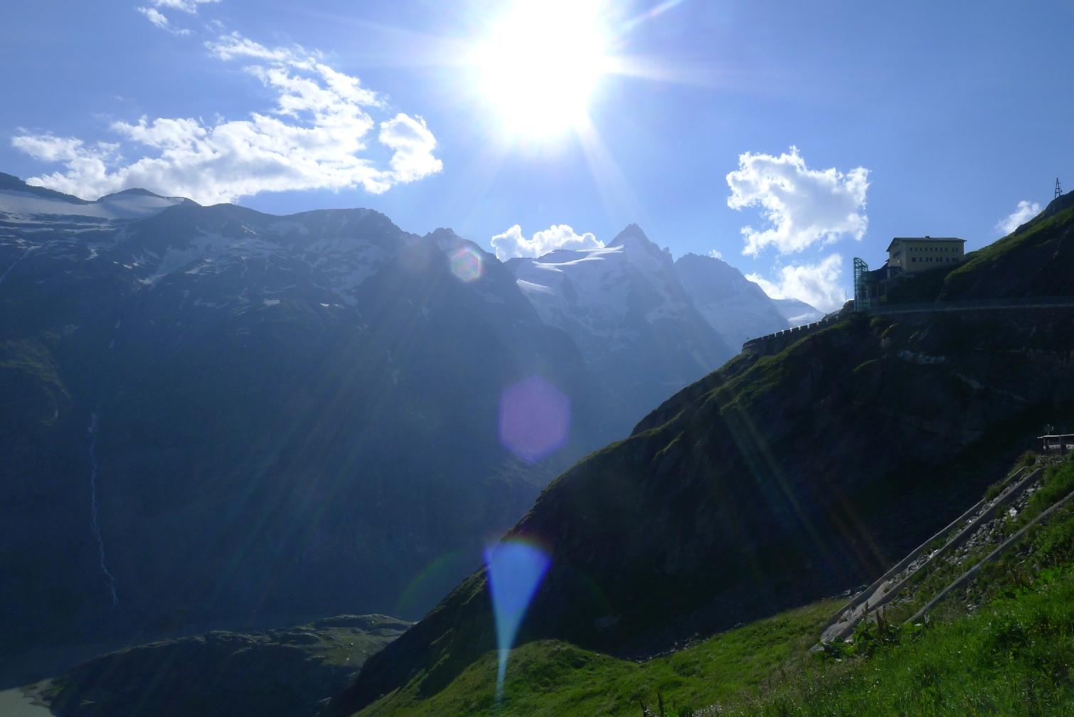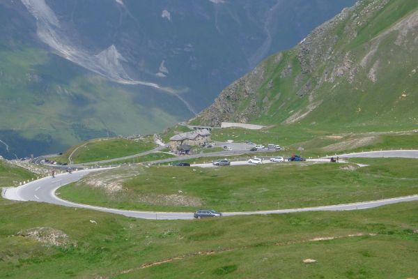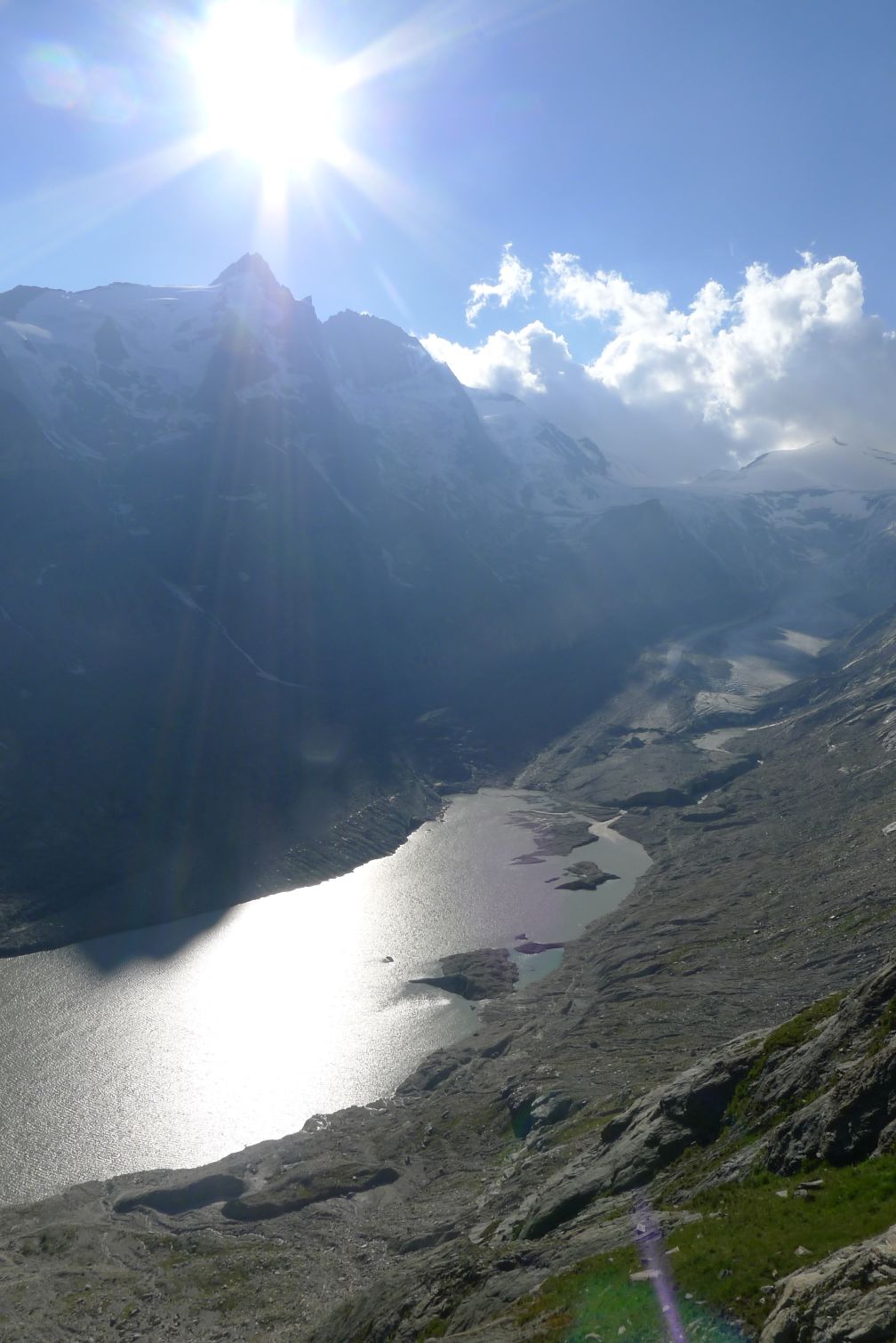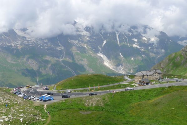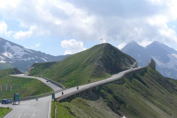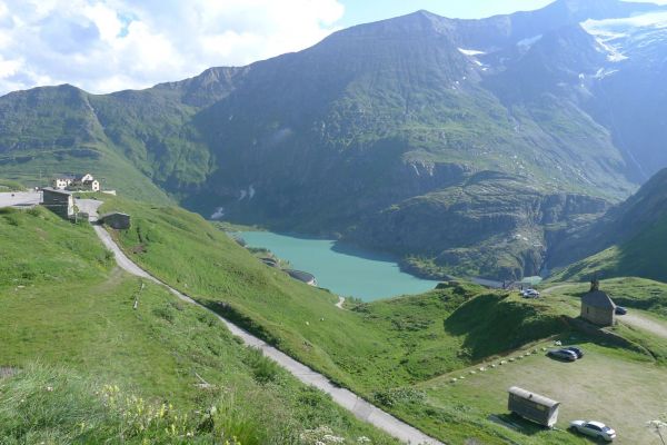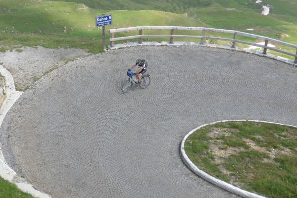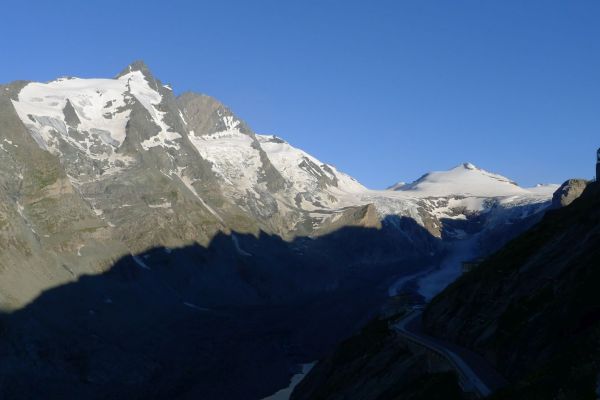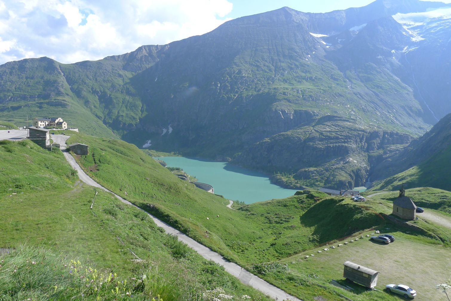 16:40 Uhr: der Kreisverkehr vor Heiligenblut ist erreicht, 650 der mühsam erstrampelten Höhenmeter sind wir bergab gefahren. Wieder unterhalb der Baumgrenze auf 1859m beginnt nun der letzte Anstieg des Tages zur Kaiser Franz Josef Höhe. 8,5km und 510 Höhenmeter sind noch einmal zu stemmen. Nach einer Kurve öffnet sich der Blick auf den 3798m hohen Großglockner und den Pasterzengletscher zu seinen Füßen. Was für ein Anblick ! das setzt noch einmal letzte Reserven frei und die brauchen wir auch. Nach einem vergleichsweise flachen Stück vor dem Glocknerhaus wird es nochmal steil. Nach 3 Kehren ist der Naßfeldspeicher Stausee erreicht und dann geht es in die lange Galerie. 11% Steigung zum Abschluss. Am Ende des Tunnels taucht nach einer Kurve das Kaiser Franz Josef Haus, unsere Herberge für die Nacht, auf. Nun haben wir das Plateau erreicht und radeln gemütlich bis zur Gletscherbahn am Ende der Straße.