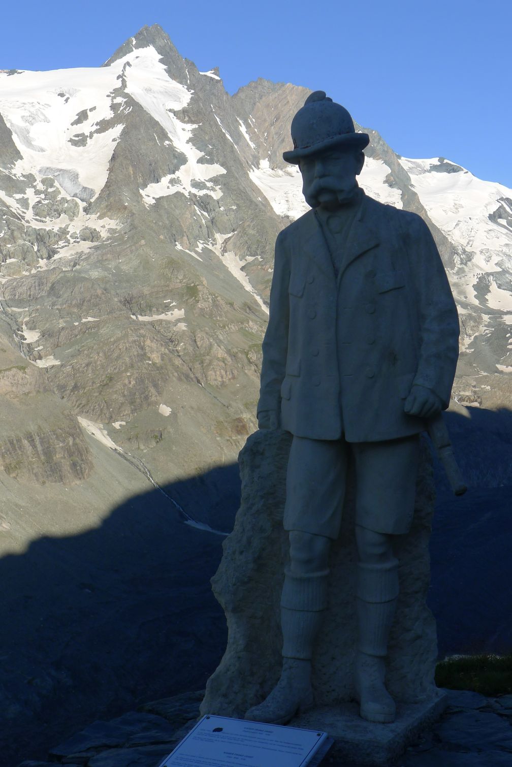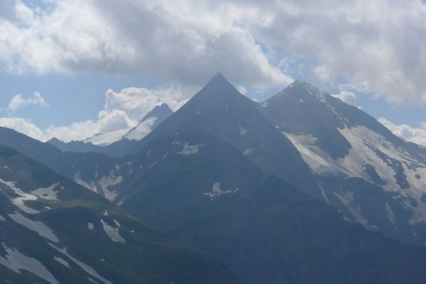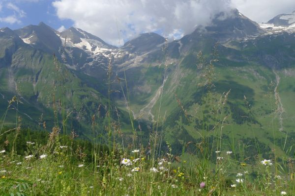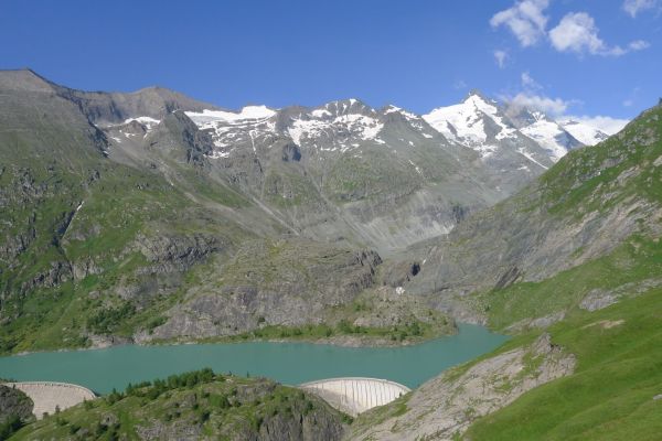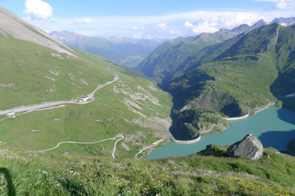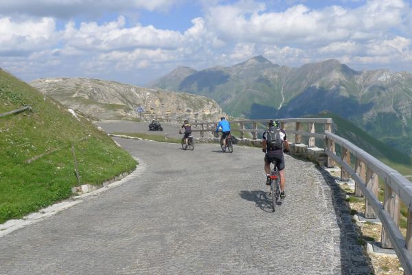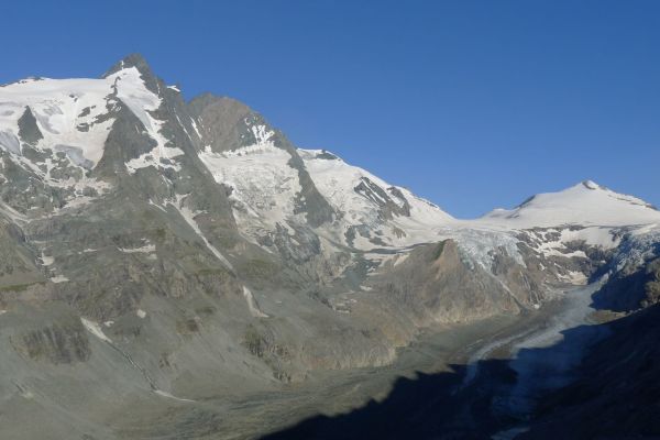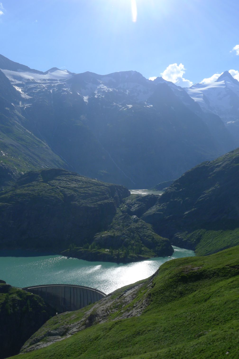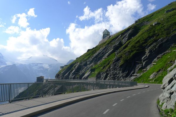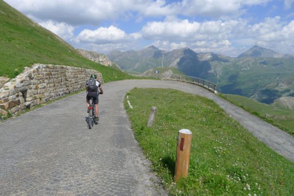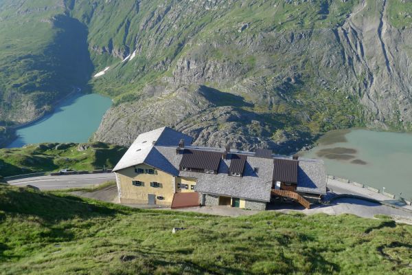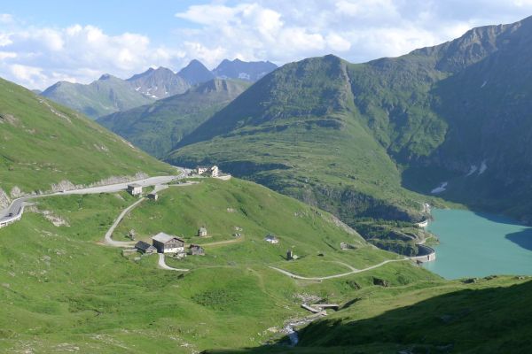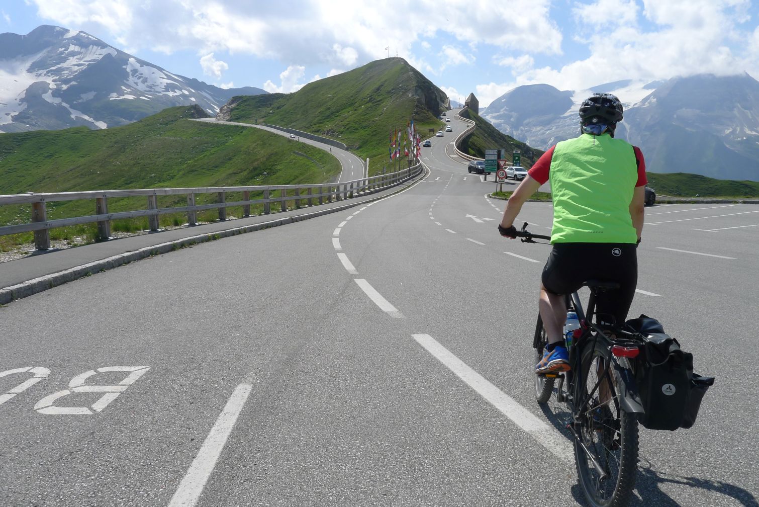 16:40 Uhr: der Kreisverkehr vor Heiligenblut ist erreicht, 650 der mühsam erstrampelten Höhenmeter sind wir bergab gefahren. Wieder unterhalb der Baumgrenze auf 1859m beginnt nun der letzte Anstieg des Tages zur Kaiser Franz Josef Höhe. 8,5km und 510 Höhenmeter sind noch einmal zu stemmen. Nach einer Kurve öffnet sich der Blick auf den 3798m hohen Großglockner und den Pasterzengletscher zu seinen Füßen. Was für ein Anblick ! das setzt noch einmal letzte Reserven frei und die brauchen wir auch. Nach einem vergleichsweise flachen Stück vor dem Glocknerhaus wird es nochmal steil. Nach 3 Kehren ist der Naßfeldspeicher Stausee erreicht und dann geht es in die lange Galerie. 11% Steigung zum Abschluss. Am Ende des Tunnels taucht nach einer Kurve das Kaiser Franz Josef Haus, unsere Herberge für die Nacht, auf. Nun haben wir das Plateau erreicht und radeln gemütlich bis zur Gletscherbahn am Ende der Straße.