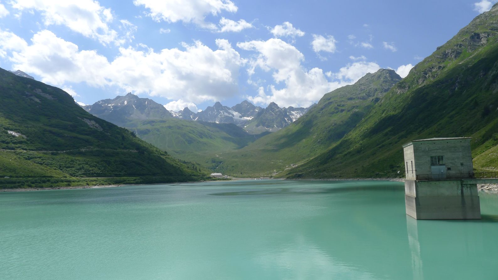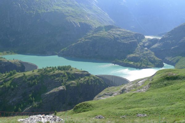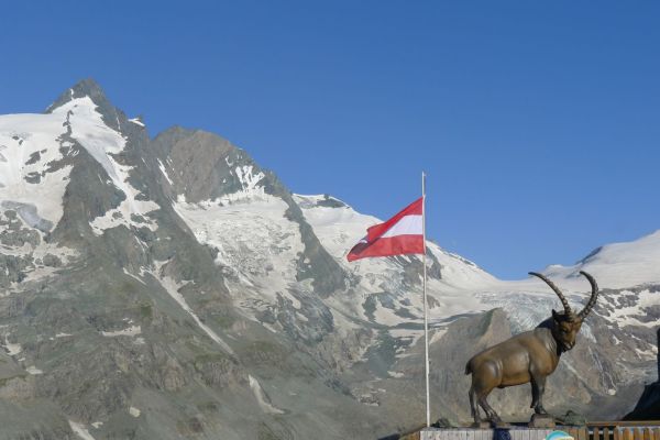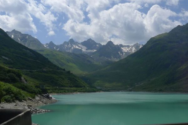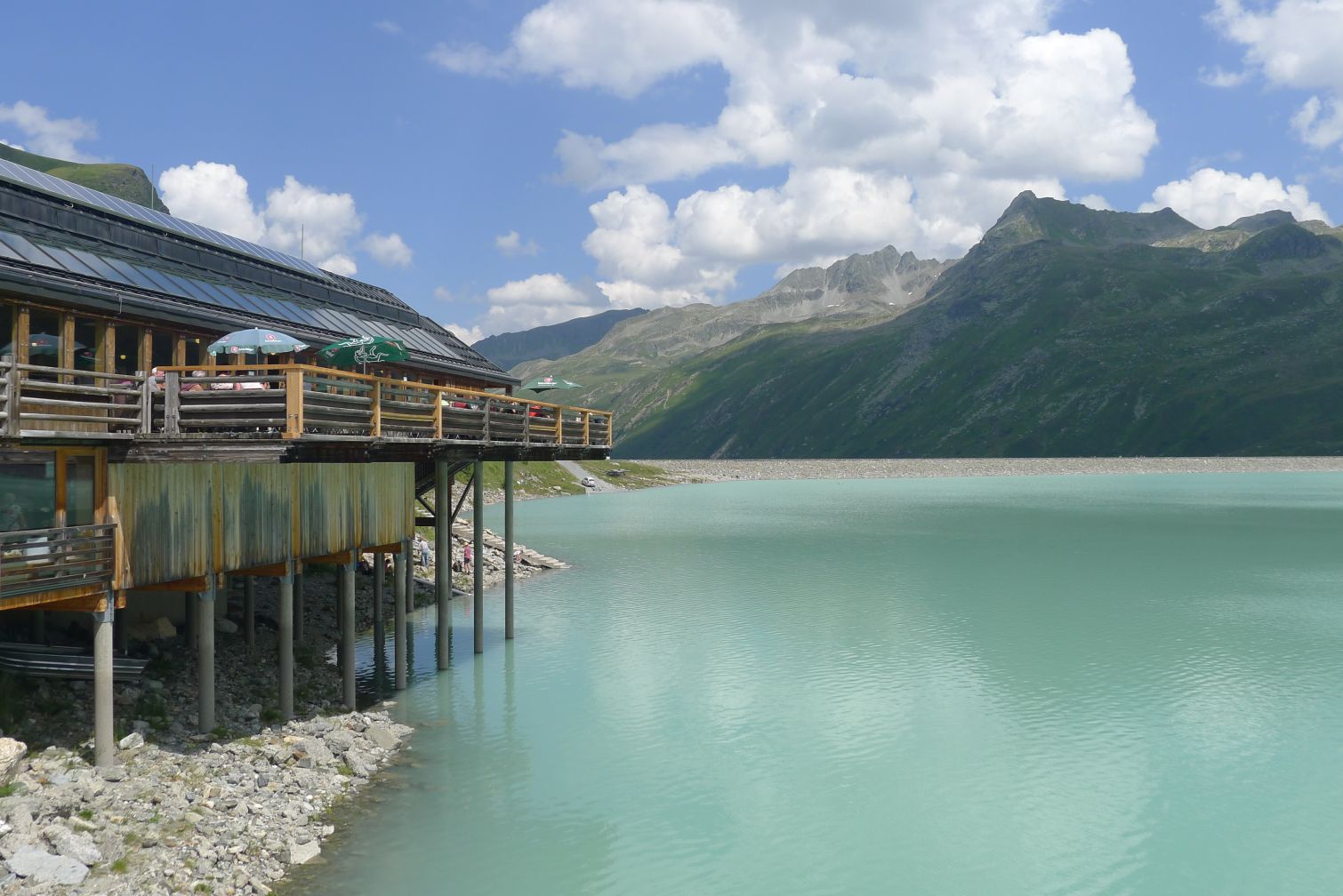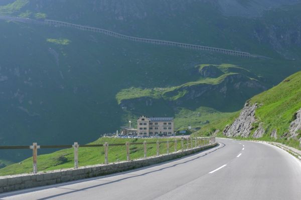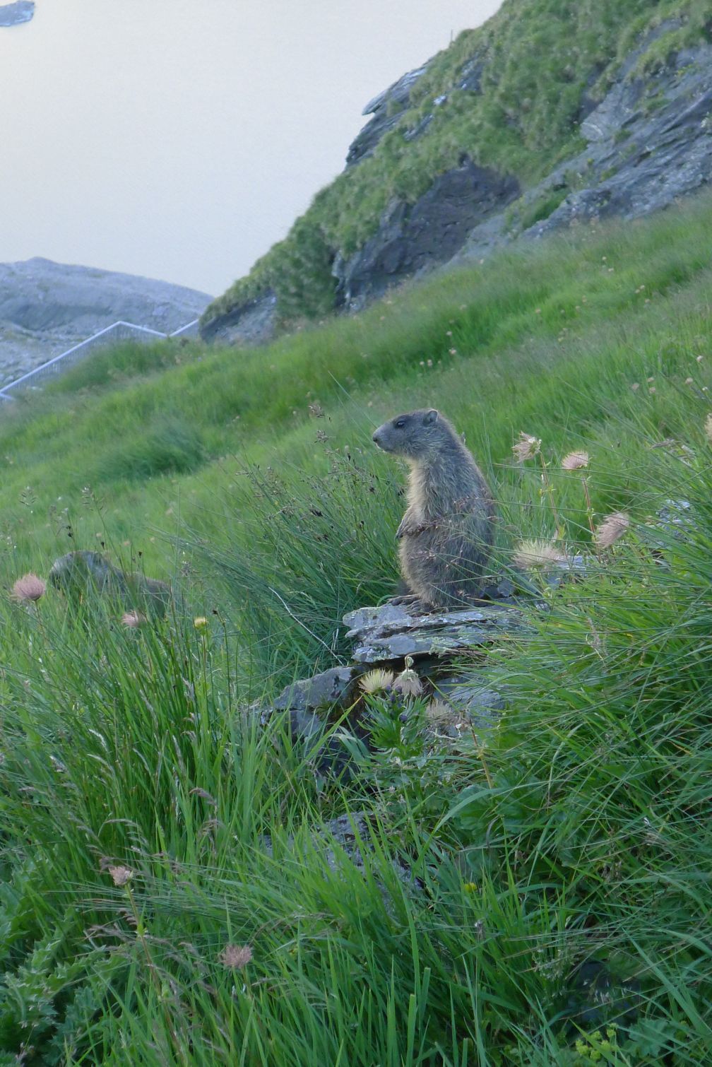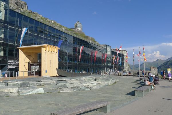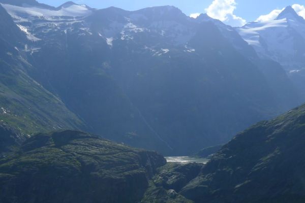 16:40 Uhr: der Kreisverkehr vor Heiligenblut ist erreicht, 650 der mühsam erstrampelten Höhenmeter sind wir bergab gefahren. Wieder unterhalb der Baumgrenze auf 1859m beginnt nun der letzte Anstieg des Tages zur Kaiser Franz Josef Höhe. 8,5km und 510 Höhenmeter sind noch einmal zu stemmen. Nach einer Kurve öffnet sich der Blick auf den 3798m hohen Großglockner und den Pasterzengletscher zu seinen Füßen. Was für ein Anblick ! das setzt noch einmal letzte Reserven frei und die brauchen wir auch. Nach einem vergleichsweise flachen Stück vor dem Glocknerhaus wird es nochmal steil. Nach 3 Kehren ist der Naßfeldspeicher Stausee erreicht und dann geht es in die lange Galerie. 11% Steigung zum Abschluss. Am Ende des Tunnels taucht nach einer Kurve das Kaiser Franz Josef Haus, unsere Herberge für die Nacht, auf. Nun haben wir das Plateau erreicht und radeln gemütlich bis zur Gletscherbahn am Ende der Straße.