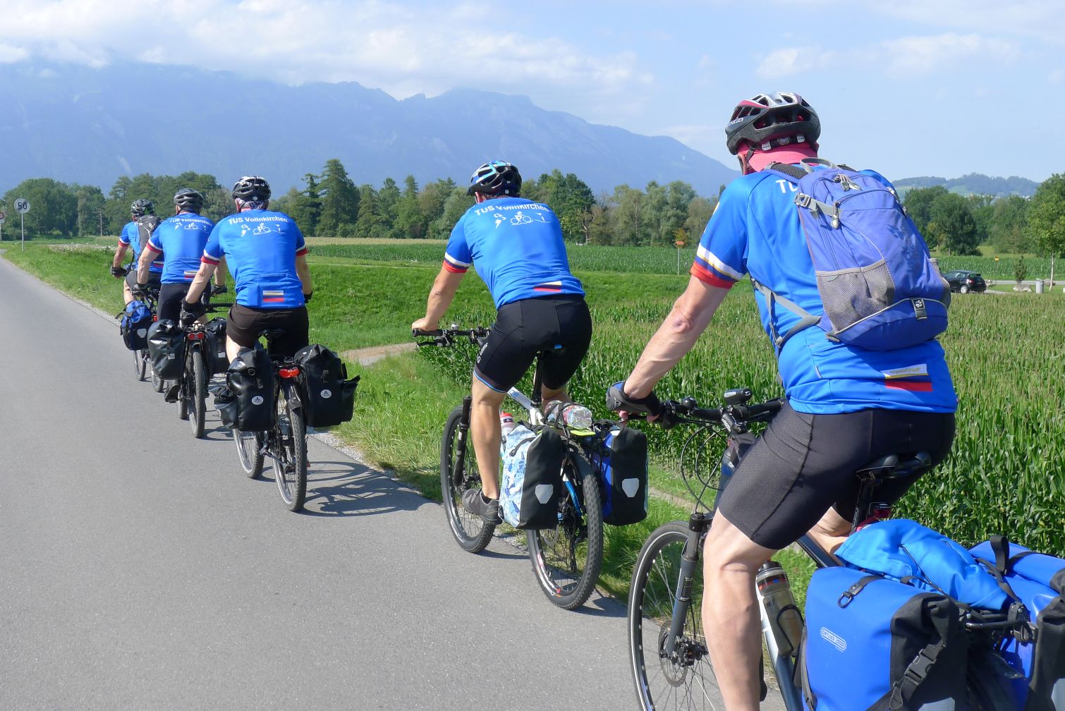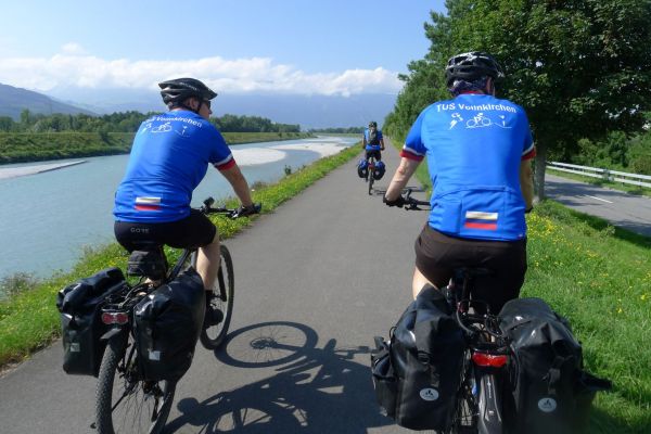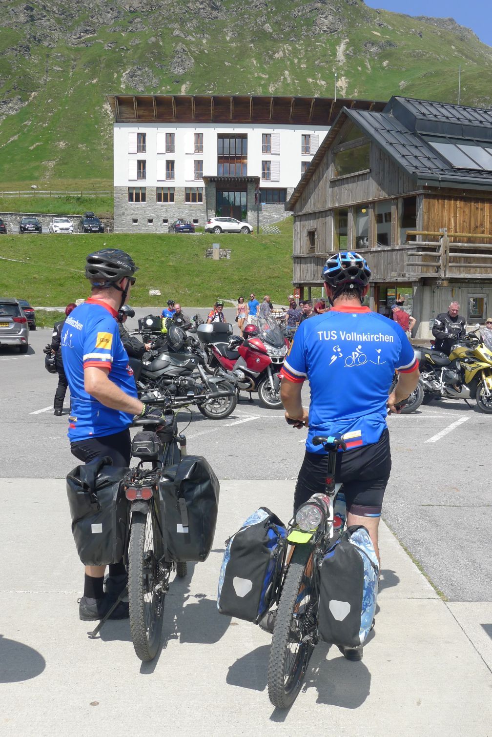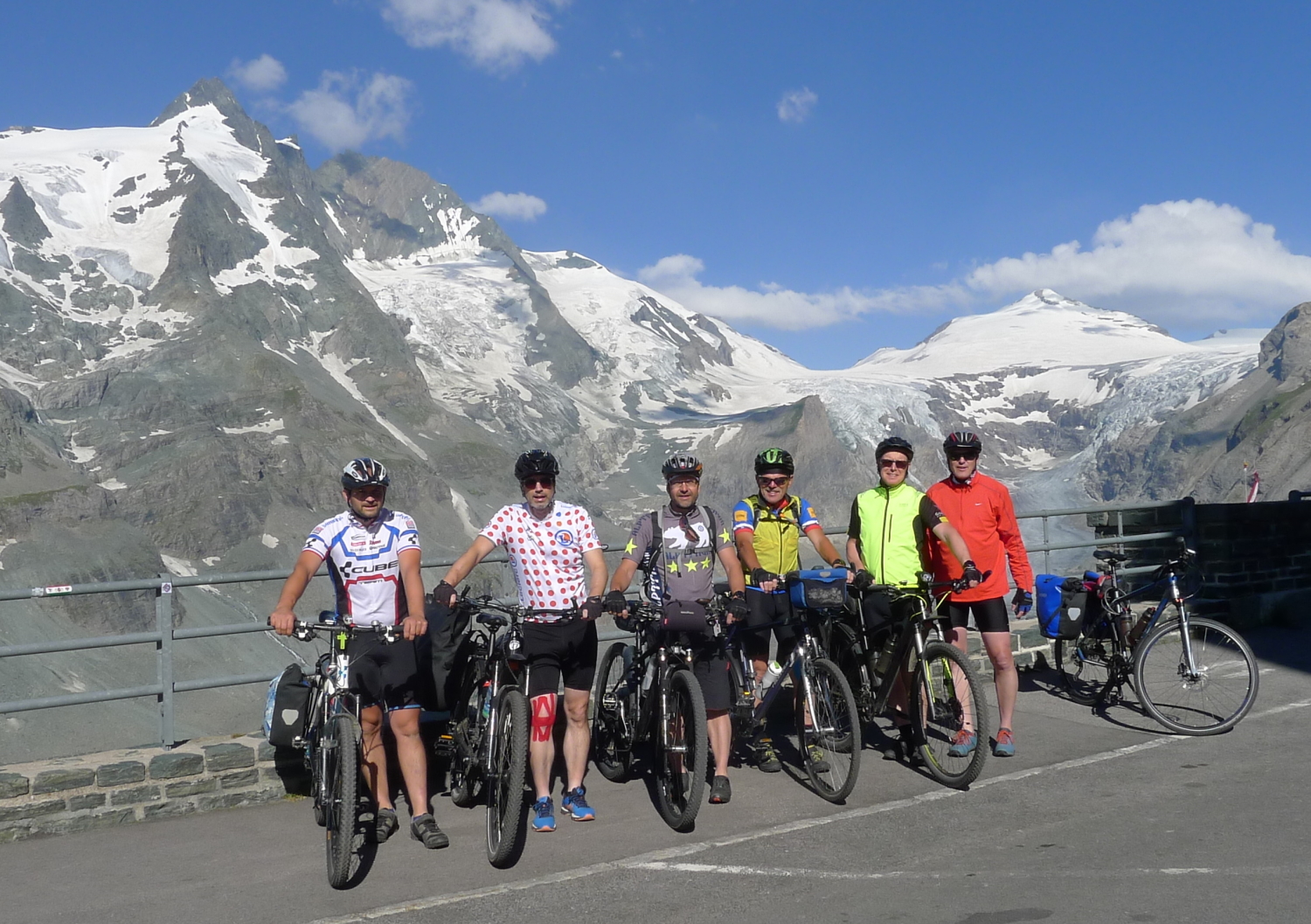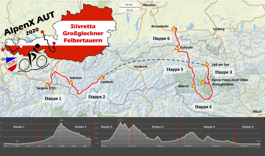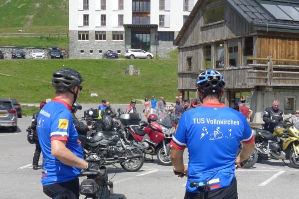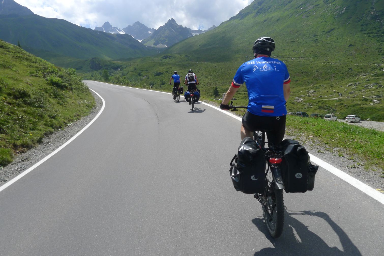 Die Gipfelstürmer des TUS Vollnkirchen waren wieder zum Radfahren in den Alpen. Die ursprünglich für Mitte Juni geplante Tour musste Corona-bedingt umgeplant werden, wodurch sich auch die Teilnehmerzahl von 10 auf sechs Personen reduzierte. Nach der Anreise ins schweizerische Sargans führte die erste Etappe über Vaduz (FL) und Feldkirch (A) ins Montafon nach Schruns. Auf der zweiten Etappe wurde es dann sportlich, 31 Kehren mit 9-12% Steigung auf der Silvretta Hochalpenstraße waren bis auf die Bieler Höhe (2032m) zu überwinden. Bei schwülen 30°C in der Sonne und mitgeführtem Gepäck eine echte Herausforderung. Es folgte eine 50km lange Abfahrt durch das Paznauntal über Galtür und Ischgl nach Landeck, von wo aus es via Zugtransfer zum nächsten Etappenort Zell am See weiterging. Am nächsten Tag folgte die Königsetappe, 62km mit 2500 Höhenmetern auf der Großglockner Hochalpenstraße bis auf die Kaiser-Franz Josef Höhe, direkt am Fuß des Pasterzengletschers. Dabei führte auch ein 1,5 km langer und im Schnitt 12% steiler Abstecher auf kopfsteingepflasteter Strasse zur Edelweißspitze, mit 2571m dem höchsten Punkt der Tour. Der Lohn für den langen Anstieg des Vortages folgte auf der vierten Etappe. Eine 30km lange Abfahrt hinab ins Tal. Über den Iselsbergpass und Lienz führte die Strecke weiter nach Matrei in Osttirol. Die fünfte Etappe war mit 100km die längste der Tour und führte über die Felbertauernstrasse nach Mittersill und weiter über den Pass Thurn und Kitzbühel nach Kufstein. Durch das Inntal führte die Schlussetappe –leider bei Dauerregen- nach Rosenheim, von wo aus die Rückreise mit dem Zug angetreten wurde. Insgesamt wurden an sechs Tagen 490km und 7015 Höhenmeter bewältigt.