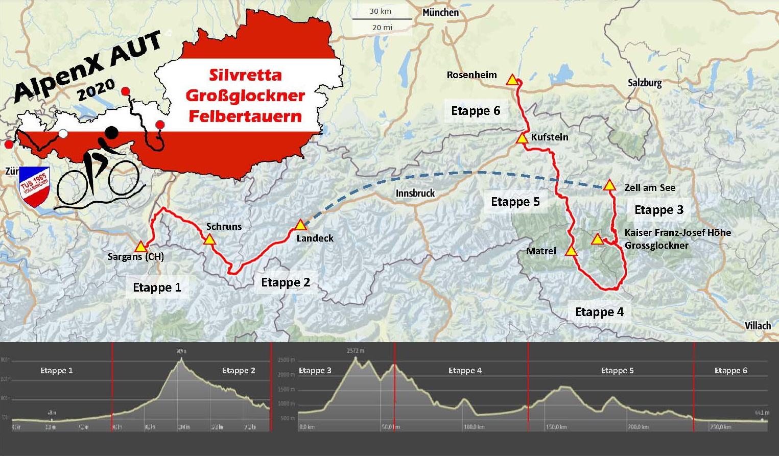 Schon während der letzte Alpentour war klar, dass es in diesem Jahr wieder mit dem Rad in der Berge gehen würde. Wir haben dabei mit Klassikern der Tour der France in den französischen Alpen geliebäugelt. Namen wie Col de l´Iseran, Col de la Madeleine, Col de la Croix de Fer, Col du Telegraphe, Col du Galibier, Col d´Izoard oder die 21 Serpentinen hinauf nach l´Alpe d´Huez ließen unsere Radherzen höher schlagen. Letztlich scheiterte der Plan aber an der Logistik. Die Anreise im Zug mit Rädern und für ne knappe Woche einen Etappenverlauf zu finden, der möglichst viele Highlights einschließt ohne lange Überführungsfahrten zu haben, waren dabei die größten Probleme. So begann die Suche nach Alternativen und mit der Silvretta Hochalpenstraße und der Großglockner Hochalpenstraße waren schnell zwei landschaftlich lohnende und sportlich anspruchsvolle Kandidaten ausgemacht. Die beiden Passstraßen ließen sich zudem durch einen Zugtransfer gut miteinander verbinden und auch Start und Endpunkt der Tour waren gut mit dem Zug zu erreichen. Anfang des Jahres begannen die Planungen und schnell war alles eingetütet, Termin vom 10.-15. Juni, Etappenverlauf, Unterkünfte, Zugfahrt, doch dann kam Corona…… Als die „Grippewelle“ sich dann zur Pandemie ausbreitete und eine Lockdown-Maßnahme auf die andere folgte, war unser Projekt „AlpenX Nr. 6“ ernsthaft gefährdet. Ein Lichtblick gab es dann Mitte/Ende Mai, als in Österreich wieder Hotels und Gaststätten öffneten und Lockerungen auch im internationalen Reiseverkehr in Aussicht gestellt wurden. Die traten leider erst nach Fronleichnam in Kraft, also eine Woche zu spät….. Nun begann das Planen wieder von vorne, neuen Termin finden, Hotels und Zugverbindungen umbuchen etc. Leider hat Corona dann doch noch seine „Opfer“ gefordert. Von ursprünglich 10 Teilnehmern blieben noch 6 übrig. Edwin, Jan, Lars und Timo mussten die Teilnahme aufgrund von Urlaussperre, mangelnder Trainingsvorbereitung oder Verletzung absagen.