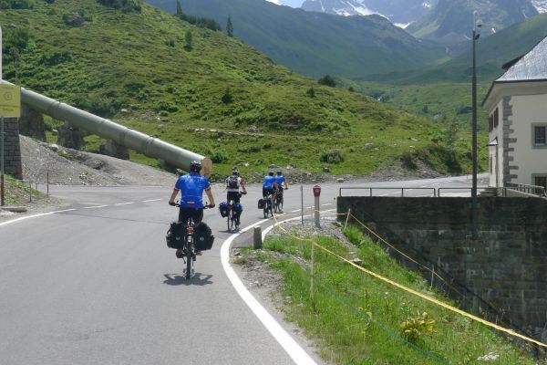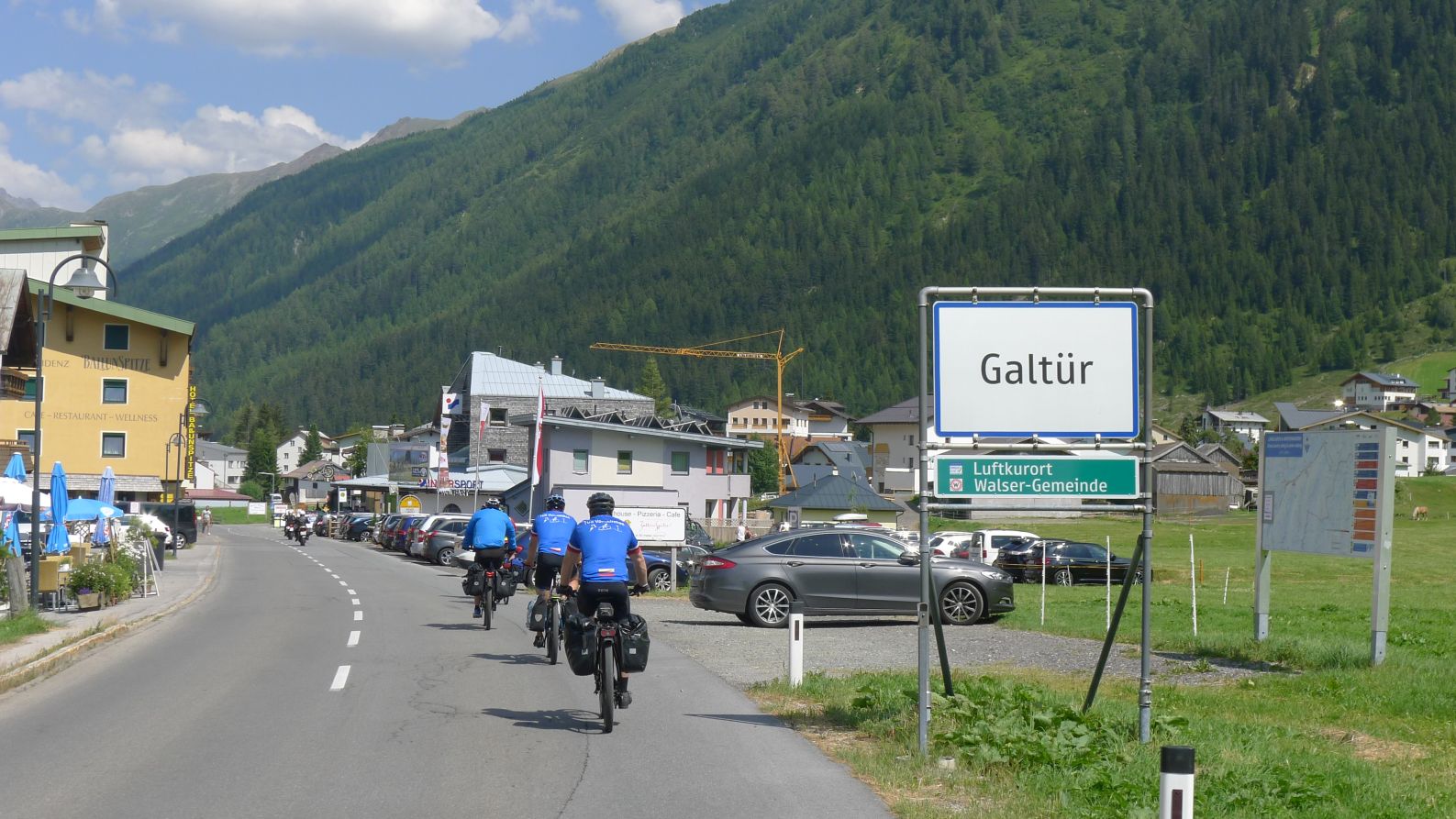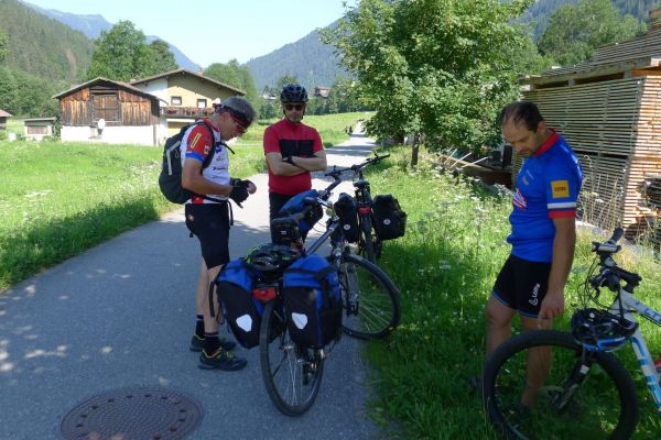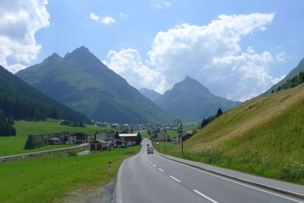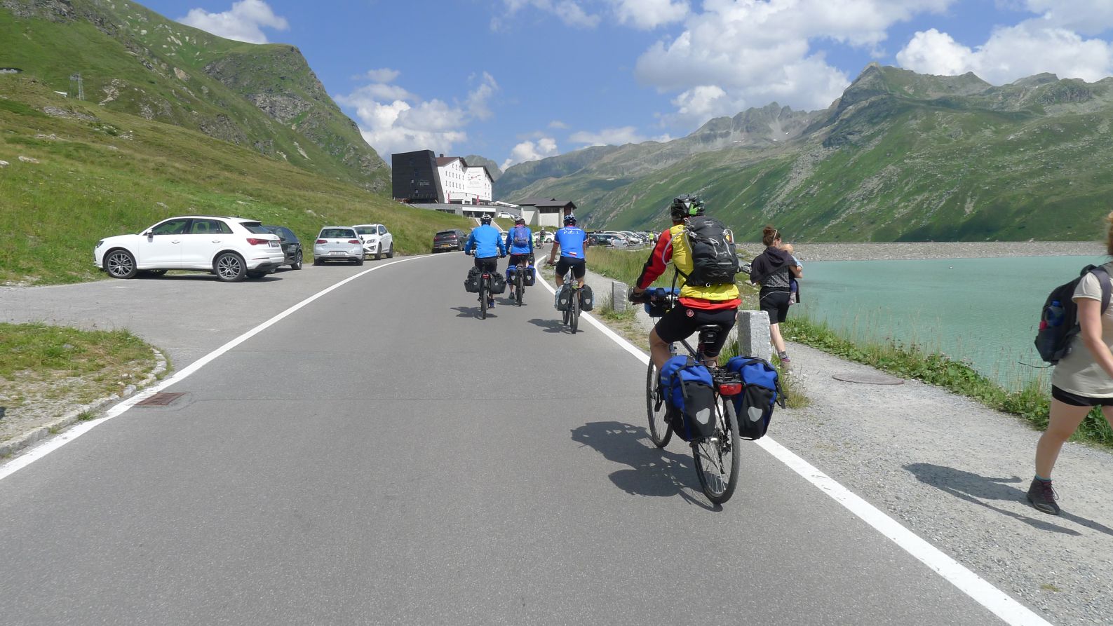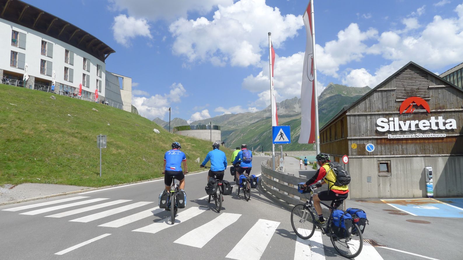 15:00 Uhr nach einem Gruppenbild vor dem Silvretta-Stausee geht es auf die Abfahrt. Noch 53 km bis nach Landeck und wir müssen den Zug erreichen, der uns zum nächsten Etappenort bringen soll. Um Zeit zu sparen bleiben wir auf der Bundesstrasse und rauschen mit hoher Geschwindigkeit durch das Paznauntal. Dörfer wie Galtür und Ischgl durchfahren wir im Eiltempo. Kurz vor Landeck kommt nochmal ein Anstieg und das Erreichen des Zuges schein in weite Ferne zu rücken.