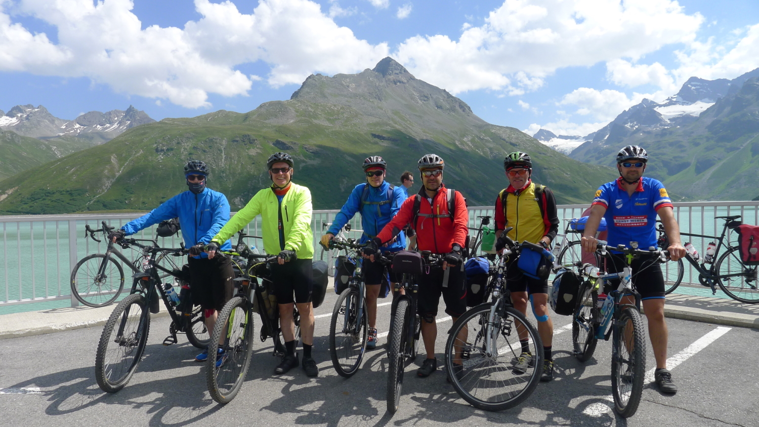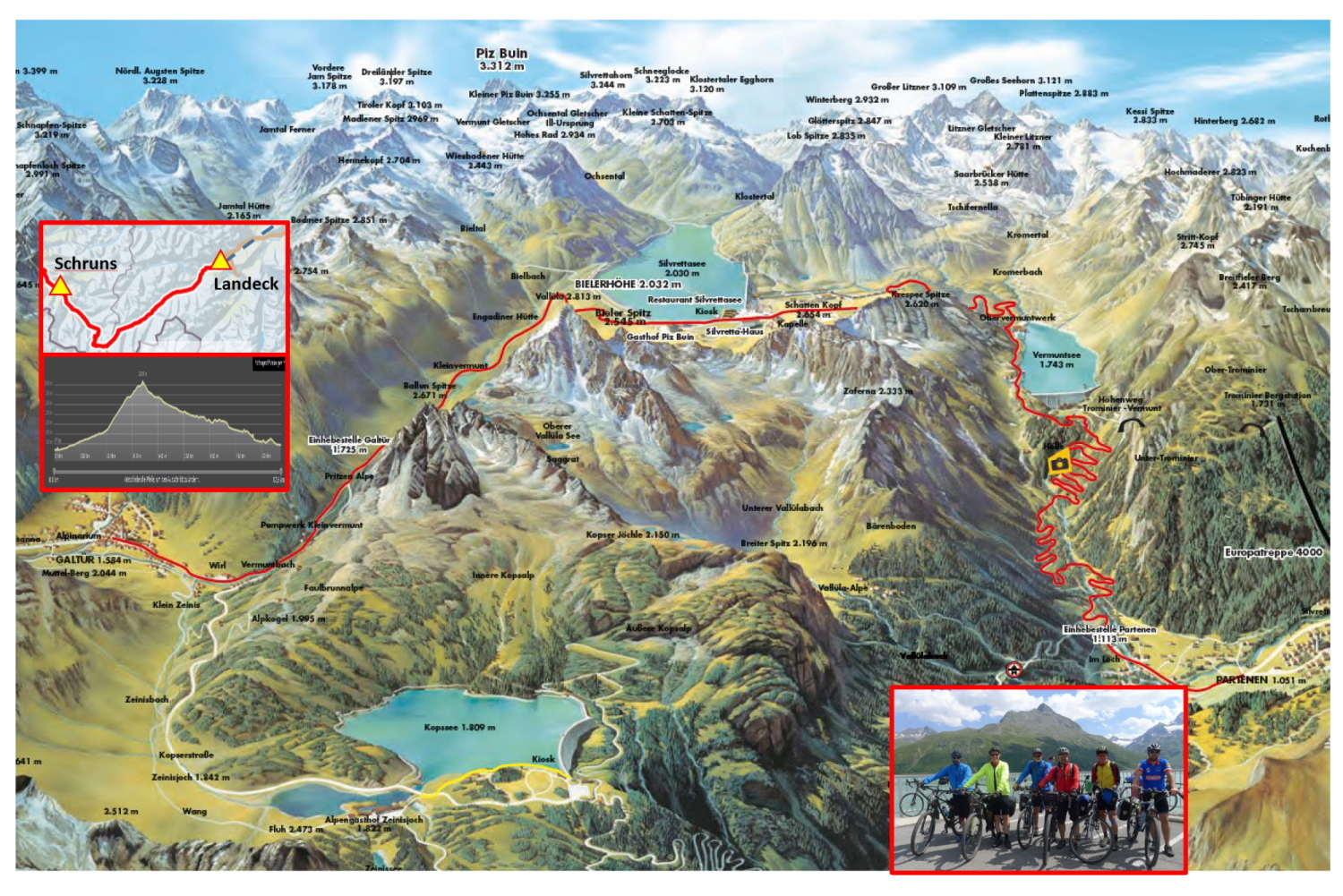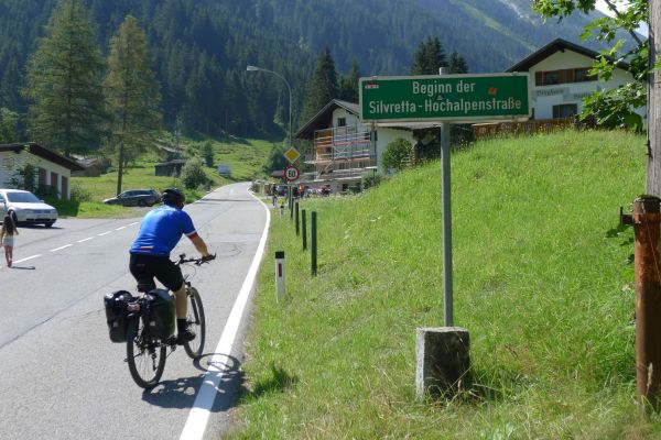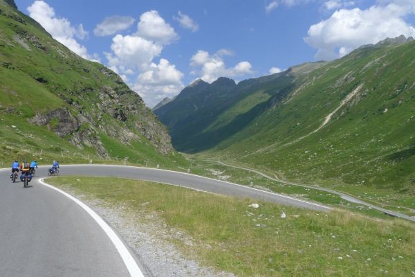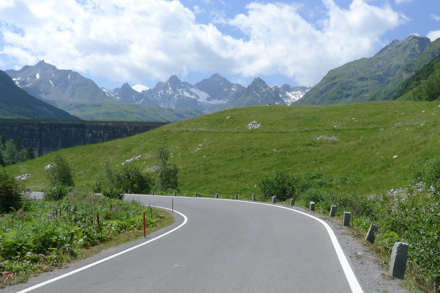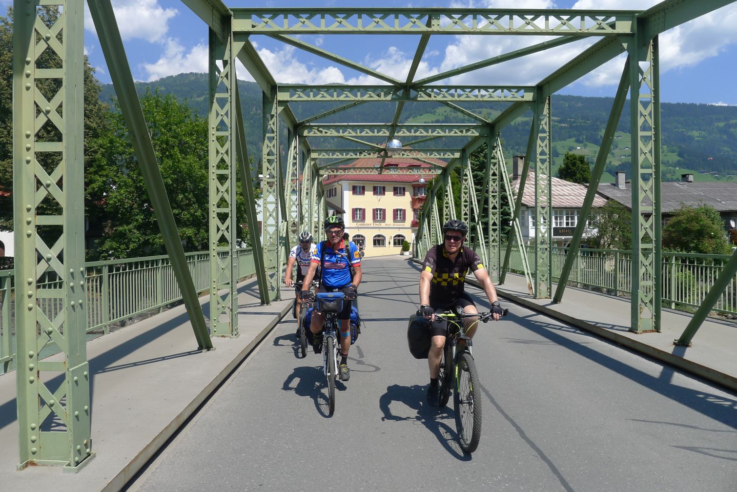 15:00 Uhr nach einem Gruppenbild vor dem Silvretta-Stausee geht es auf die Abfahrt. Noch 53 km bis nach Landeck und wir müssen den Zug erreichen, der uns zum nächsten Etappenort bringen soll. Um Zeit zu sparen bleiben wir auf der Bundesstrasse und rauschen mit hoher Geschwindigkeit durch das Paznauntal. Dörfer wie Galtür und Ischgl durchfahren wir im Eiltempo. Kurz vor Landeck kommt nochmal ein Anstieg und das Erreichen des Zuges schein in weite Ferne zu rücken.