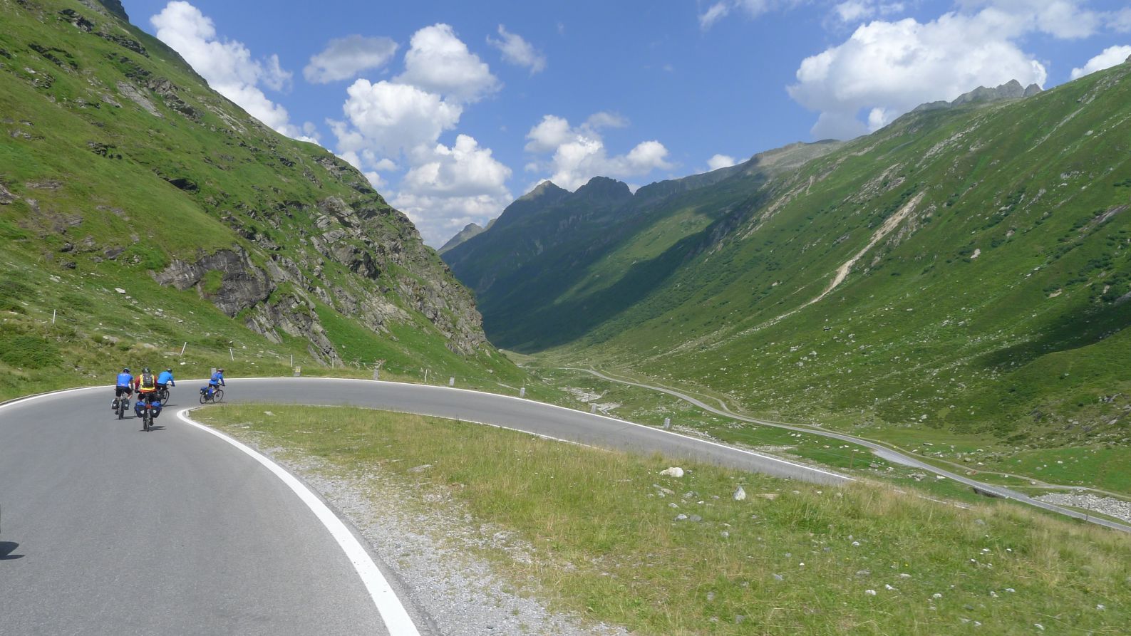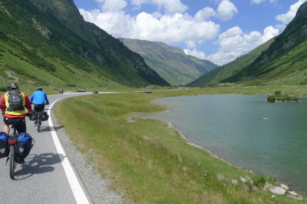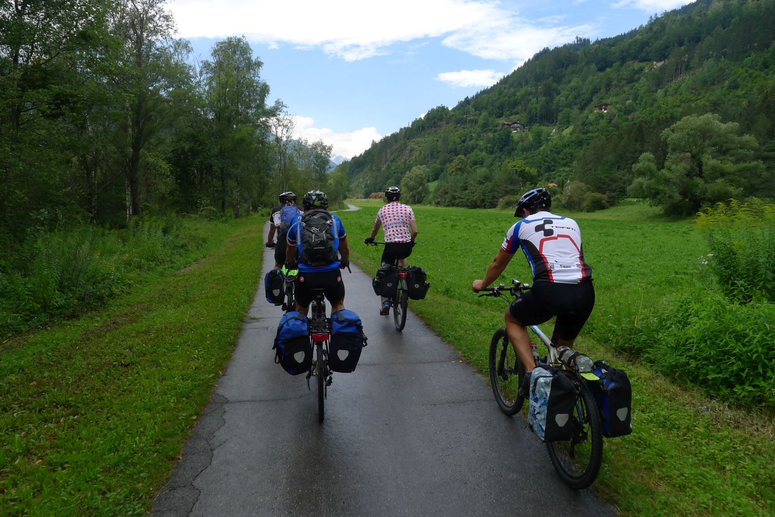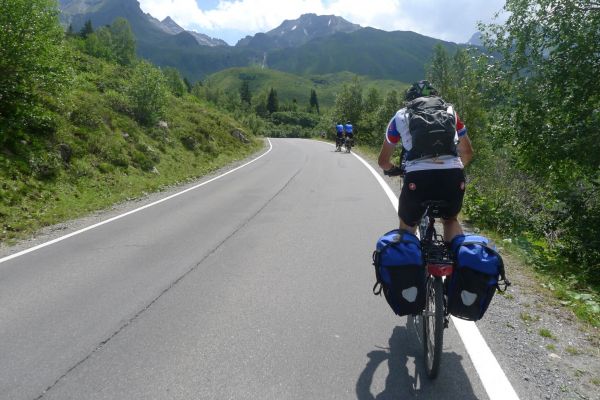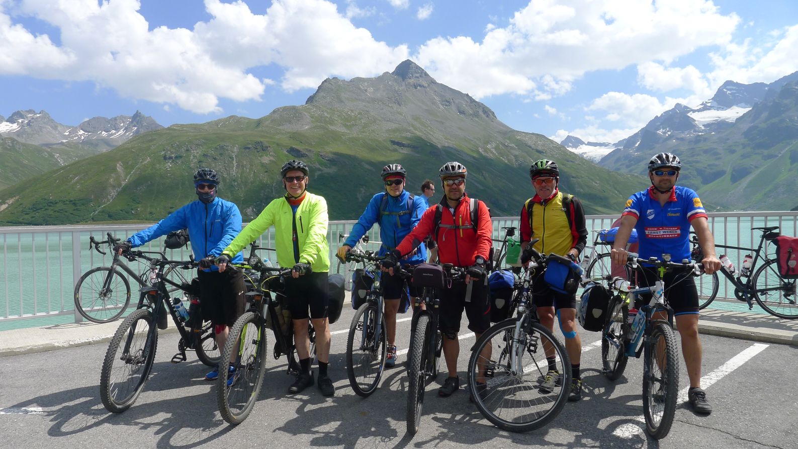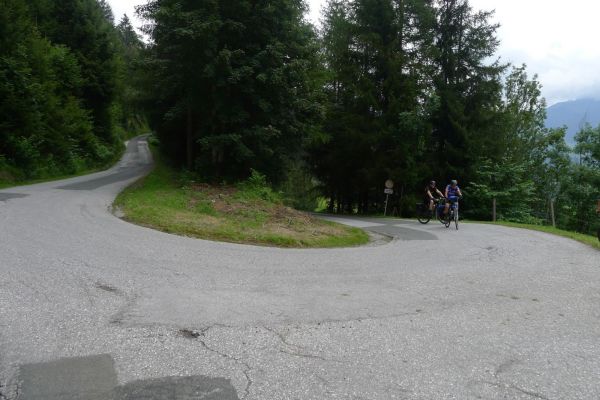 15:00 Uhr nach einem Gruppenbild vor dem Silvretta-Stausee geht es auf die Abfahrt. Noch 53 km bis nach Landeck und wir müssen den Zug erreichen, der uns zum nächsten Etappenort bringen soll. Um Zeit zu sparen bleiben wir auf der Bundesstrasse und rauschen mit hoher Geschwindigkeit durch das Paznauntal. Dörfer wie Galtür und Ischgl durchfahren wir im Eiltempo. Kurz vor Landeck kommt nochmal ein Anstieg und das Erreichen des Zuges schein in weite Ferne zu rücken.