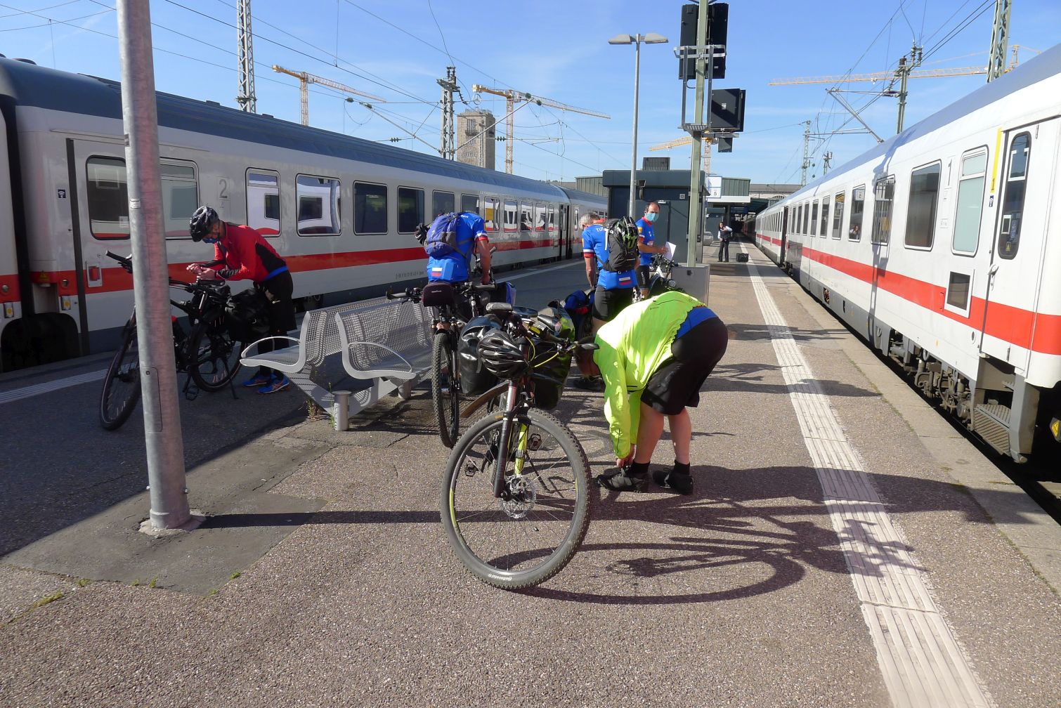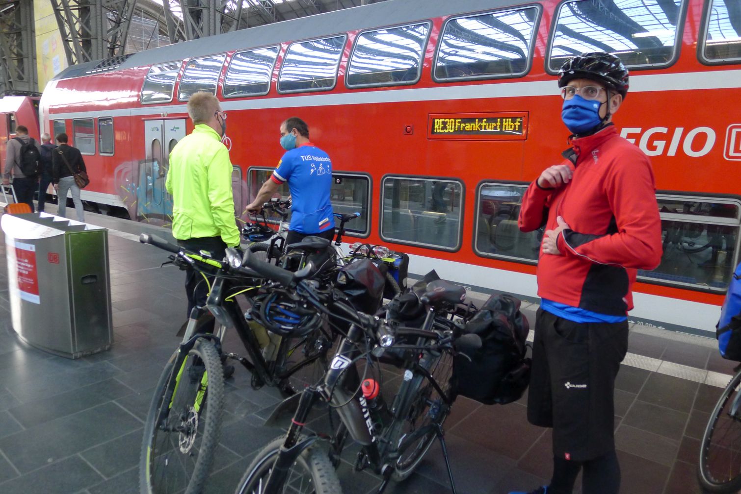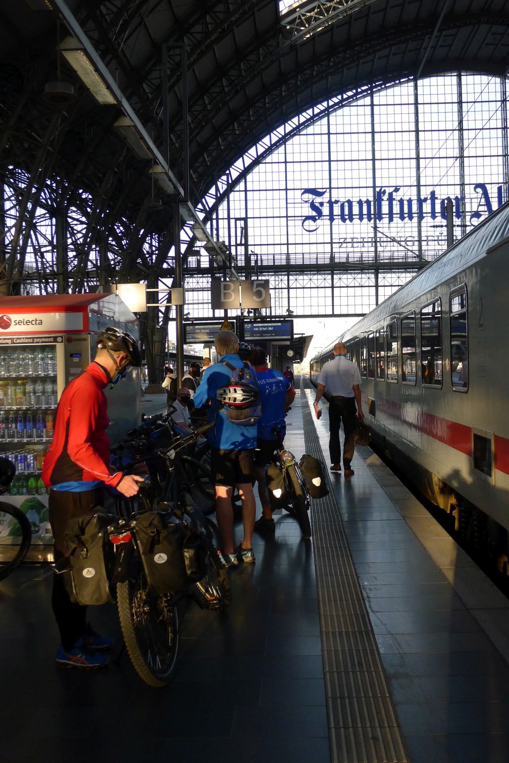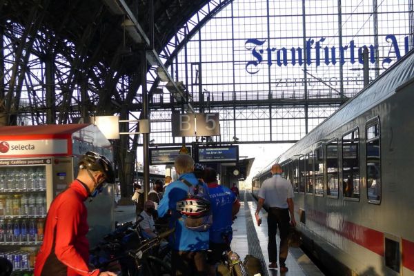 6:20 Uhr: Ankunft in Frankfurt, wir positionieren uns mit den Rädern am Bahnsteig, während Klaus unterwegs zum Infoschalter ist. Da kommt auch schon die Zugführerin auf uns zu und fragt „Sie sind angemeldete Radgruppe ? ich weiss noch nicht genau wie, aber ich nehme sie alle mit“.