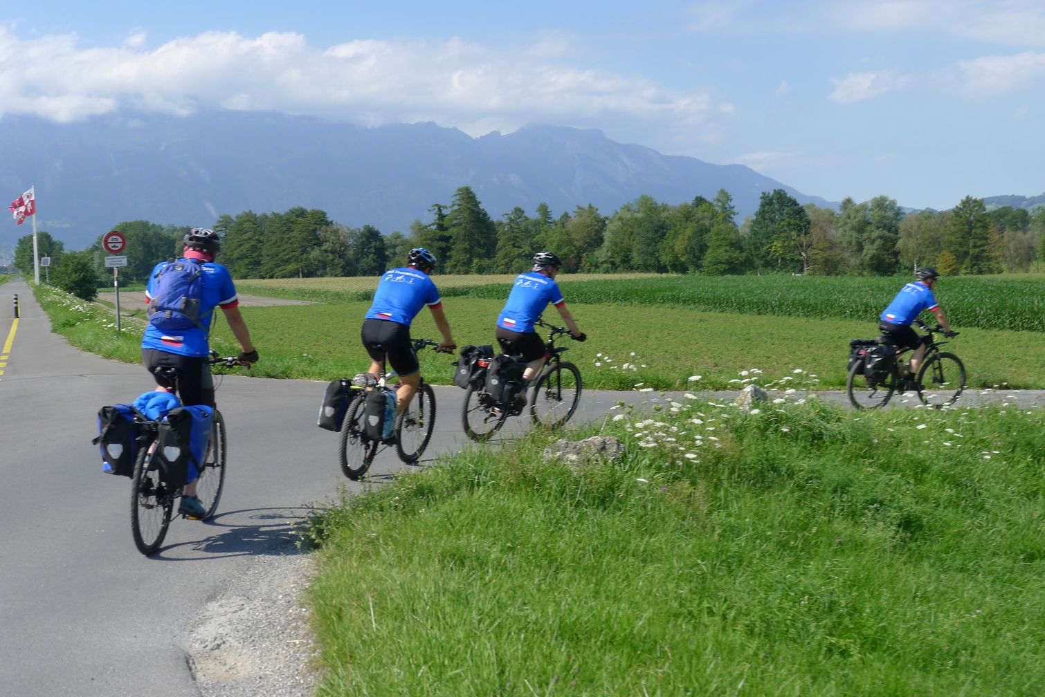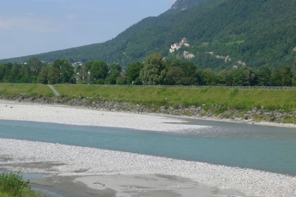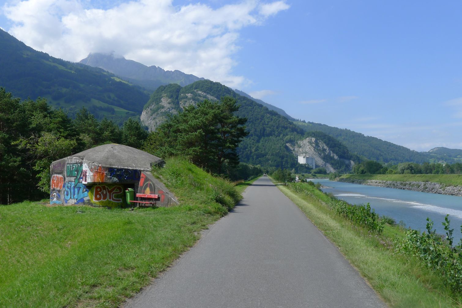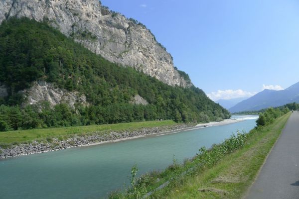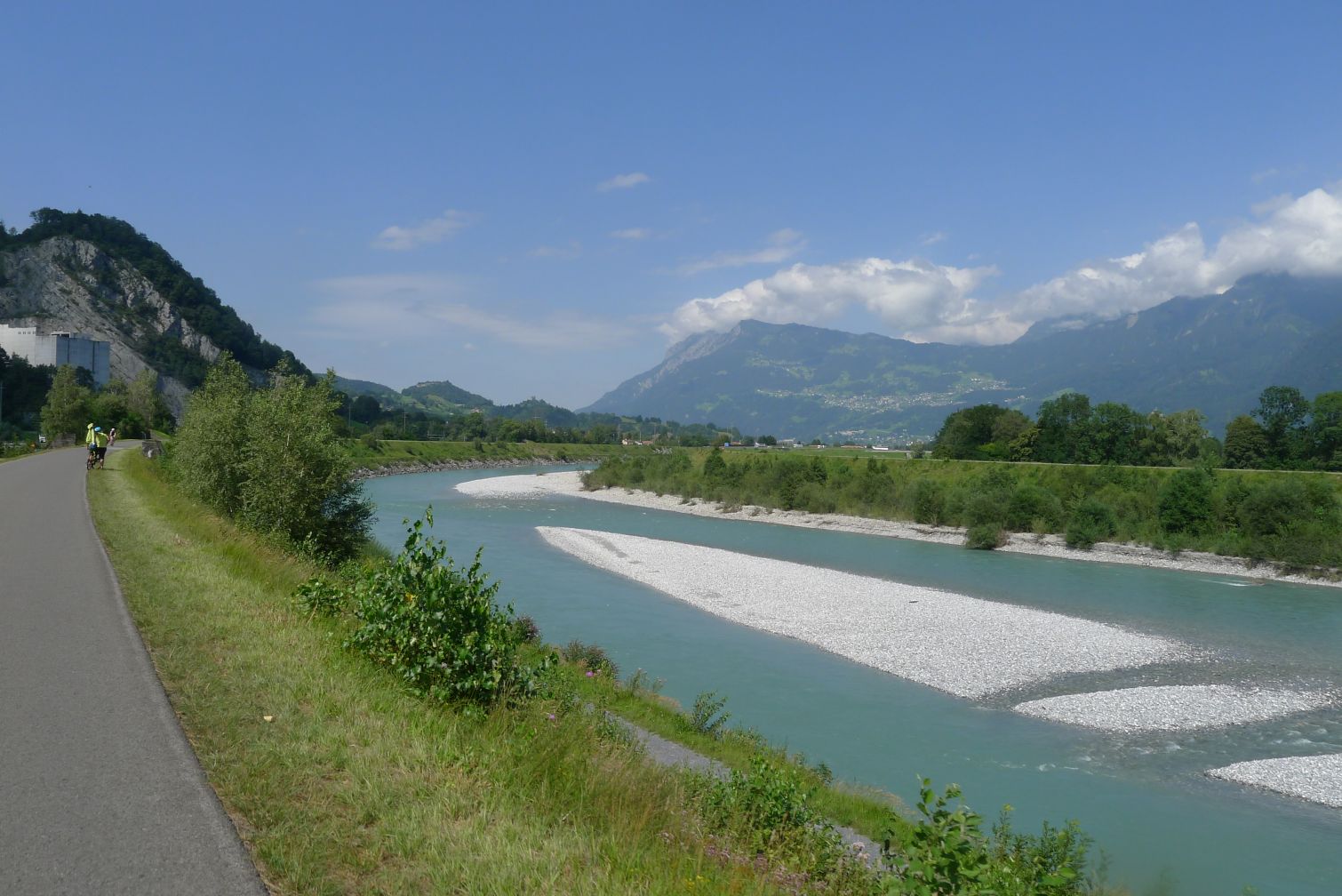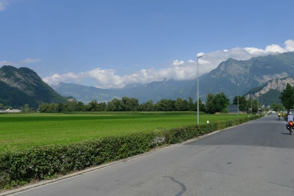15:21 Uhr: Ankunft in Sargans mit gut einstündiger Verspätung. Die Sonne brennt vom Himmel, wir legen Sonnencreme auf und fahren los. Durch Felder und Wiesen geht es auf den Rhein zu, vor uns erhebt sich der markante Gipfel des Ellhorn, was für ein Panorama…. Der Rheindamm ist erreicht. Grünblau leuchtet das Wasser, wir folgen dem Fluss abwärts nach Norden. Nur der Wind bläst uns unaufhörlich ins Gesicht.