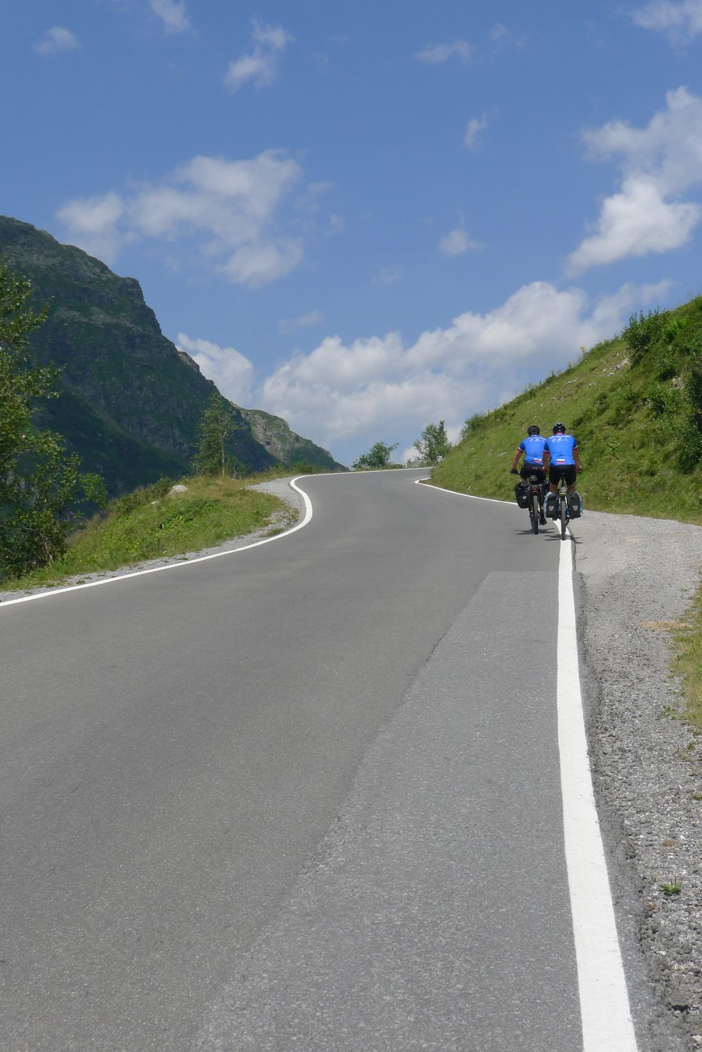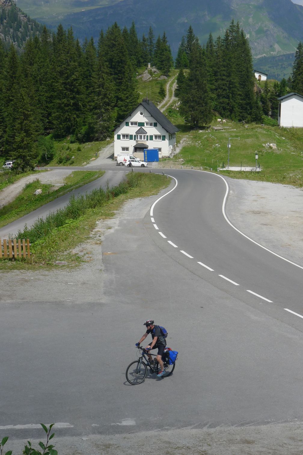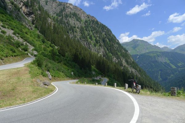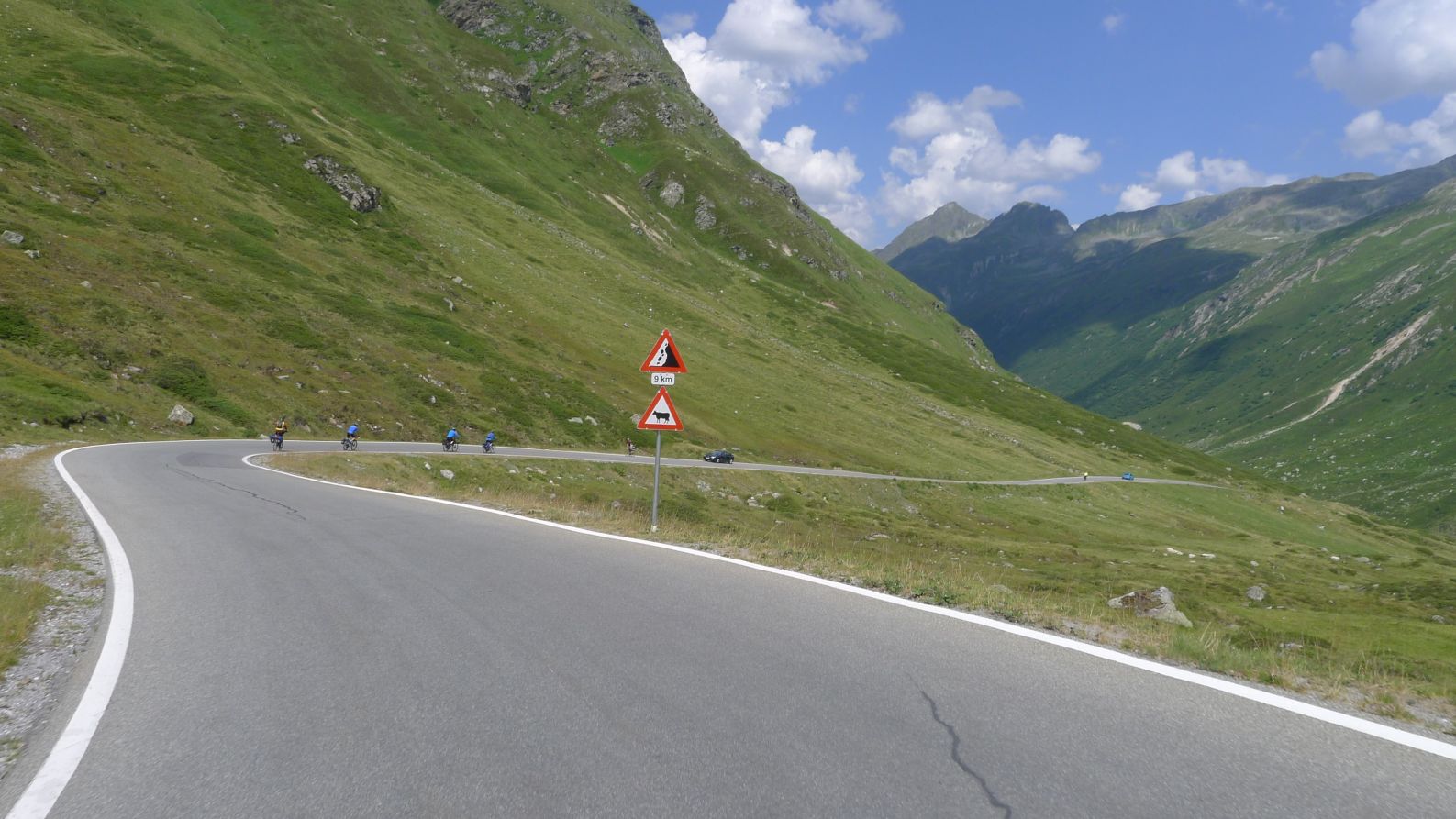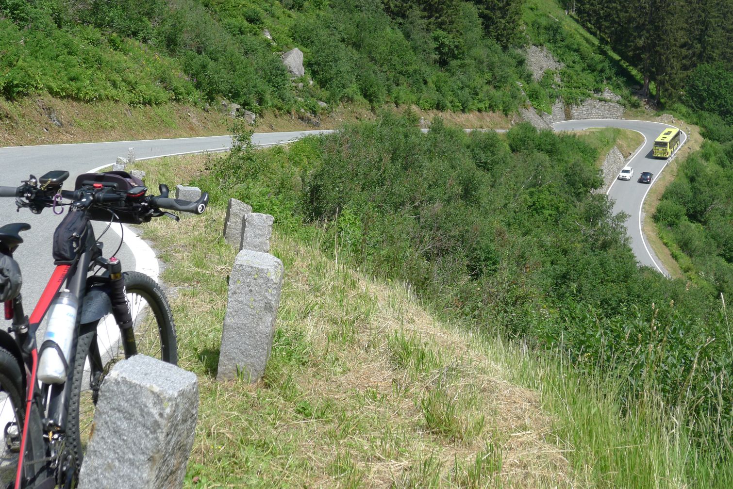 10:54 Uhr: kurz hinter Partenen erreichen wir den Einstieg der Silvretta Hochalpenstraße. Über 31 Kehren auf 15km Länge windet sich der Anstieg hinauf auf die Bieler Höhe. 980 Höhenmeter erscheinen erstmal nicht allzuviel, aber die Rampen zwischen den Kehren sind mit 9-12% recht steil, die Kehren selbst eng und bieten wenig Zeit zur Erholung. Hinzu kommen Temperaturen von 30°C und das Gewicht des Gepäcks am Rad oder auf dem Rücken.