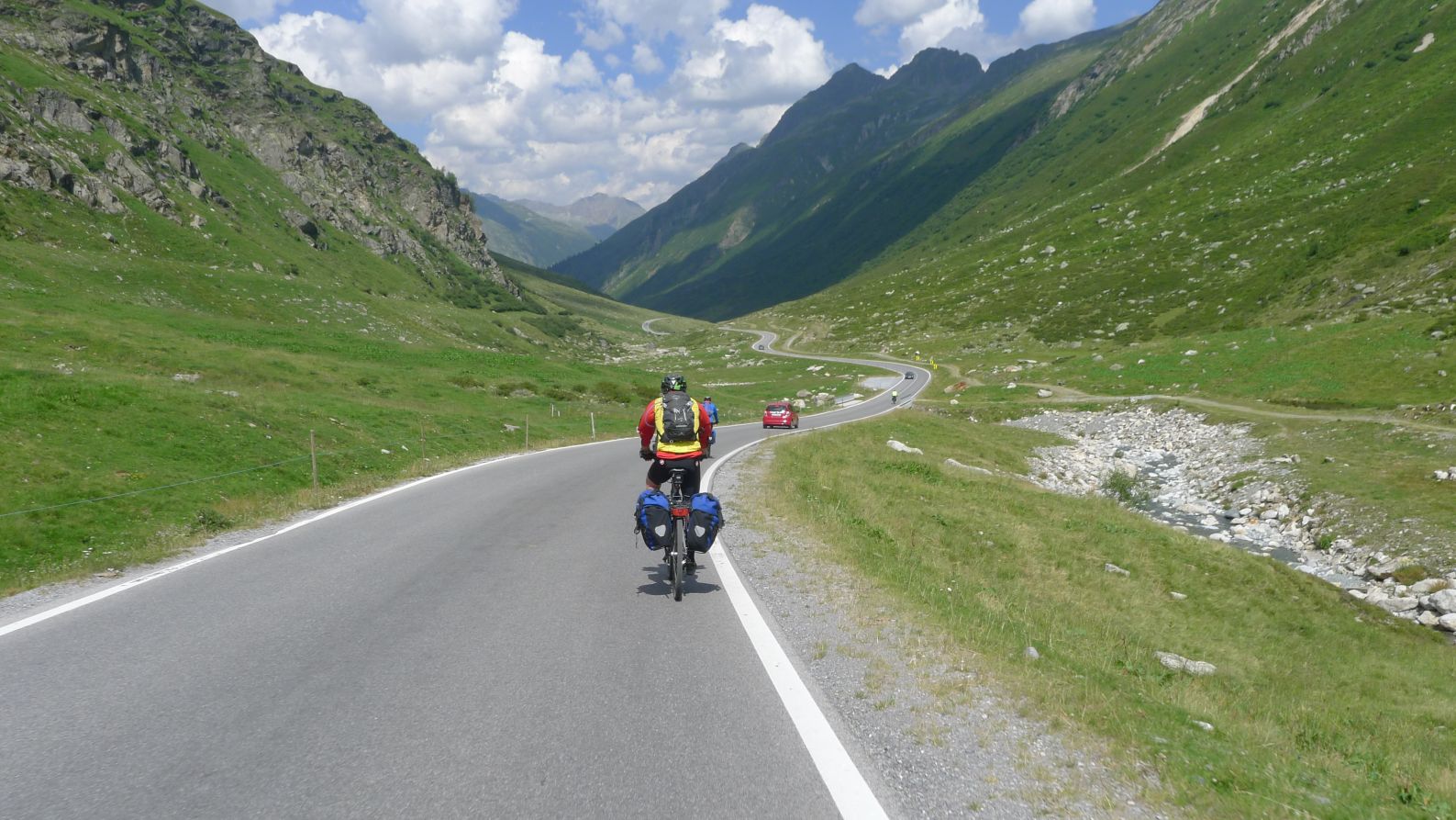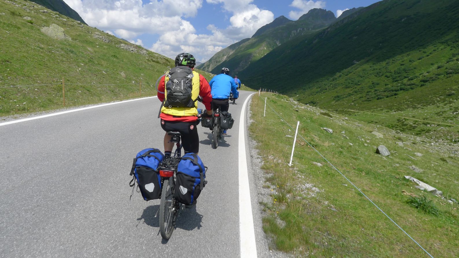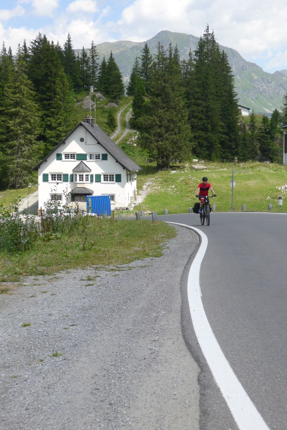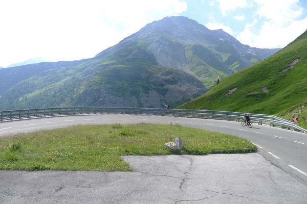 10:54 Uhr: kurz hinter Partenen erreichen wir den Einstieg der Silvretta Hochalpenstraße. Über 31 Kehren auf 15km Länge windet sich der Anstieg hinauf auf die Bieler Höhe. 980 Höhenmeter erscheinen erstmal nicht allzuviel, aber die Rampen zwischen den Kehren sind mit 9-12% recht steil, die Kehren selbst eng und bieten wenig Zeit zur Erholung. Hinzu kommen Temperaturen von 30°C und das Gewicht des Gepäcks am Rad oder auf dem Rücken.