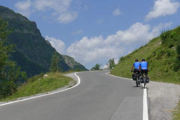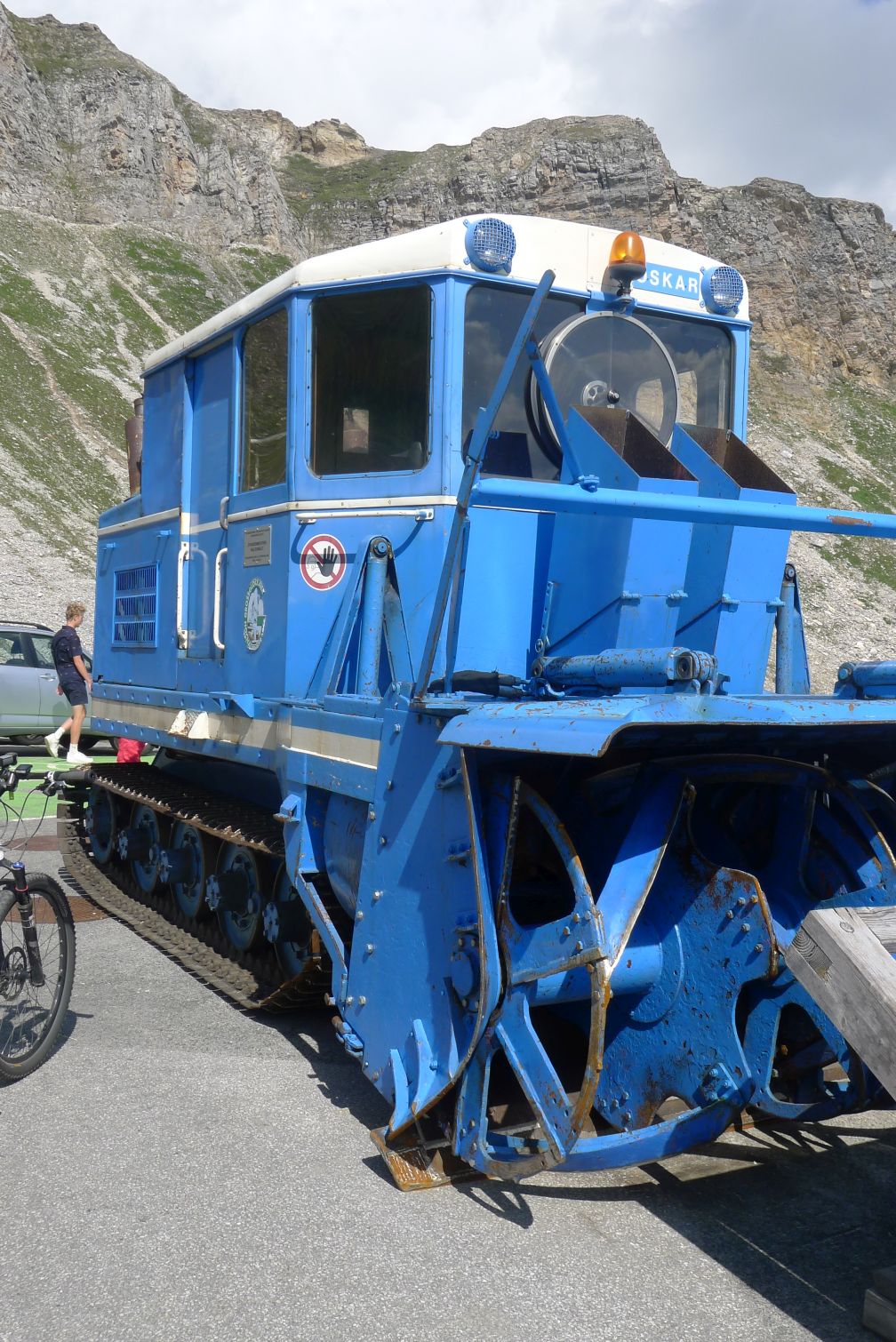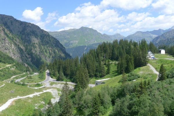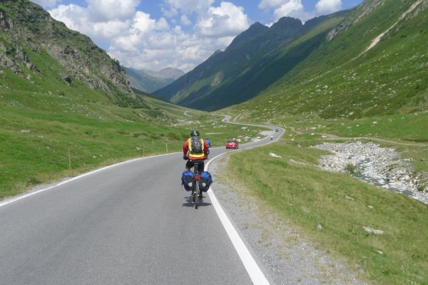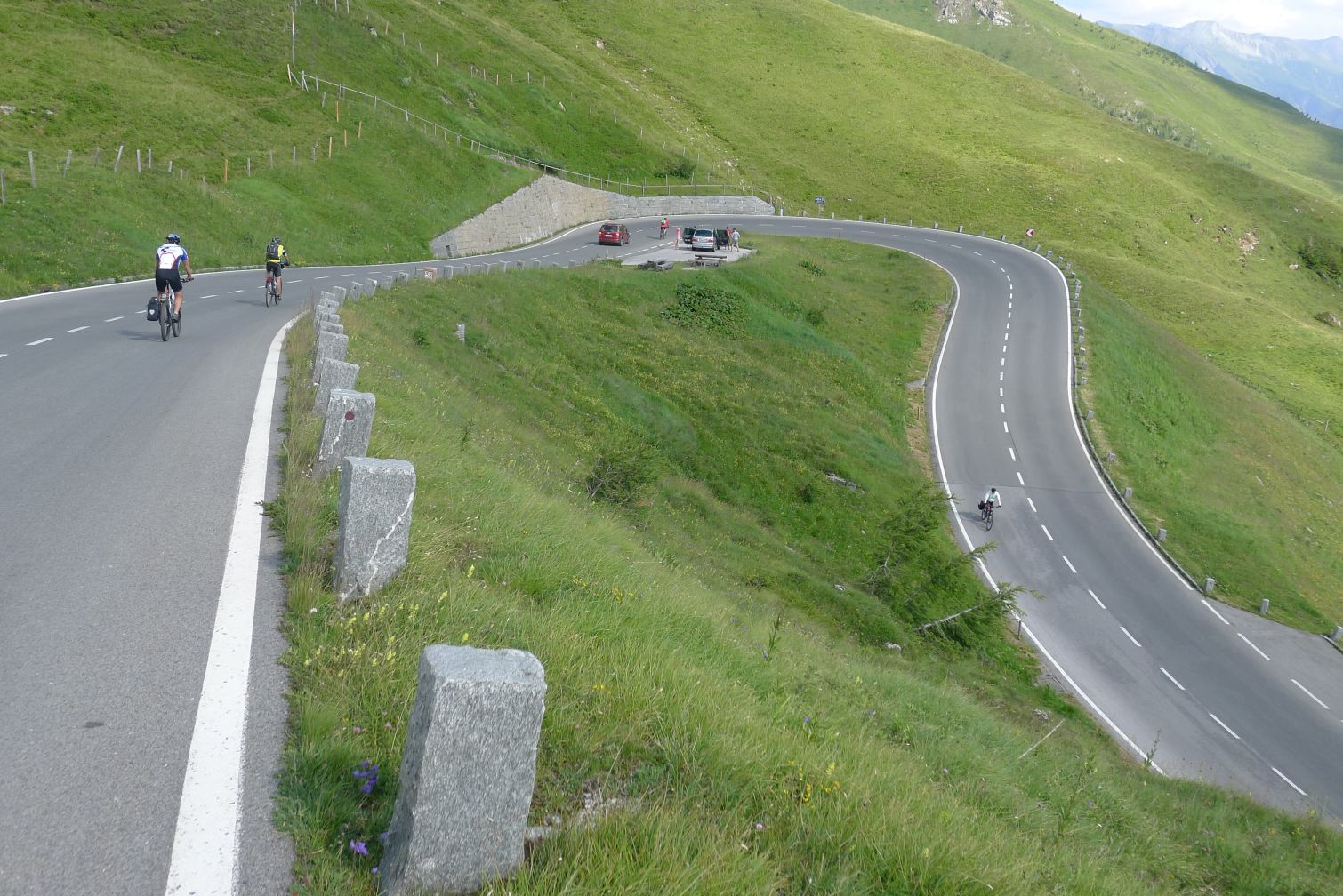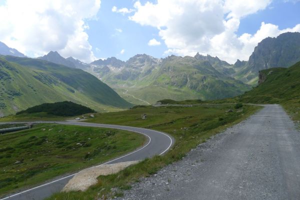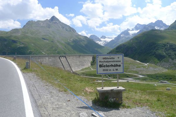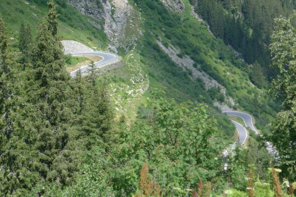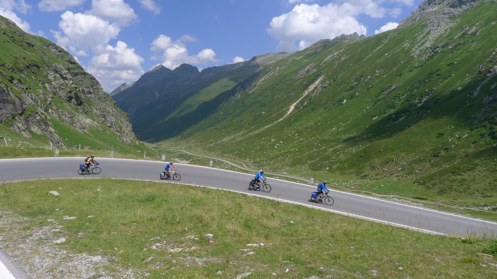 10:54 Uhr: kurz hinter Partenen erreichen wir den Einstieg der Silvretta Hochalpenstraße. Über 31 Kehren auf 15km Länge windet sich der Anstieg hinauf auf die Bieler Höhe. 980 Höhenmeter erscheinen erstmal nicht allzuviel, aber die Rampen zwischen den Kehren sind mit 9-12% recht steil, die Kehren selbst eng und bieten wenig Zeit zur Erholung. Hinzu kommen Temperaturen von 30°C und das Gewicht des Gepäcks am Rad oder auf dem Rücken.