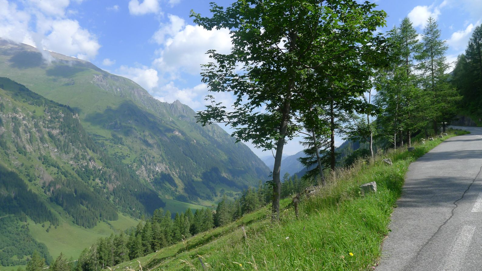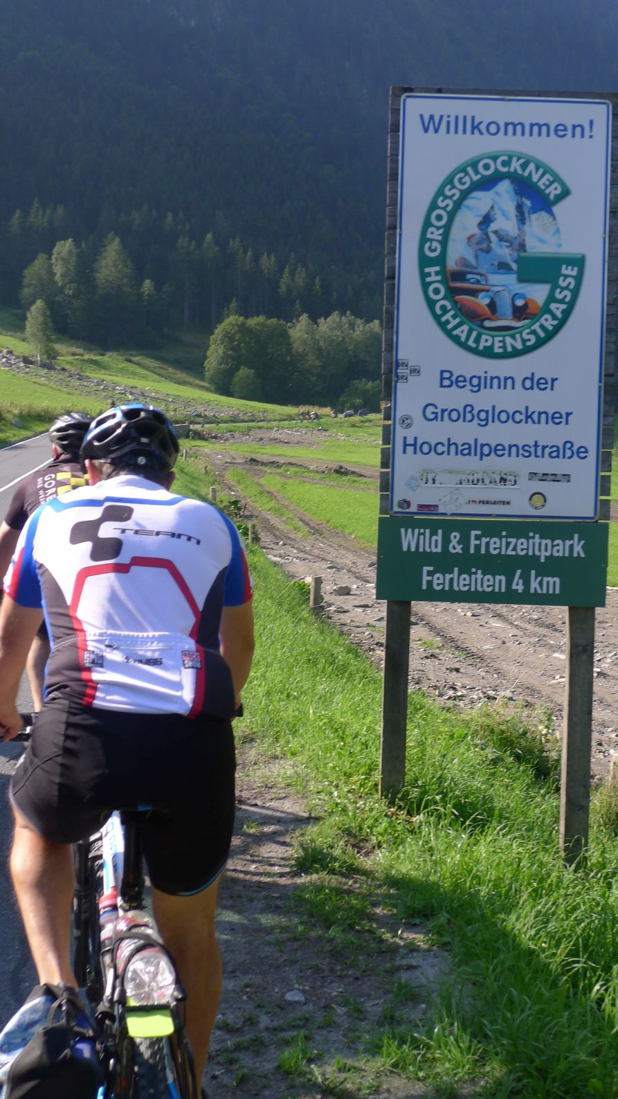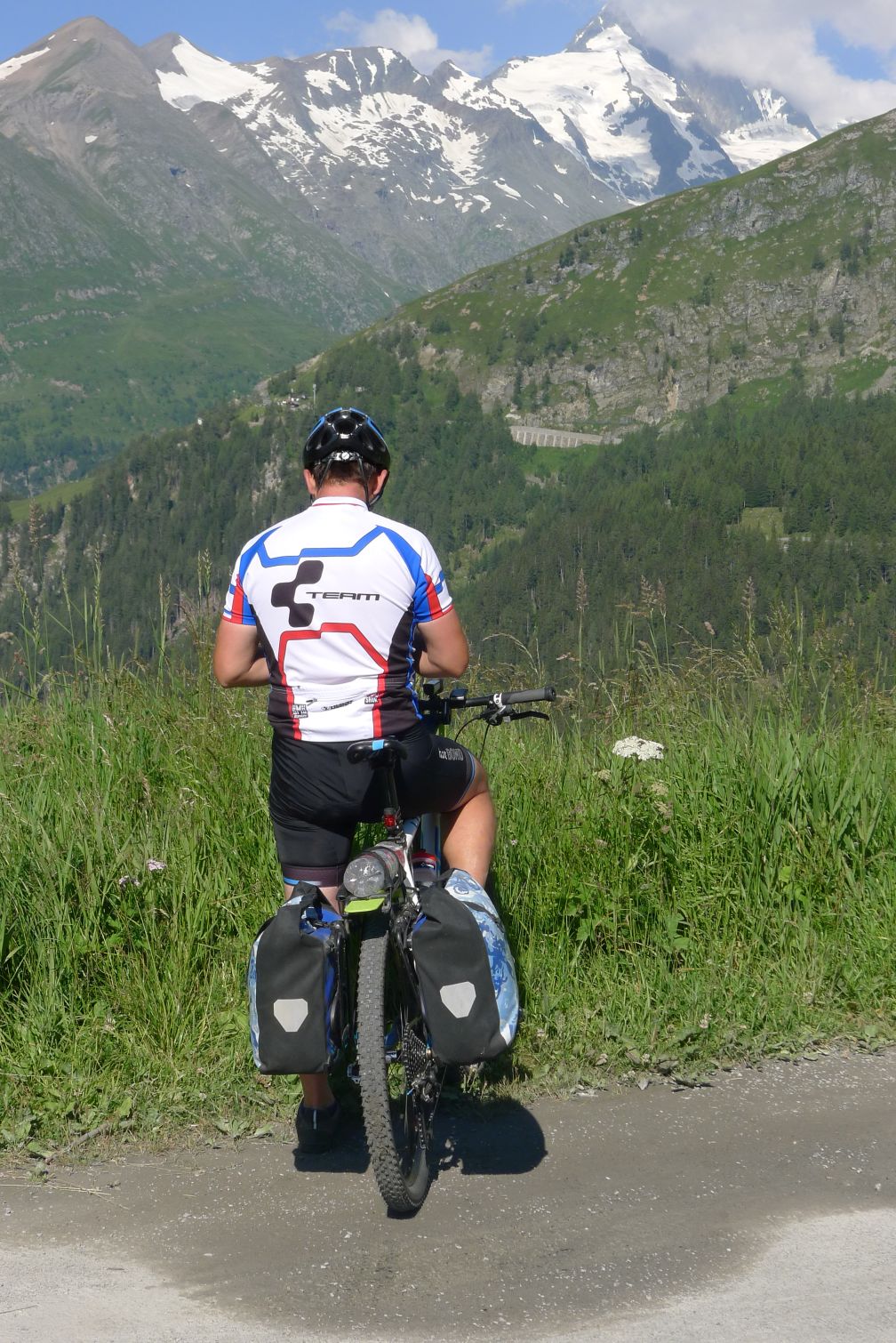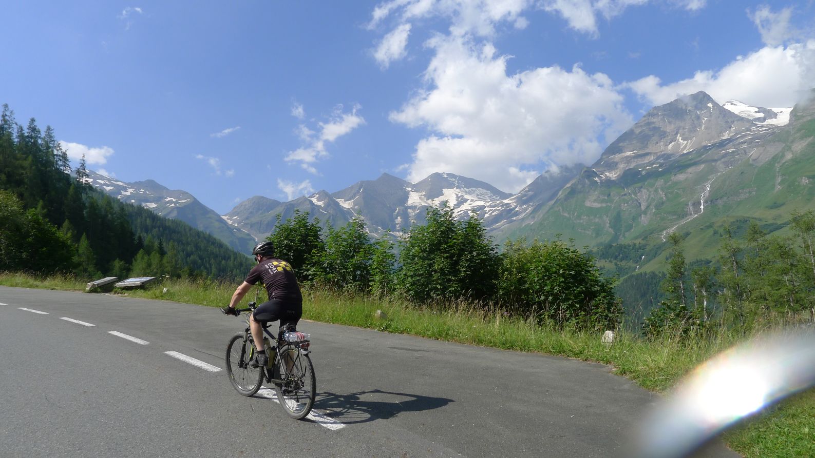9:20 Uhr: Start zur 4. Etappe. Nach einem Foto vorm Großglockner begeben wir uns auf eine 8,5km lange Abfahrt. Kurz vor Heiligenblut zweigen wir von der Bundesstraße auf eine kleine Seitenstraße ab und fahren auf einem Höhenweg mit tollem Ausblick ins Tal weiter bergab. Hier und da geht es auch mal wieder bergauf, aber dafür entgehen wir dem Verkehr auf der Großglocknerstraße.
