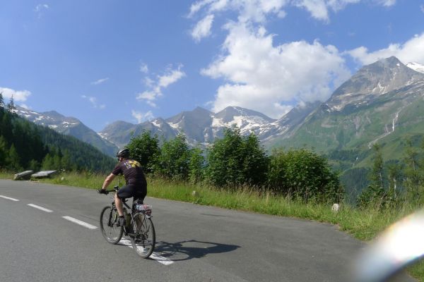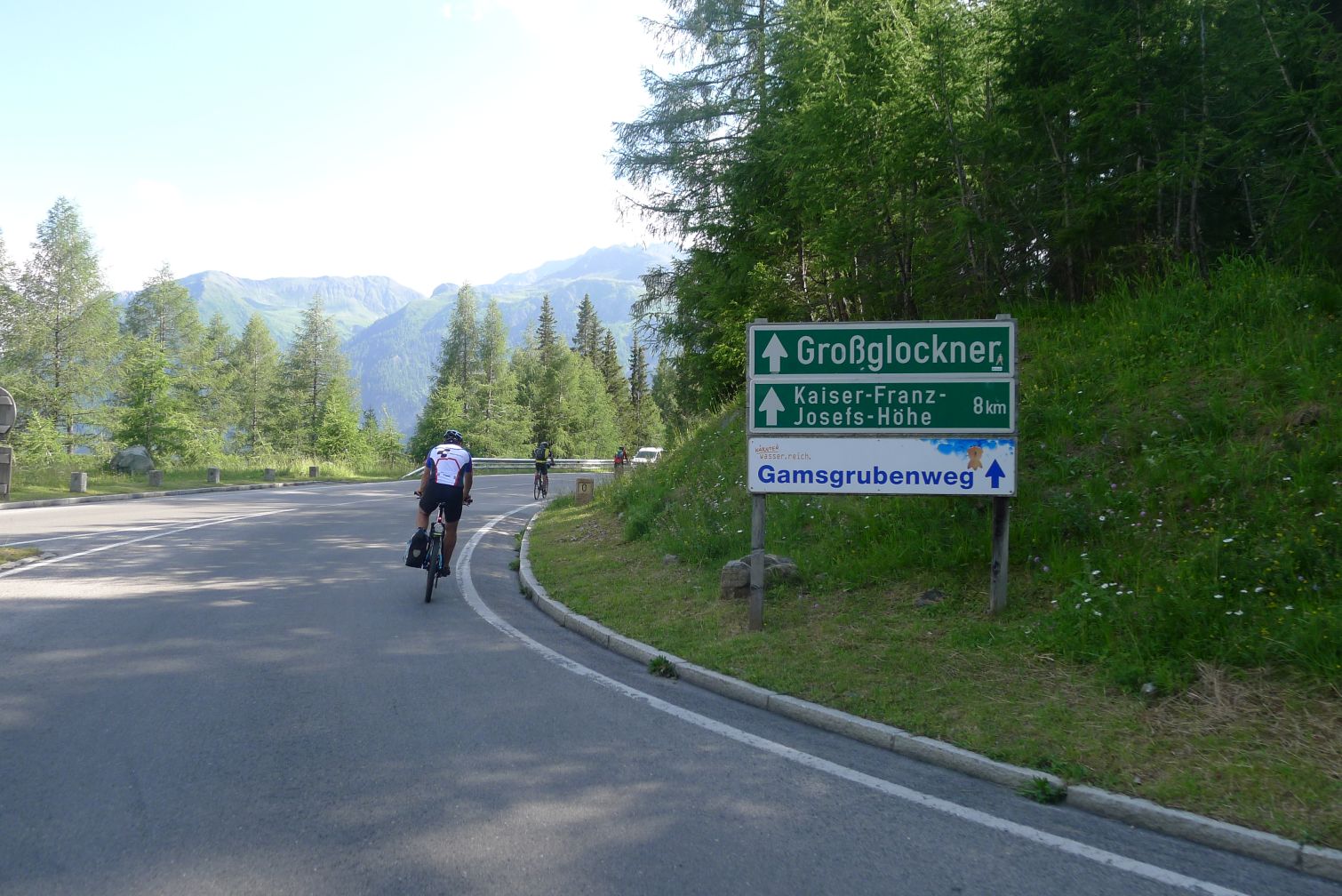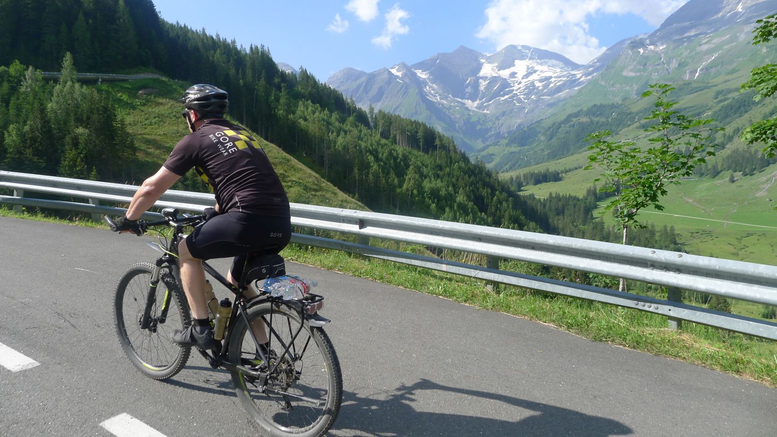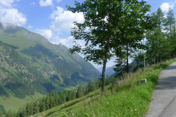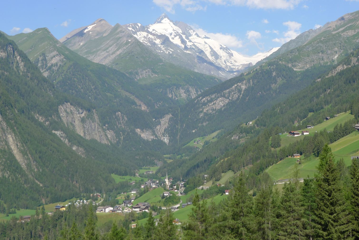 9:20 Uhr: Start zur 4. Etappe. Nach einem Foto vorm Großglockner begeben wir uns auf eine 8,5km lange Abfahrt. Kurz vor Heiligenblut zweigen wir von der Bundesstraße auf eine kleine Seitenstraße ab und fahren auf einem Höhenweg mit tollem Ausblick ins Tal weiter bergab. Hier und da geht es auch mal wieder bergauf, aber dafür entgehen wir dem Verkehr auf der Großglocknerstraße.