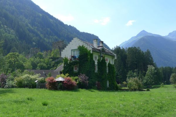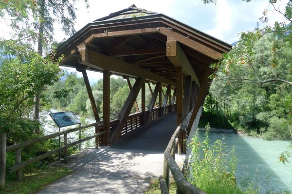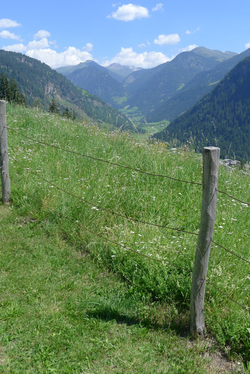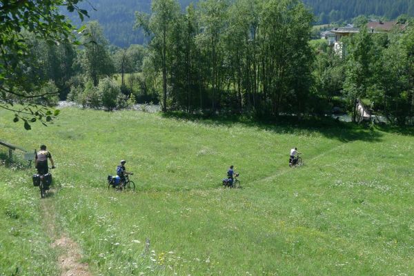 11:25 Uhr: kurz vor Winklern verpassen wir einen Abzweig und folgen weiter dem Großglockner Radweg der Möll entlang. Da die nächste Straßenbrücke zu weit entfernt ist, wir aber auch nicht wieder zurück fahren wollen, entschieden wir uns dem Schild „Fußweg nach Winklern“ zu folgen. Wir stehen mitten in einem Garten mit angrenzendem Campingplatz und versichern uns bei dem einzigen Campinggast, dass wir auf dem richtigen Weg sind. Sind wir, durch Wiesen und über eine wackelige Hängebrücke überqueren wir die Möll und erreichen Winklern.
