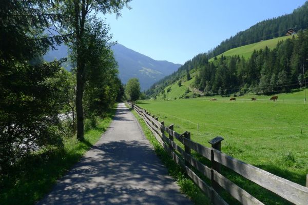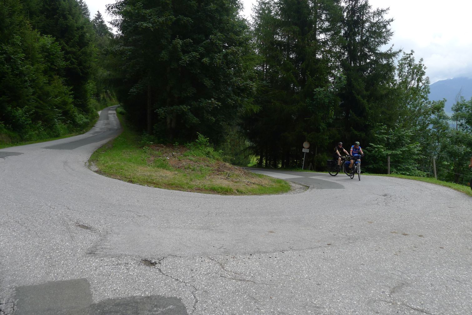 12:20 Uhr: Nach einem Stück entlang der Salzach ist der tiefste Punkt erreicht und der nächste Anstieg mit 500 Höhenmetern zum Pass Thurn steht vor uns. Da wir nicht die Bundesstraße von Mittersill mit gemütlichen 5% genommen haben, sondern eine Abkürzung, wird es wieder steil. Über einen Güterweg mit 9-11% geht es nach oben. Dafür ist der Weg so gut wie autofrei, und nachdem die Bundesstraße erreicht ist wird es auch wieder flacher.