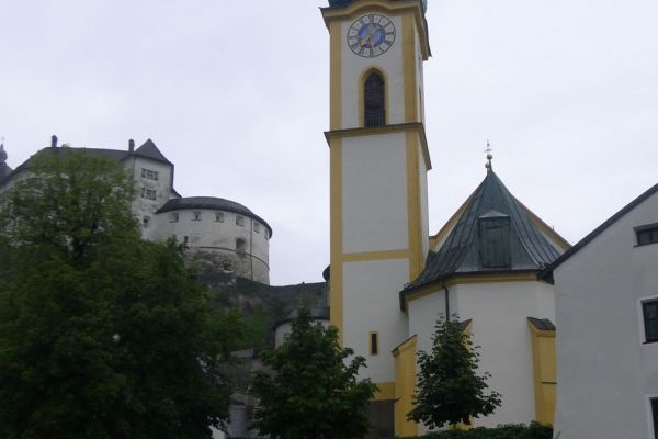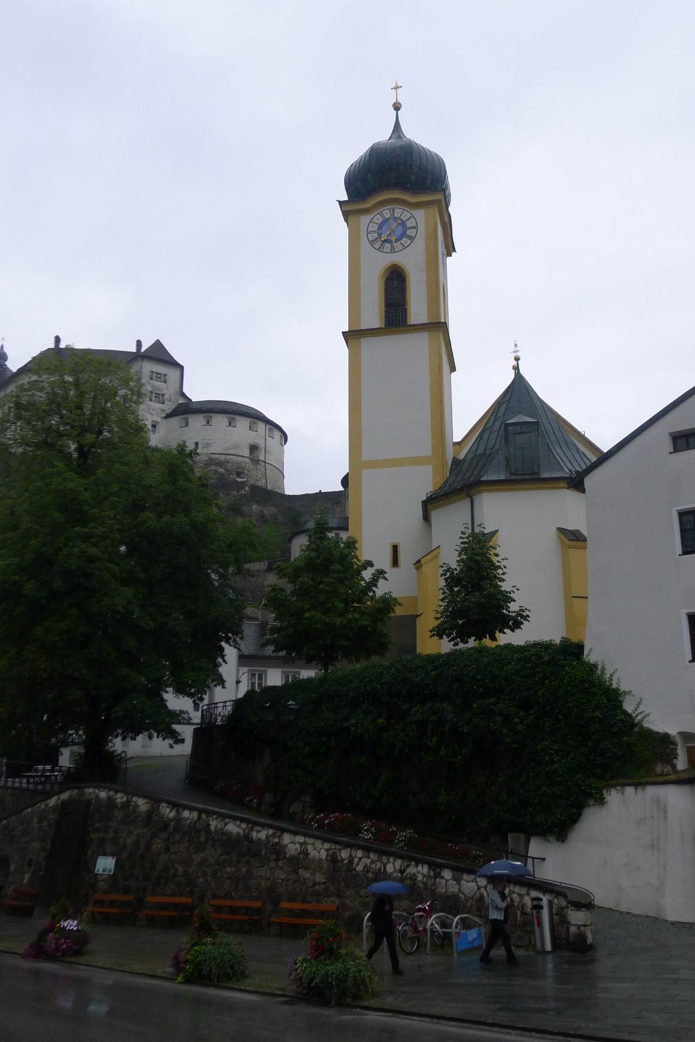 17:58 Uhr: 16 km vor dem Ziel in Höhe von Scheffau kramen wir die Regenjacken wieder raus. Über einen schönen Radweg geht es auf und ab in Richtung Kufstein. Nach einer knappen Stunde kommt die Festung in den Blick.