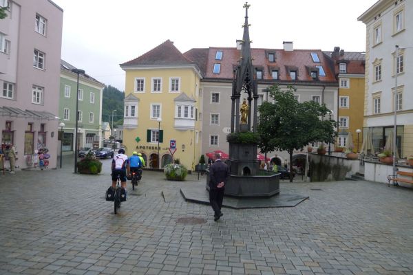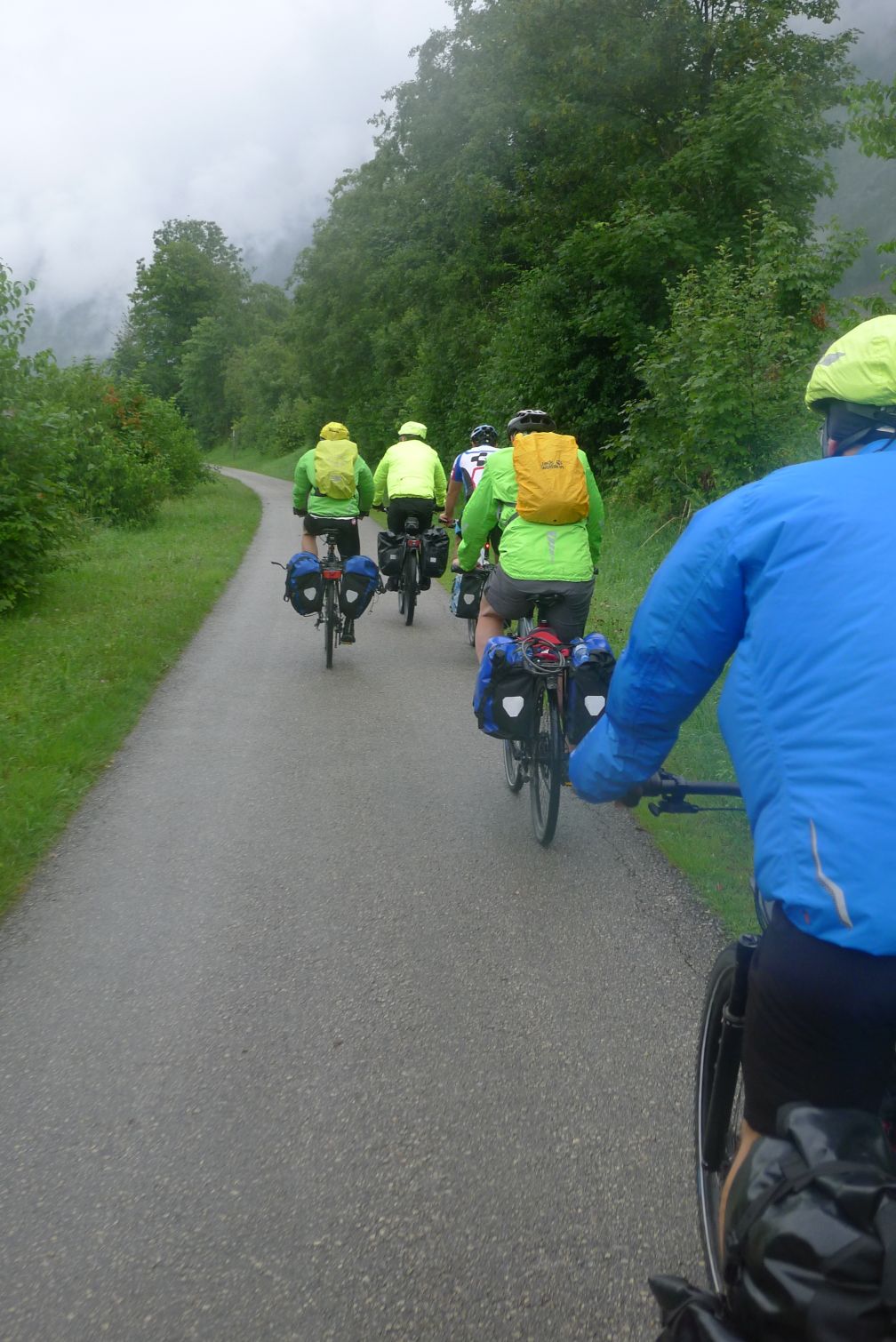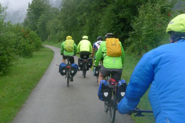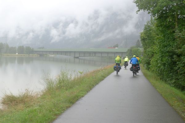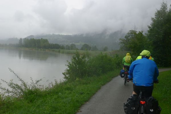 9:36 Uhr: Abfahrt zur letzten Etappe, gut 40km sind es auf dem Inntalradweg nach Rosenheim. Kurzzeitig hört es auf zu regnen, doch schon bald fallen die Tropfen wieder.