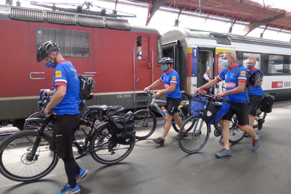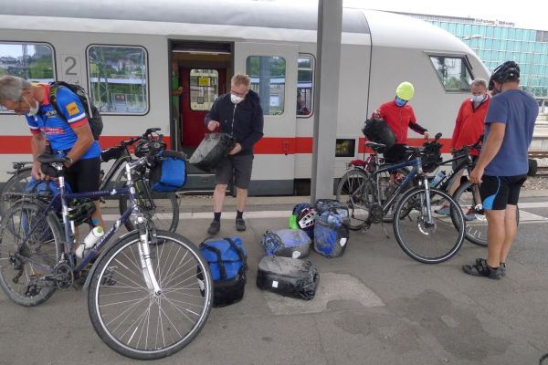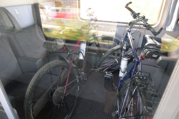 6:55 Uhr: Dank dem großartigen Engagement der Zugführerin stehen unsere Räder nun in der ersten Klasse, je zwei Räder pro Abteil. Der Corona-Abstand muss auch hier eingehalten werden….. Wir verlassen Frankfurt Richtung Stuttgart.