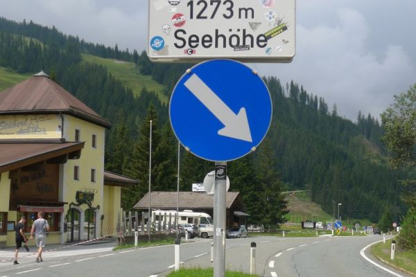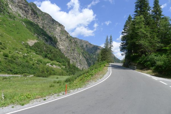 11:40 Uhr: Das Ortsende von Winklern ist erreicht, wir sind schon mitten drin im Anstieg zum Iselsbergpass. Nur 3,8km und 250 Höhenmeter, aber bei fast 40°C in der Sonne eine sehr schweisstreibende Angelegenheit.
