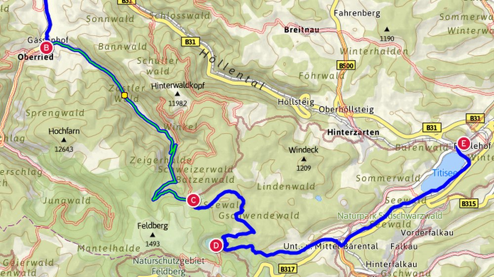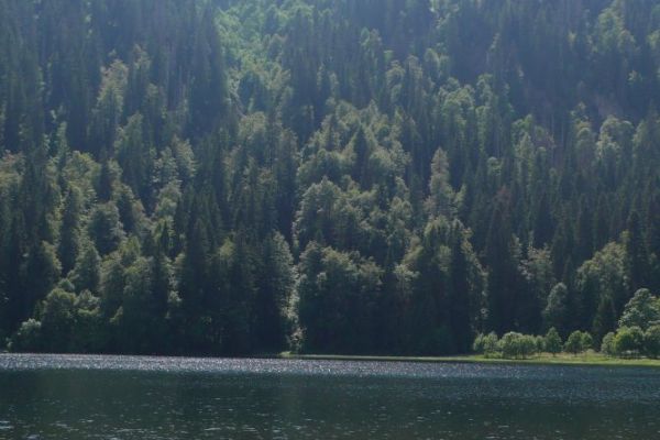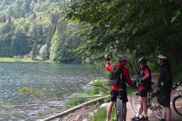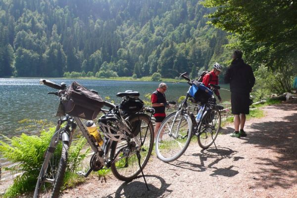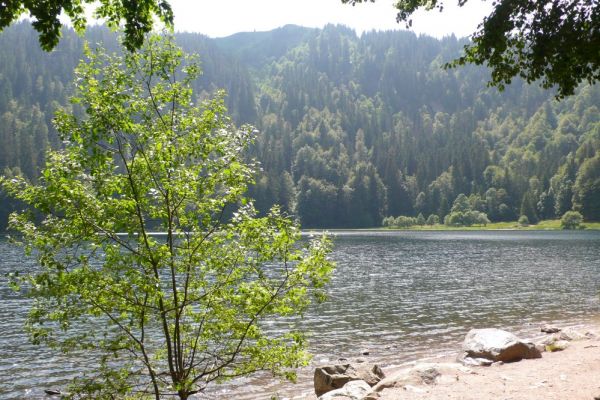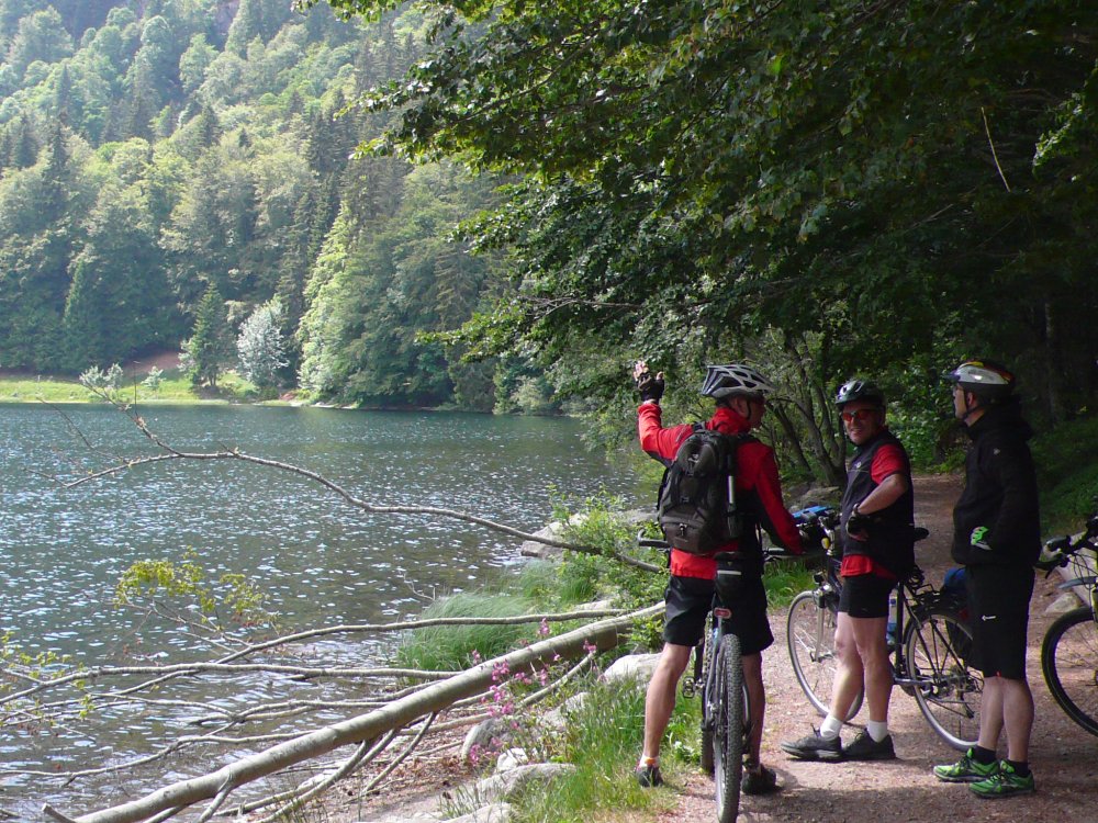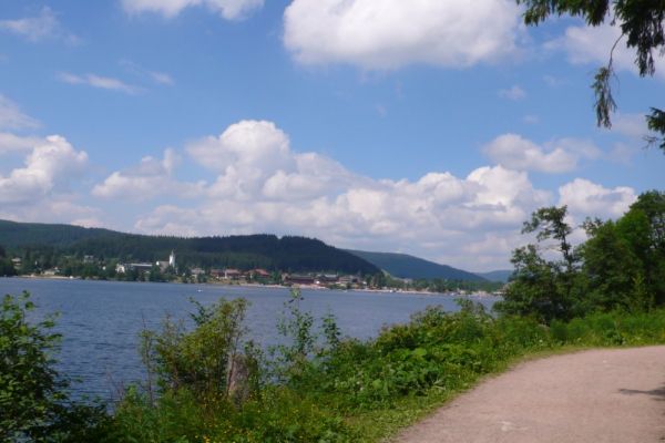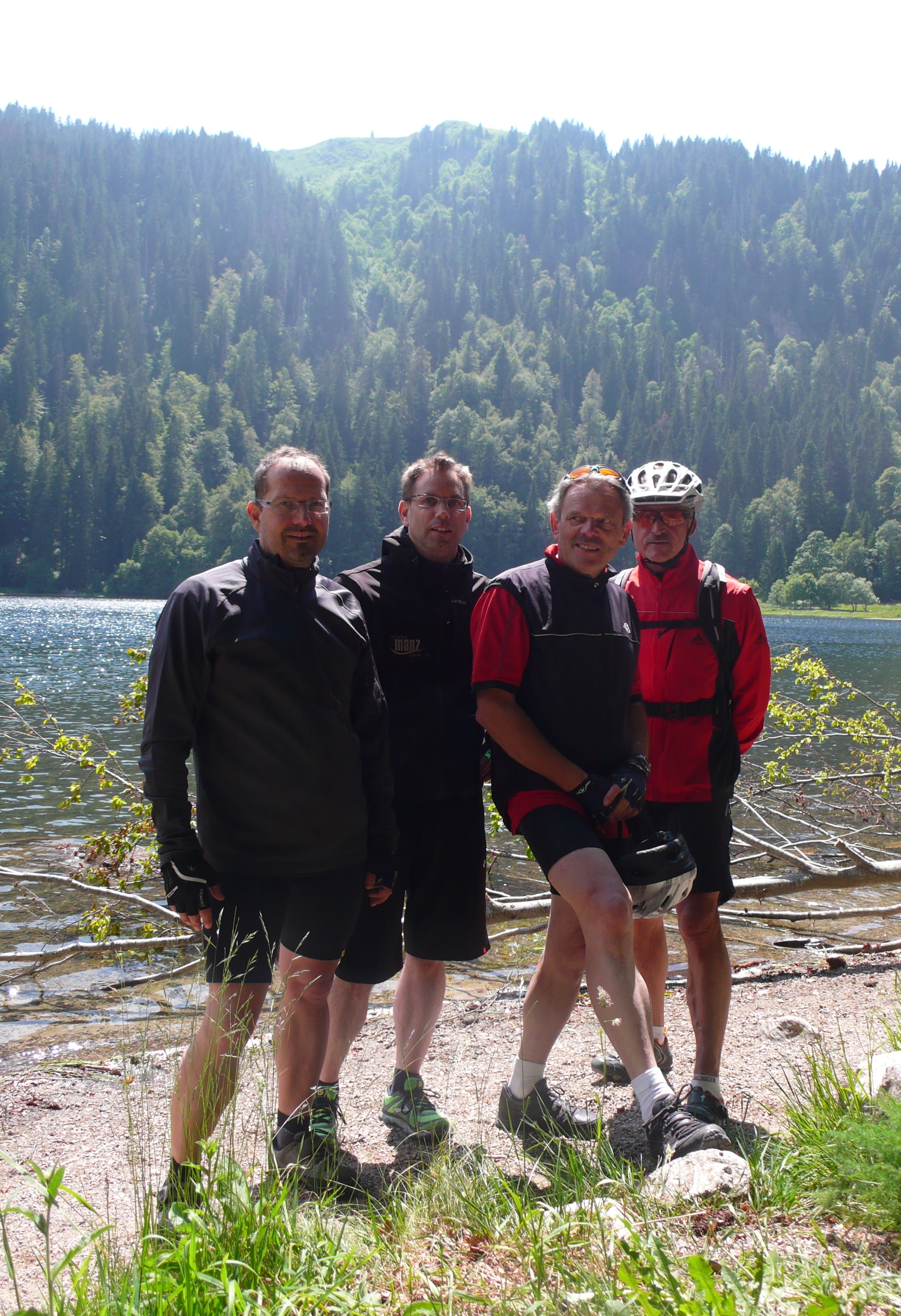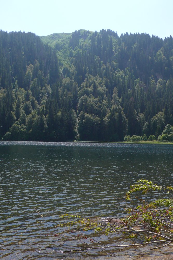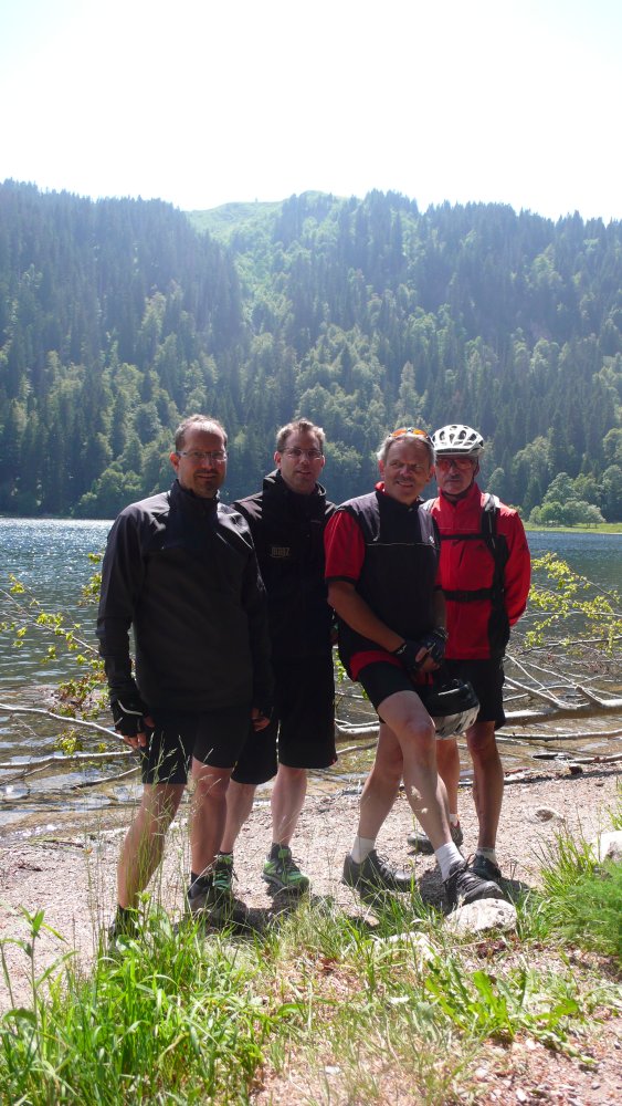 Stattdessen haben wir noch einen Abstecher zum Feldsee gemacht, der auf 1100m Höhe idyllisch an einer steilen Felswand unterhalb des Gipfels liegt. Während der letzten Eiszeit wurde vom Feldberggletscher ein fast kreisrunder Karsee in den Gneisfelsen gegraben. Auf diesen landschaftlichen Höhepunkt der Tour folgte eine lange Abfahrt hinunter zum Titisee.