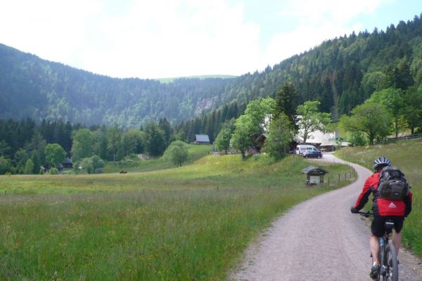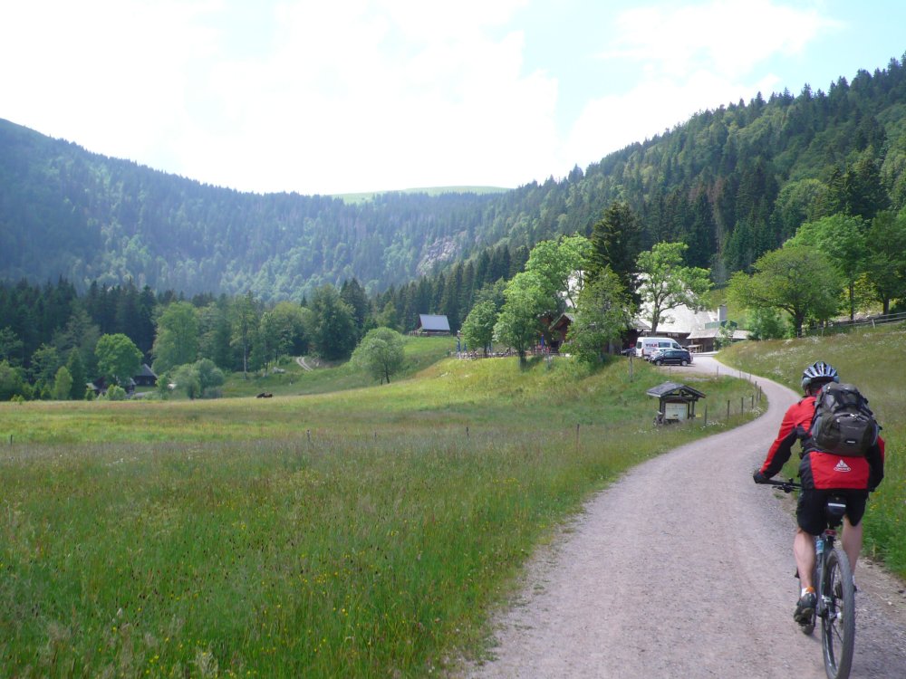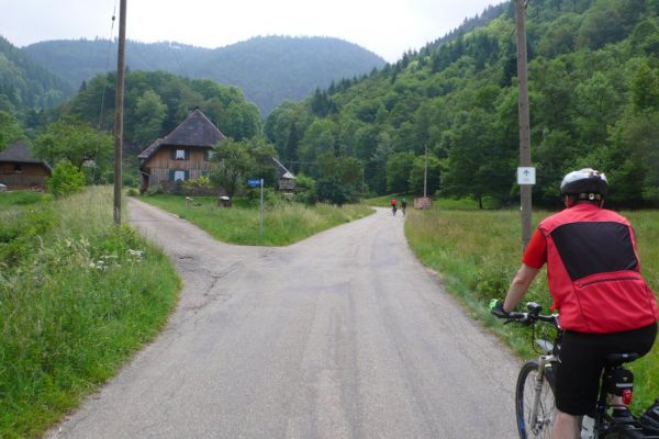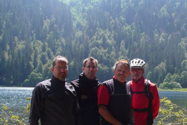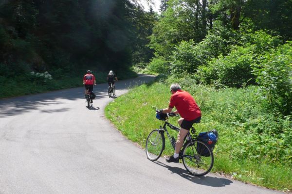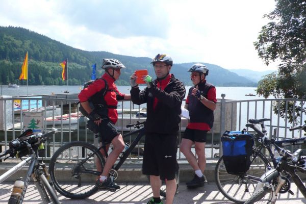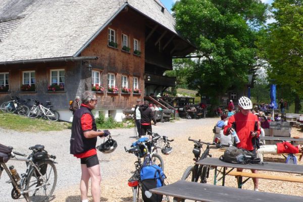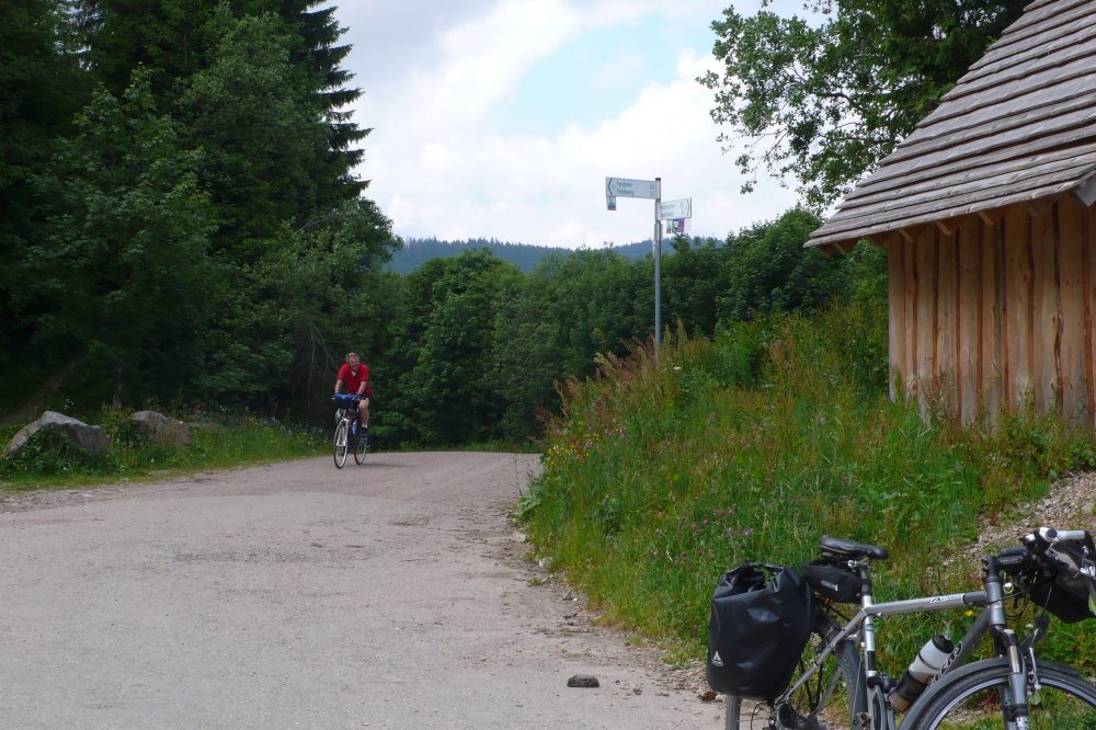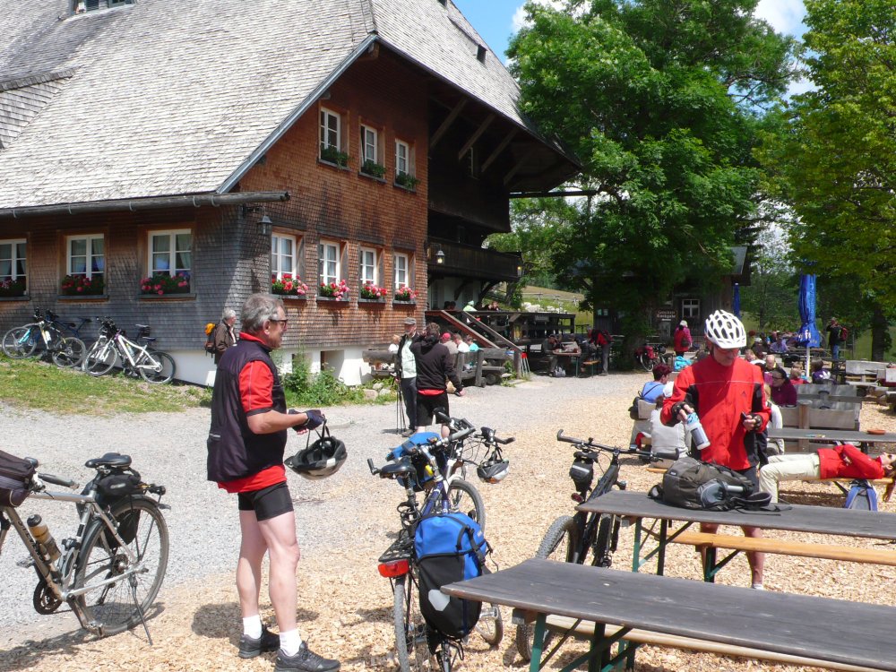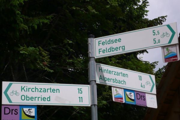 In diesem Jahr führt die Radwanderung des TUS entlang des Südschwarzwald-Radweges mit Start und Ziel in Freiburg. Der Etappenabschnitt von Kirchzarten nach Hinterzarten an den Fuss des Feldberges wird dann mit der Höllentalbahn zurückgelegt werden, da die lange Steigungsstrecke nicht in den Etappenplan passt. Ein Grund also diesen Streckenabschnitt im Rahmen einer Vortour zu befahren. So haben sich dann mit Klaus Friedrich, Edwin Burda, Andreas Knorz, Ortwin Schneider und Clemens Ruppert fünf Bergspezialisten gefunden, um die Feldbergexpedition in Angriff zu nehmen. Nach wochenlangen Planungen waren passende Zugverbindungen gefunden und am Freitag den 20. Juni, dem Brückentag nach Fronleichnam, konnte es losgehen. Um 5:15 war Abfahrt in Vollnkirchen mit lockerem Einrollen zum Bahnhof nach Gießen. Nach Ankunft in Freiburg hieß es dann erstmal sich den Weg durch die quirlige Altstadt zu bahnen und den Einstieg zum Südschwarzwald-Radweg zu finden. Der führte zunächst auf einer breiten Fahrradstrasse entlang der Dreisam nach Kirchzarten. Die noch wolkenverhangenen Gipfel des Feldbergmassivs waren schon zum Greifen nahe, doch noch führte die Strecke über flaches Terrain. Kurz hinter dem nächsten Ort Oberdieten begann es dann steiler zu werden. Nun folge ein 11km langer und schweißtreibender Abschnitt mit grösstenteils 10% Steigung. Besonders frustrierend war, dass es zwischendurch praktisch keine flacheren Abschnitte gab, um wieder Kräfte sammeln zu können. Stattdessen steile Rampen und Serpentinen hinauf auf 1196m Höhe, wo bei der Weggabelung Rinken auch gleichzeitig der höchste Punkt der Tour erreicht war. Gerne hätten wir von hier noch einen Abstecher zum 1493m hohen Feldberggipfel unternommen, zumal dieser nur 1,5km Luftlinie von uns entfernt lag. Im Hinblick auf unsere Zugverbindungen für die Rückfahrt und die weiteren 300 Höhenmeter, die hätten überwunden werden müssen, haben wir uns dafür entschieden die Gipfeltour auszulassen, auch wenn es den ein oder anderen schwer gewurmt hat. O-ton eines Mitfahrers (Name der Redaktion bekannt): „jetzt net ganz hoch fahr´n ist wie kurz vorm AB in die Hos´geschisse“