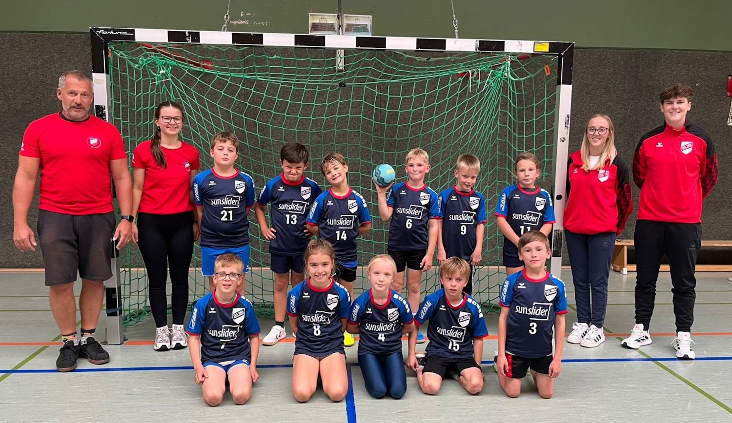 Obere Reihe v.l.: Trainer Jannik Droß, Emma Zajac, Leonie Mühlhans, Paulina Jolie Terre, Mila Novosel, Philine Perschel, Levi Henninger, Paul Krauß, Trainerin Sirka Burda
